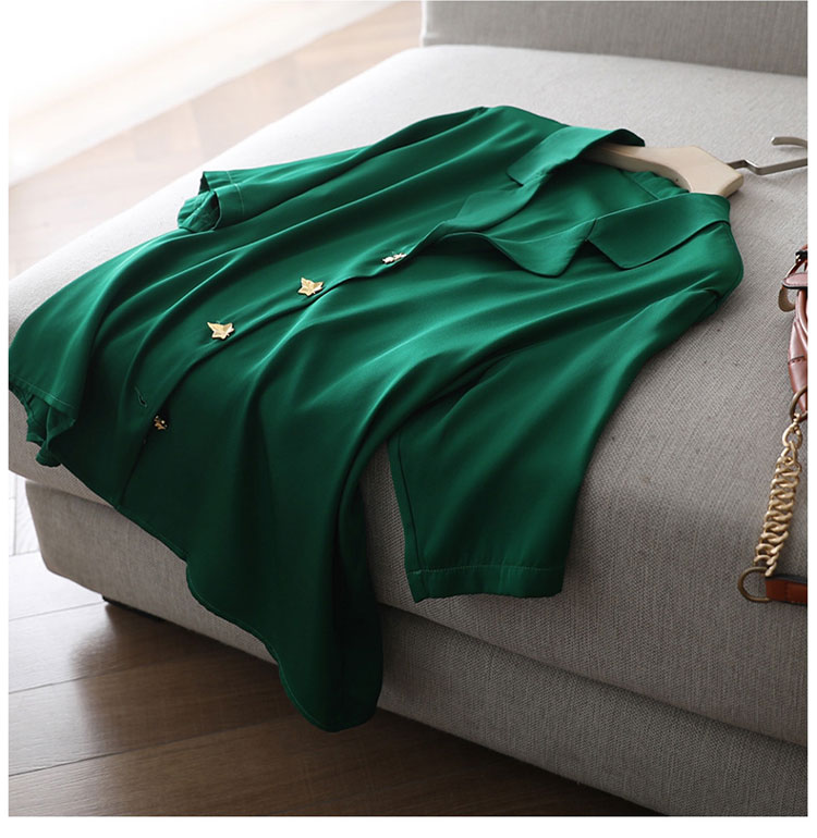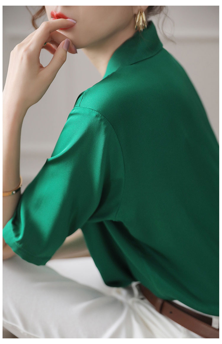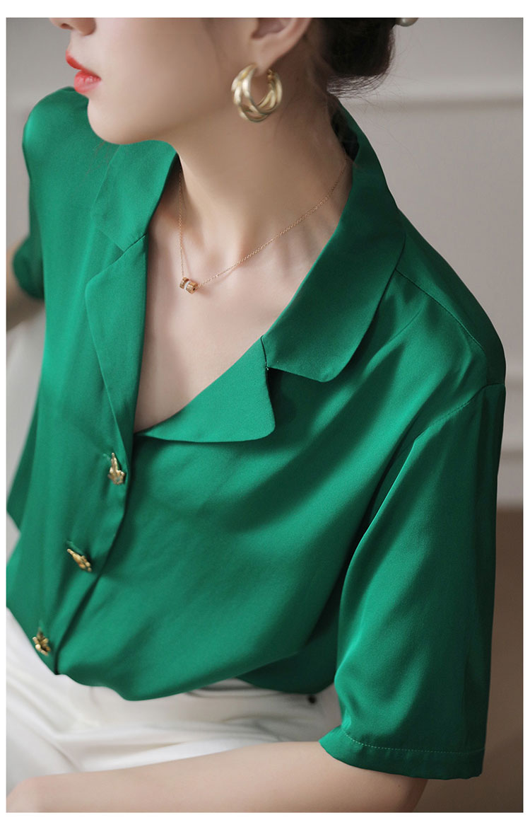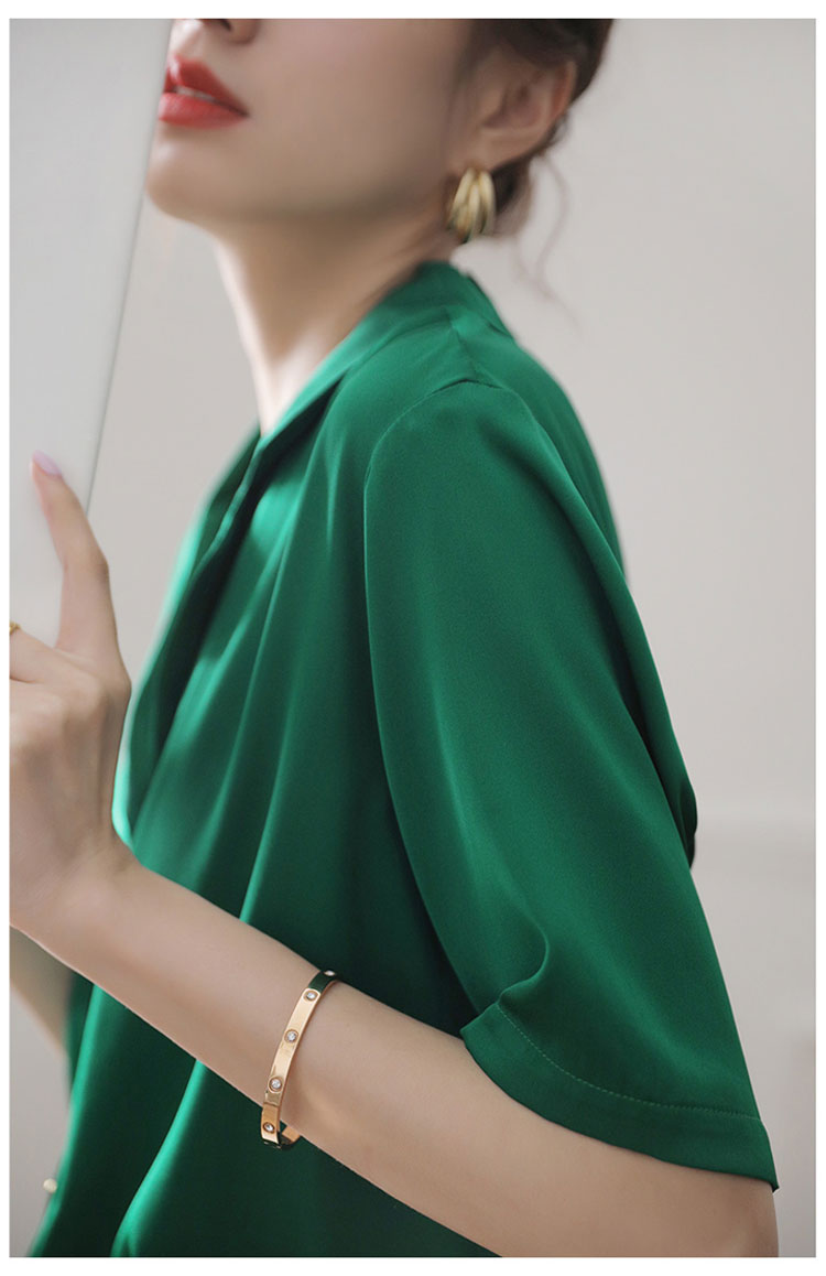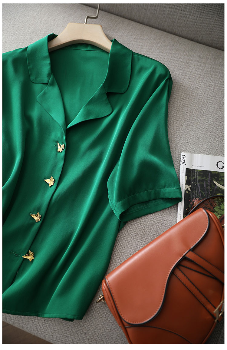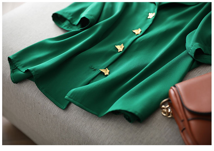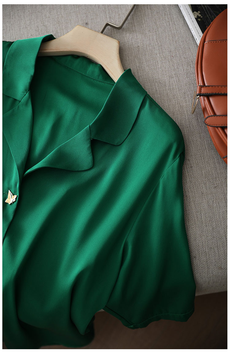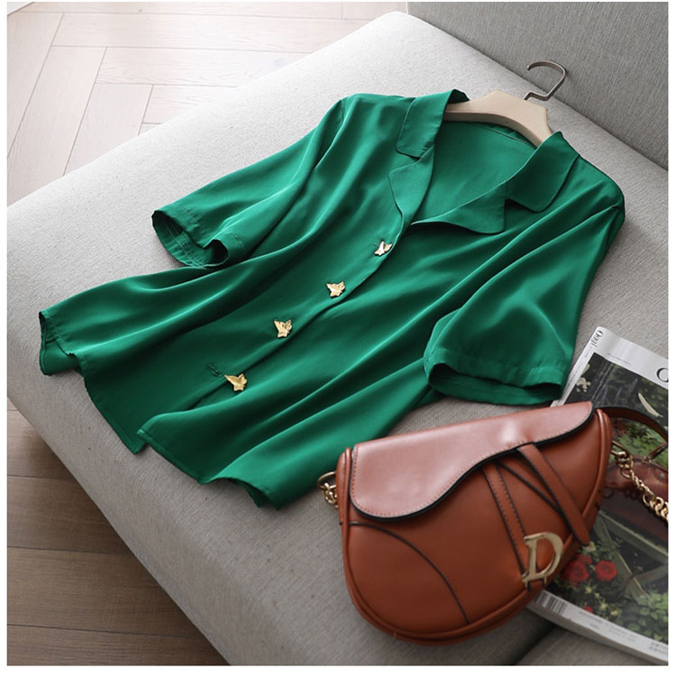 丁摩 真丝衬衫洋气时尚法式短袖绿色桑蚕丝衬衣上衣开衫Q122034