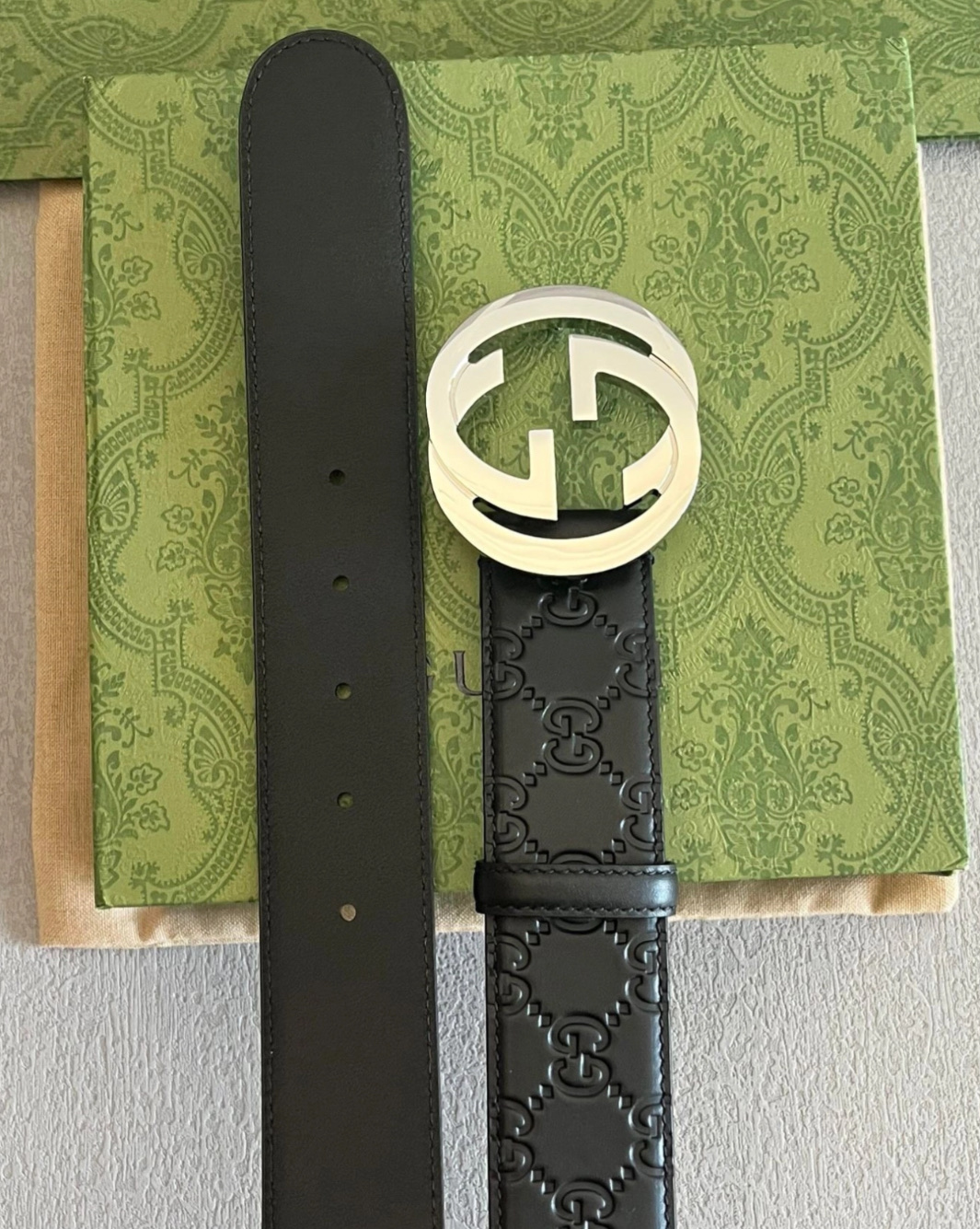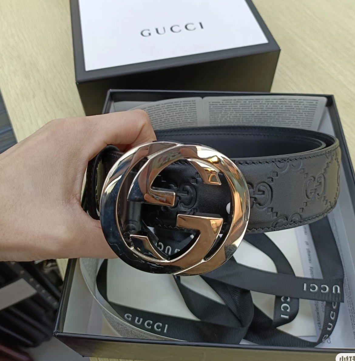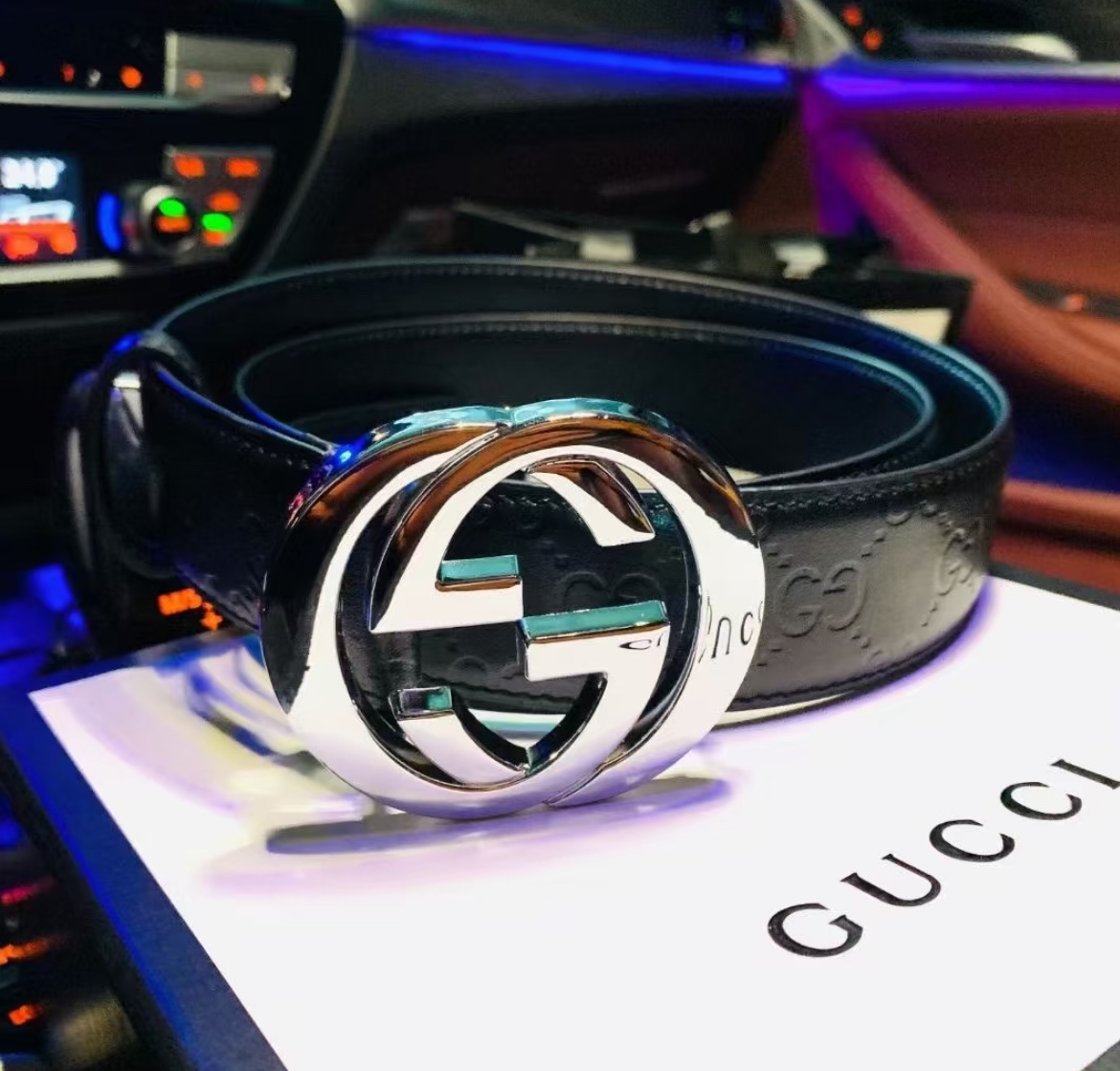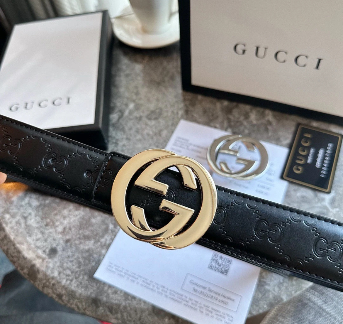 扣头的双G互扣设计是立体浮雕的,不是那种轻飘飘的平面款,拿在手里能摸到沉甸甸的质感,细节处全是大牌的底气~ 腰带内侧的刻印也很戳我——
