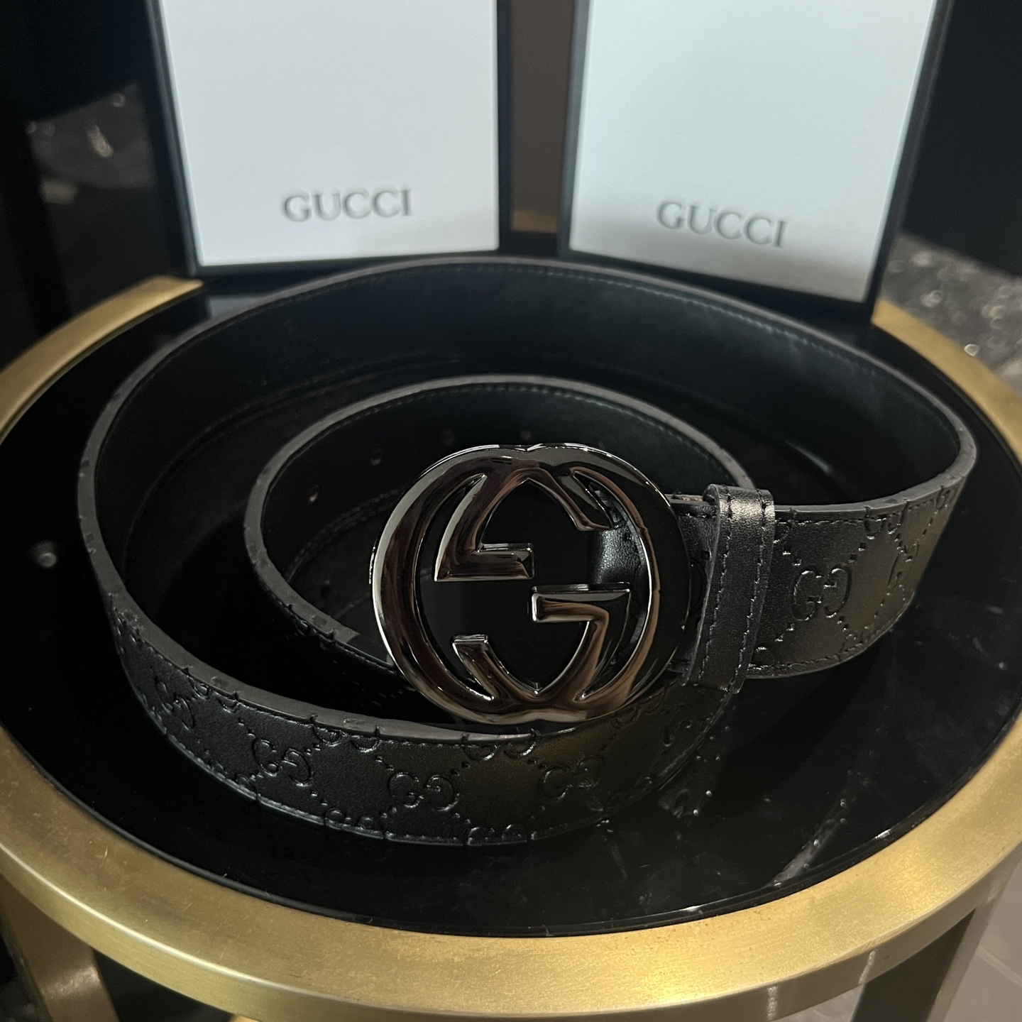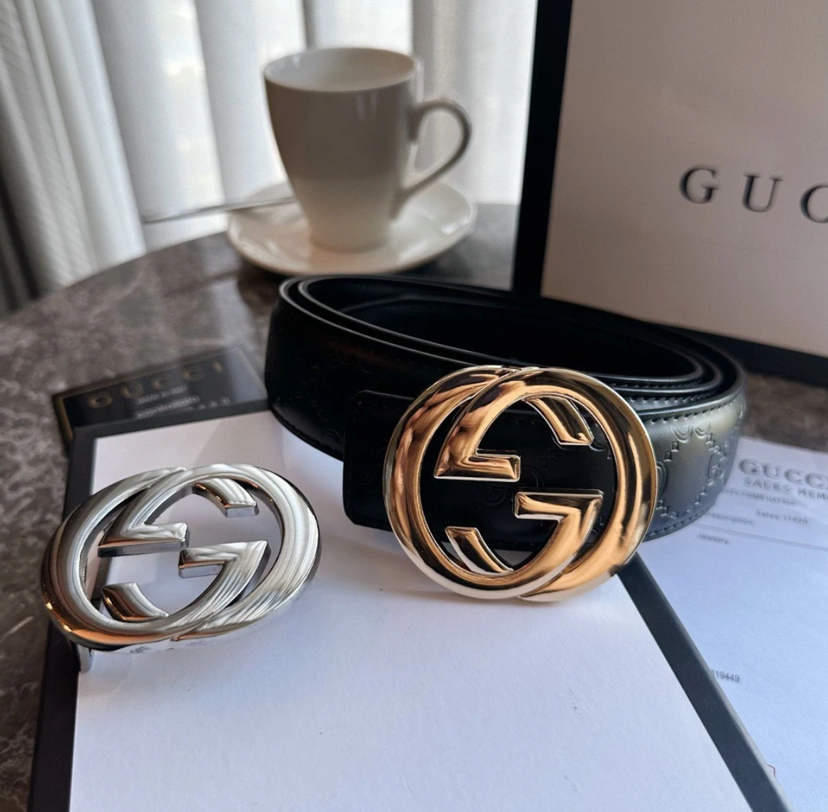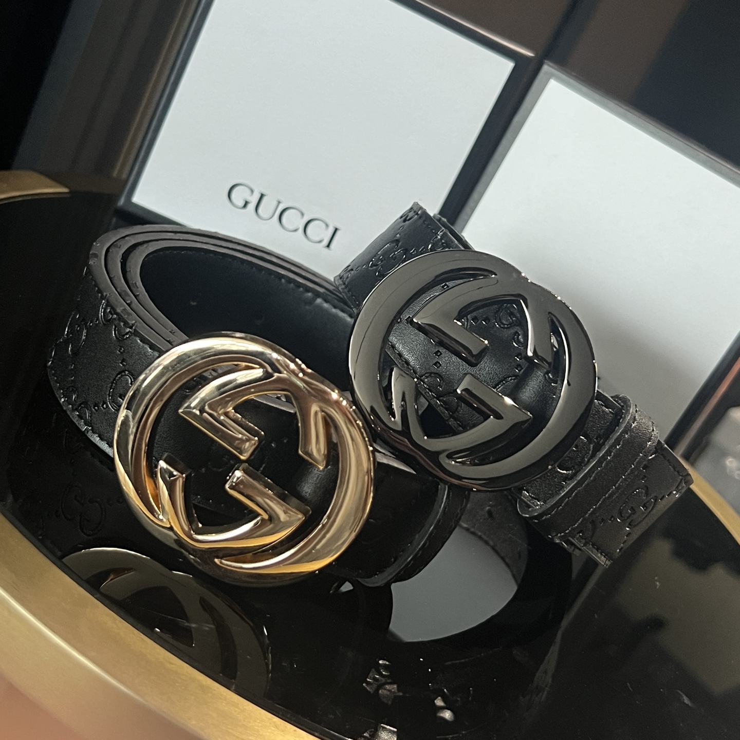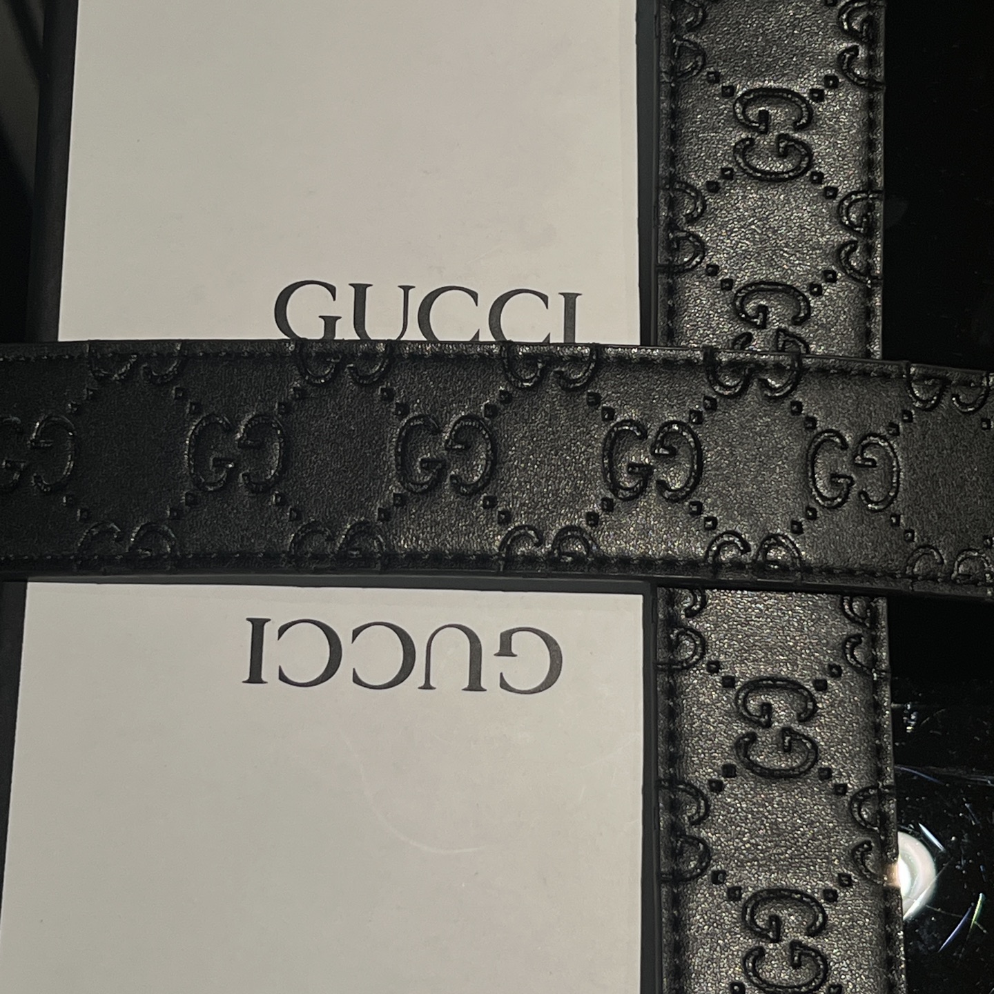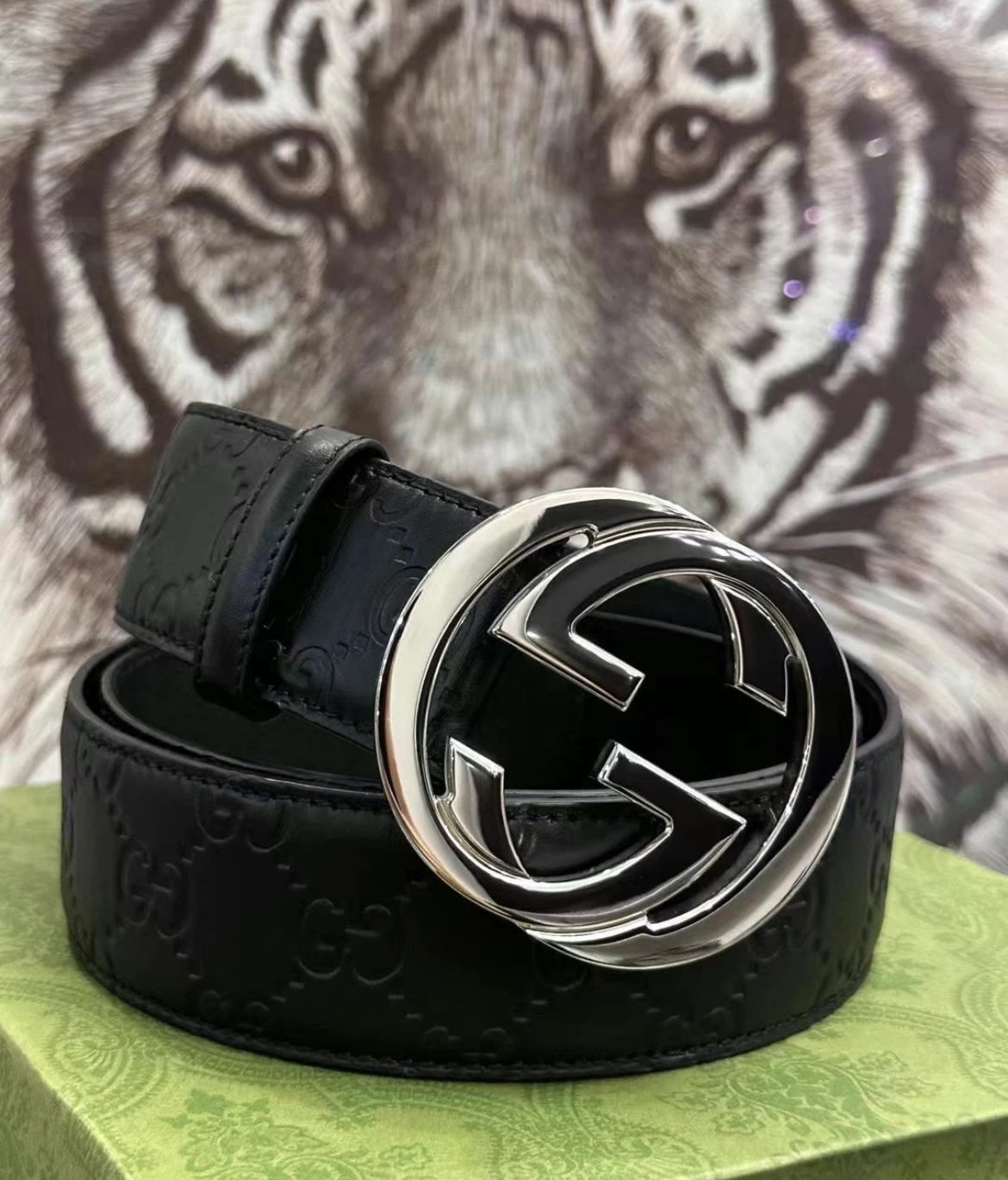 扣头的双G互扣设计是立体浮雕的,不是那种轻飘飘的平面款,拿在手里能摸到沉甸甸的质感,细节处全是大牌的底气~ 腰带内侧的刻印也很戳我——