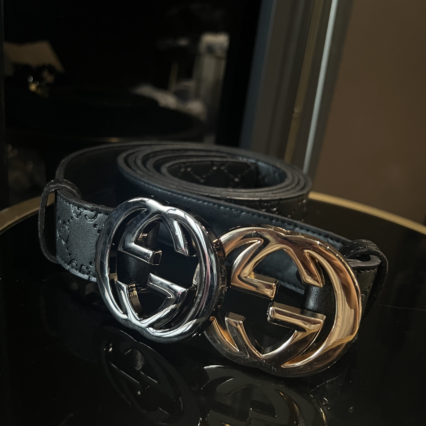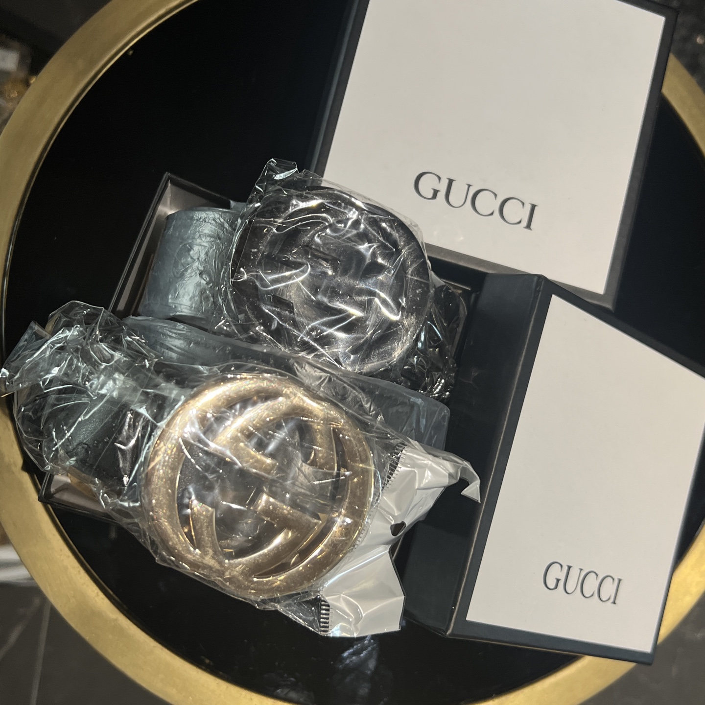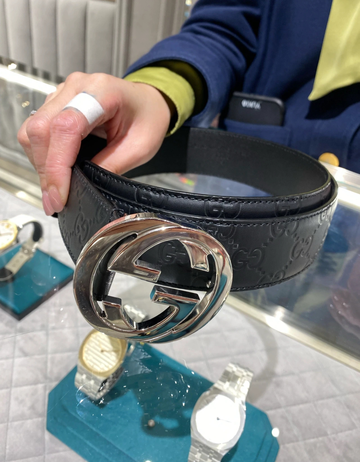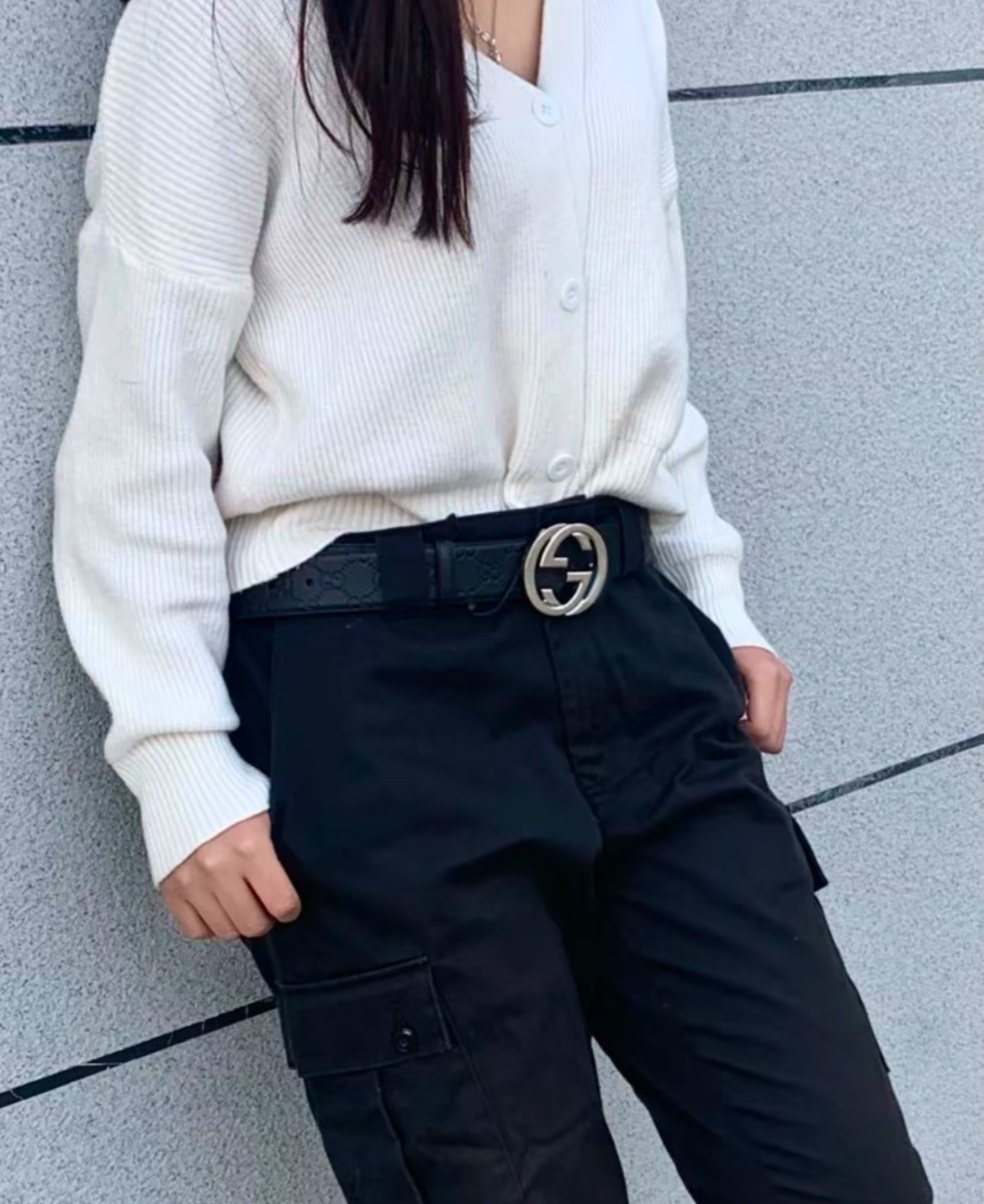 扣头的双G互扣设计是立体浮雕的,不是那种轻飘飘的平面款,拿在手里能摸到沉甸甸的质感,细节处全是大牌的底气~ 腰带内侧的刻印也很戳我——