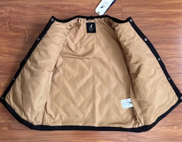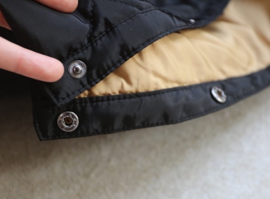 小圆领样式 领口和袖口是灯芯绒包的 前襟按扣 与衣身同色 外扣都有刻字