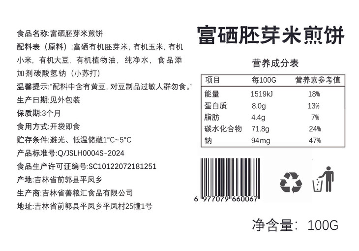 煎饼:(原料)富硒有机胚芽米、有机玉米、有机小米、有机大豆、有机植物油、纯净水、食品添加剂碳酸氢钠(小苏打)
