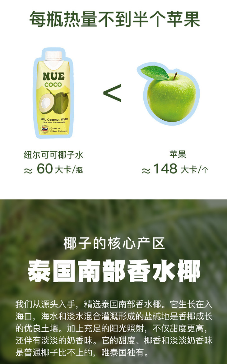 •完美口感来自好原料 【NUE纽尔可可椰子水】选用泰国🇹🇭南部的香水椰 香水椰生长在入海口,海水和淡水混合灌溉形成的盐碱地是香椰成长的优良土壤 加上充足的阳光照射,不仅甜度天生更高,还伴有淡淡的奶香味 它的甜度、椰香和淡淡奶香味是普通椰子比不上的