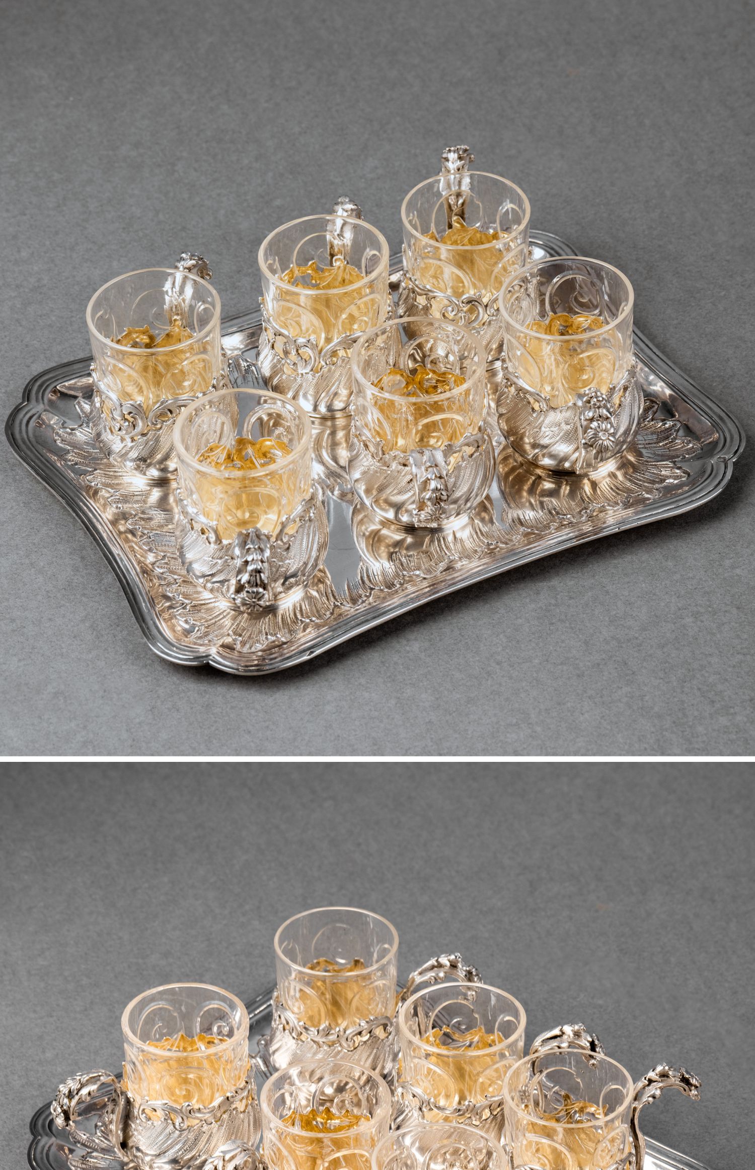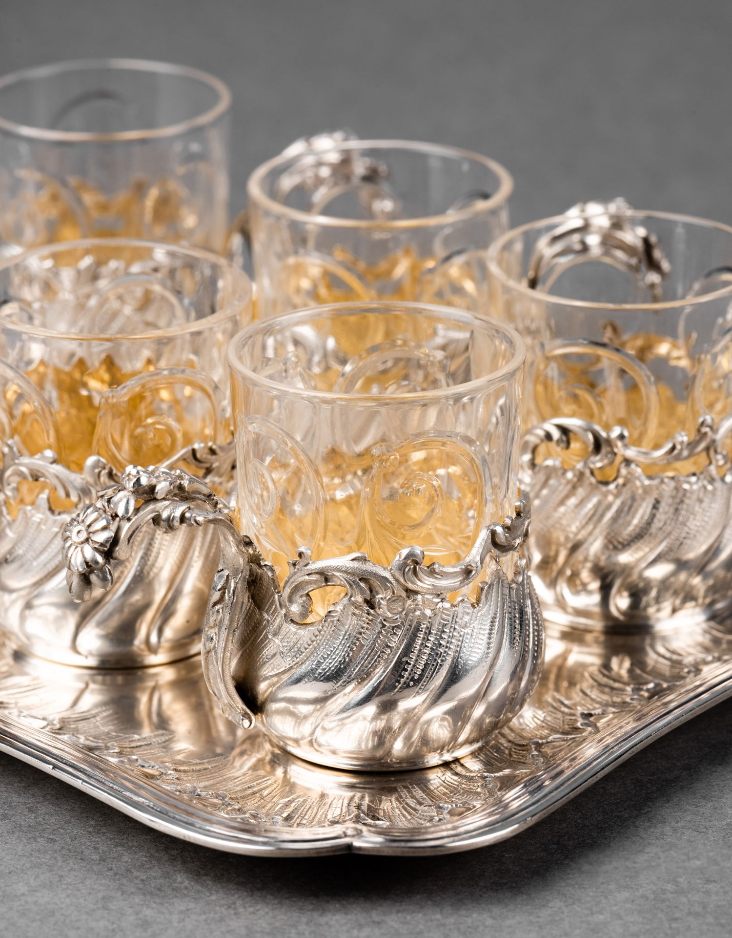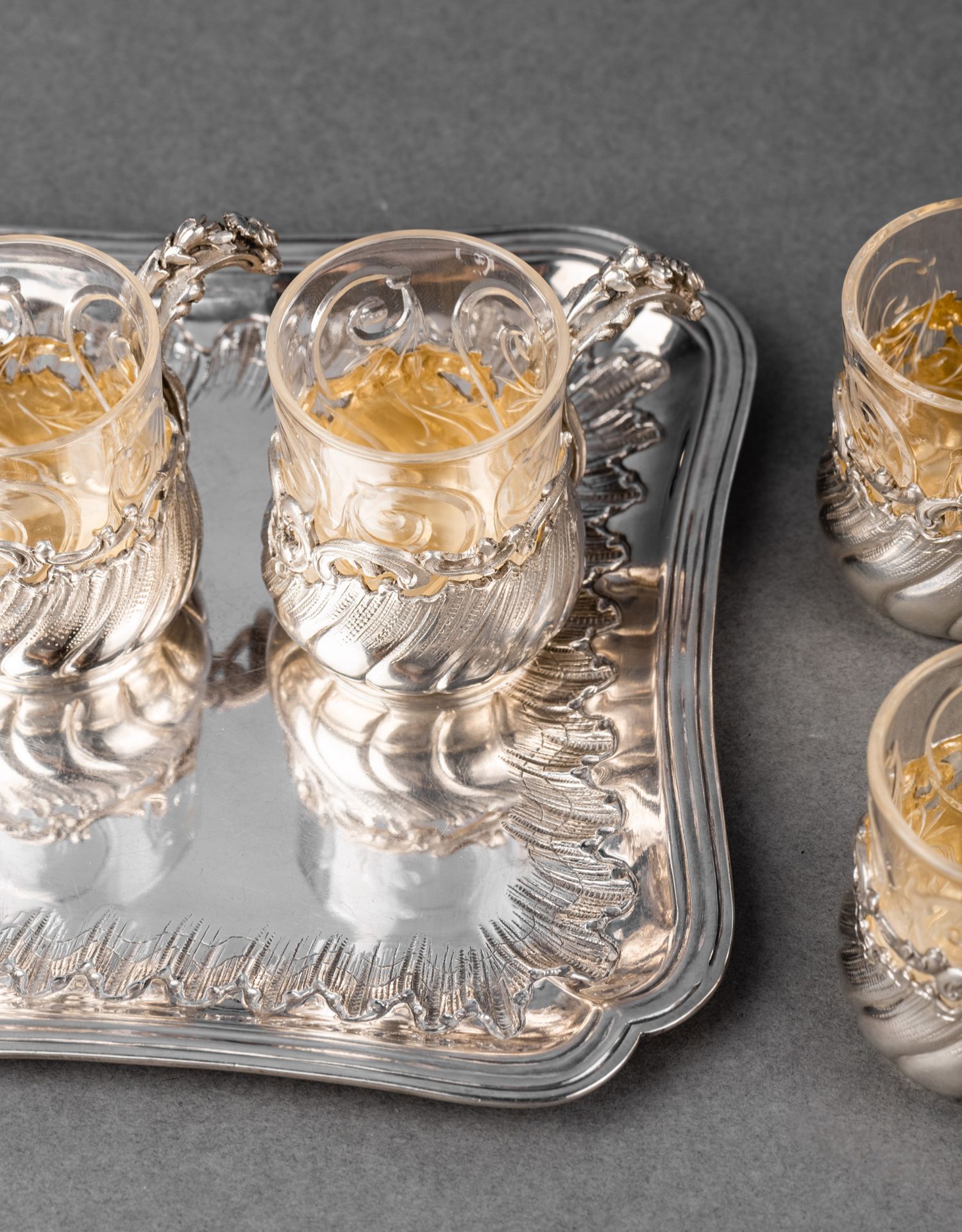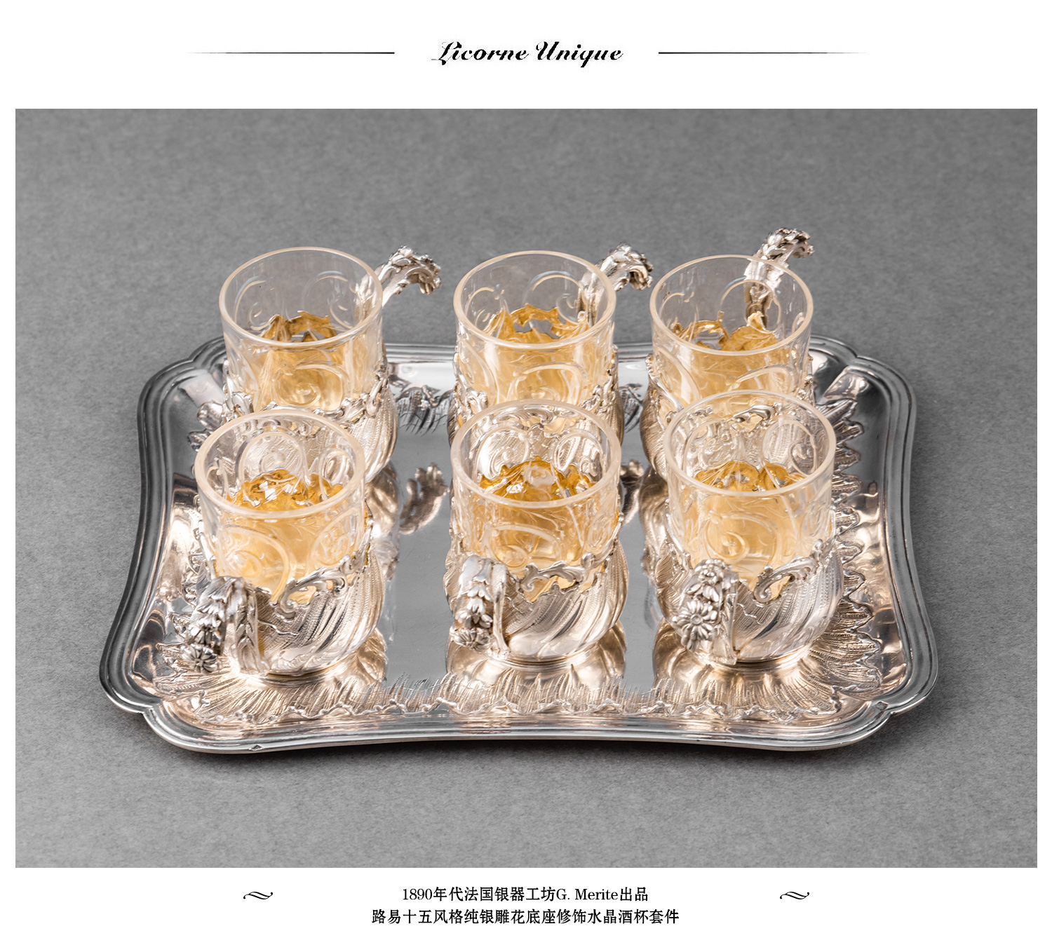 独角鹿西洋古董法国G. Merite路易十五风格纯银雕花水晶酒杯套装