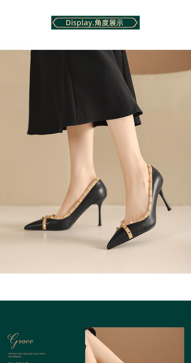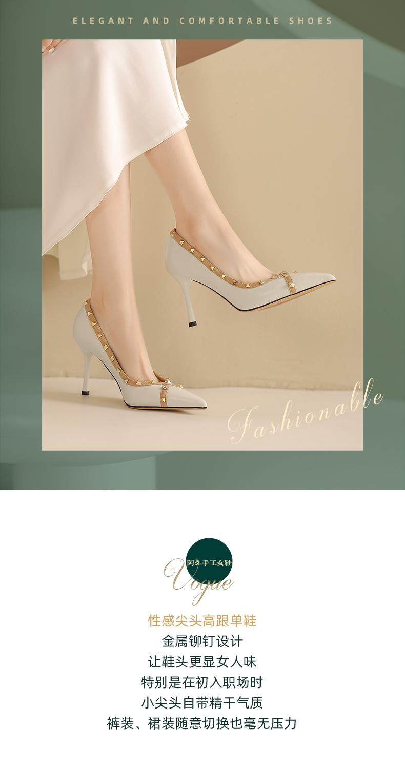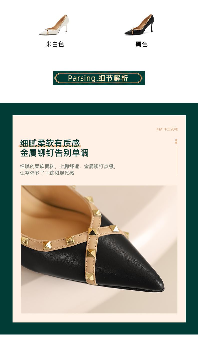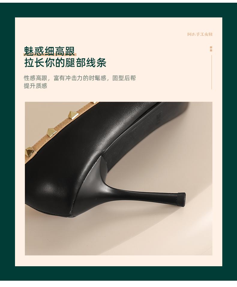 阿么手工女鞋气质欧美风尖头铆钉细跟高跟鞋8.5CCM优雅百搭单鞋女