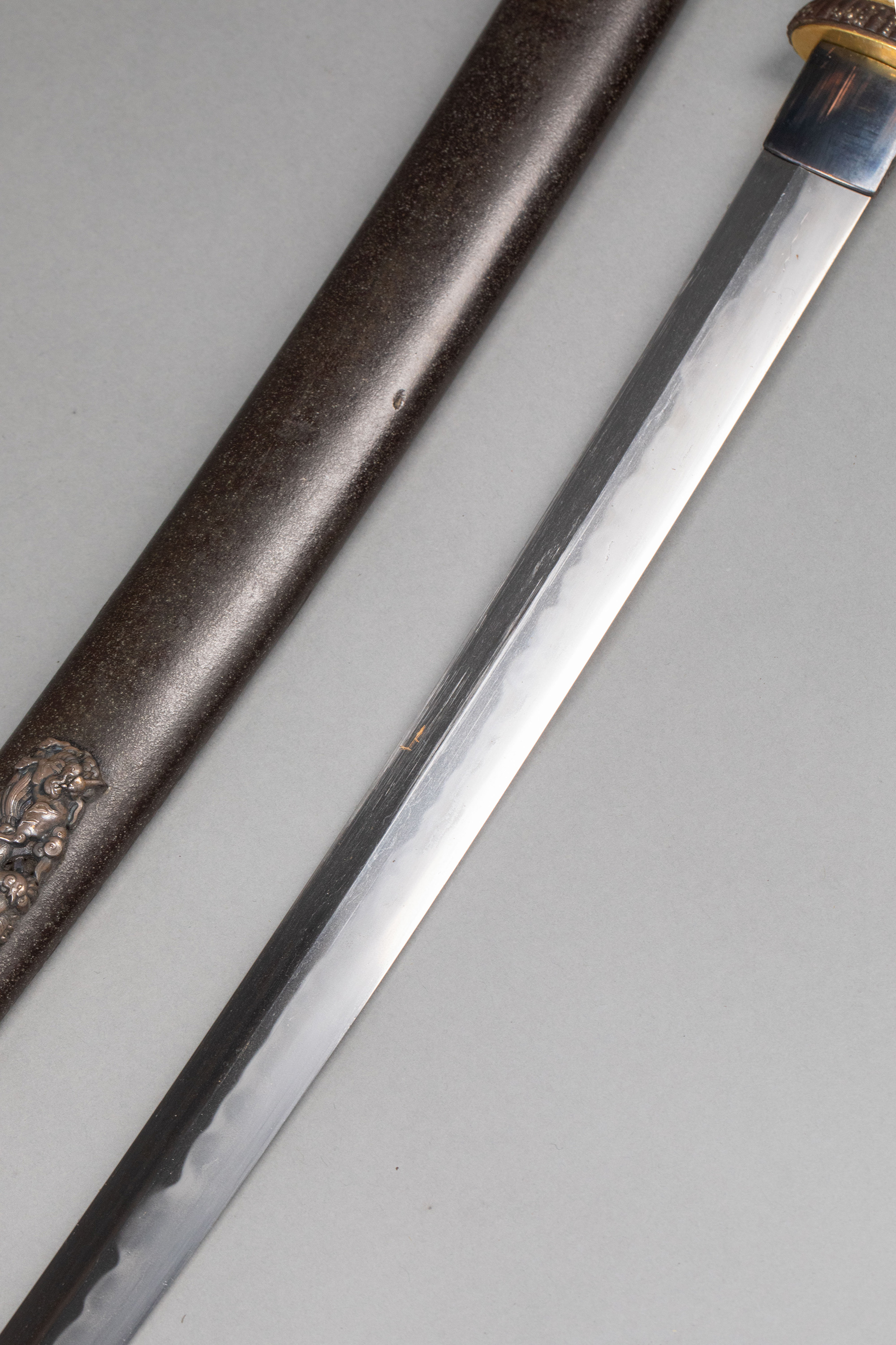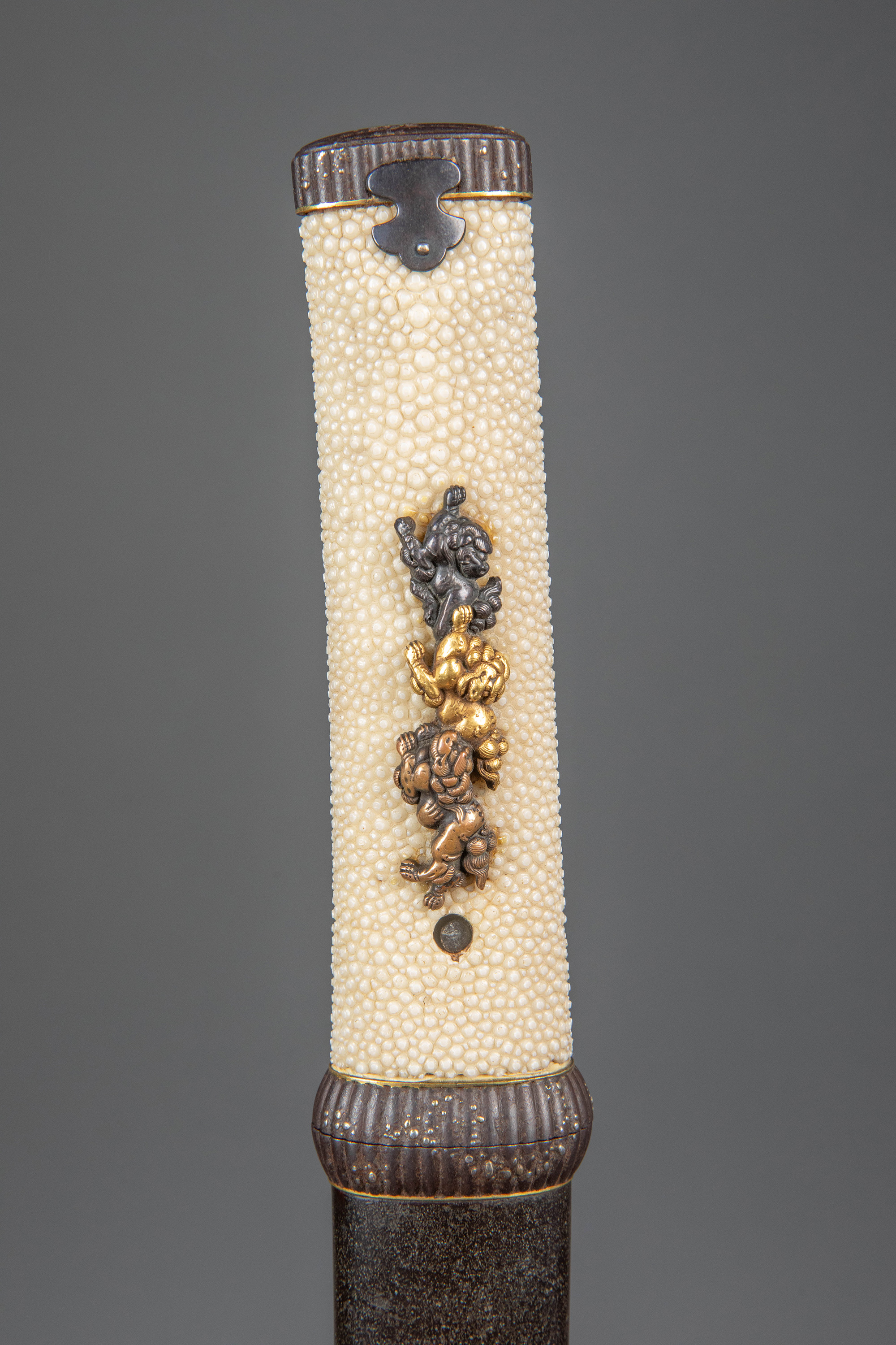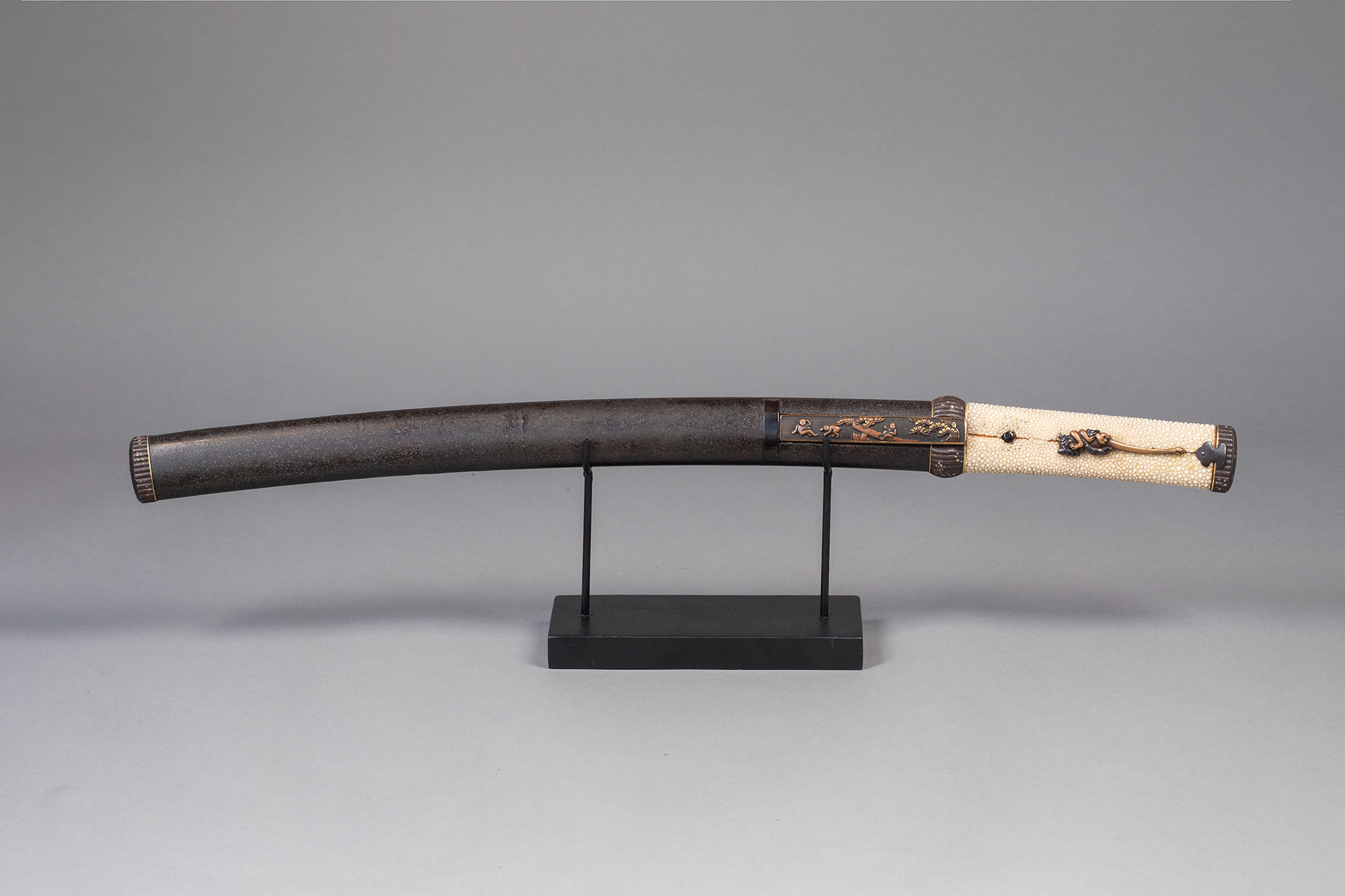 1603-1868年代日本江户时期出品东方瑞兽主题铜鎏金银精雕装饰漆木刀鞘及鲛皮手柄胁差 配小刃