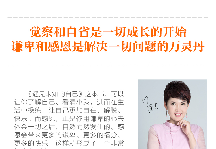 《遇见未知的自己》这本书,可以让你了解自己、看清小我,进而在生活中操练,让自己*加自在、解脱、快乐。而感恩,正是你用谦卑的心去体会一切之后,自然而然发生的。感恩会带来*多的谦卑、*多的福分、*多的快乐,这样就形成了一个**好的良性循环。