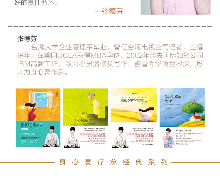 2008年至2013年,作品《活出全新的自己》《遇见心想事成的自己》《重遇未知的自己》(台版为:《爱上自己的不**》)《舍得让你爱的人受苦》逐一上市。与此同时,张德芬还翻译了德国心灵导师艾克哈特?托尔的作品《新世界:灵性的觉醒》《修炼当下的力量》和加拿大知见心理学**克里斯多福?孟的《找回你的生命礼物》,以及审校《灵性开悟:不是你想的那样》等身心灵作品,为华语世界的身心灵普及发展做出了巨大的贡献。
