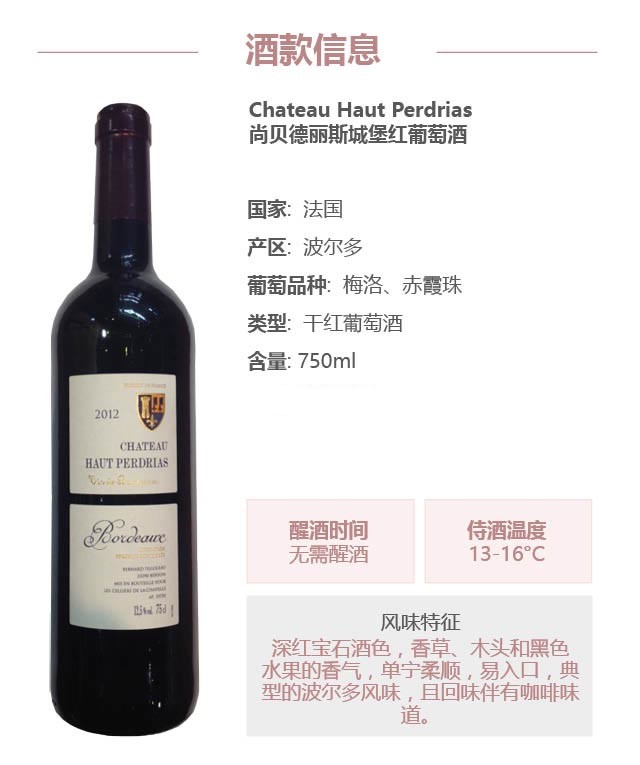 波尔多尚贝德丽斯城堡红葡萄酒 Chateau Haut Perdrias AOC Bordeaux 750ml【2012】