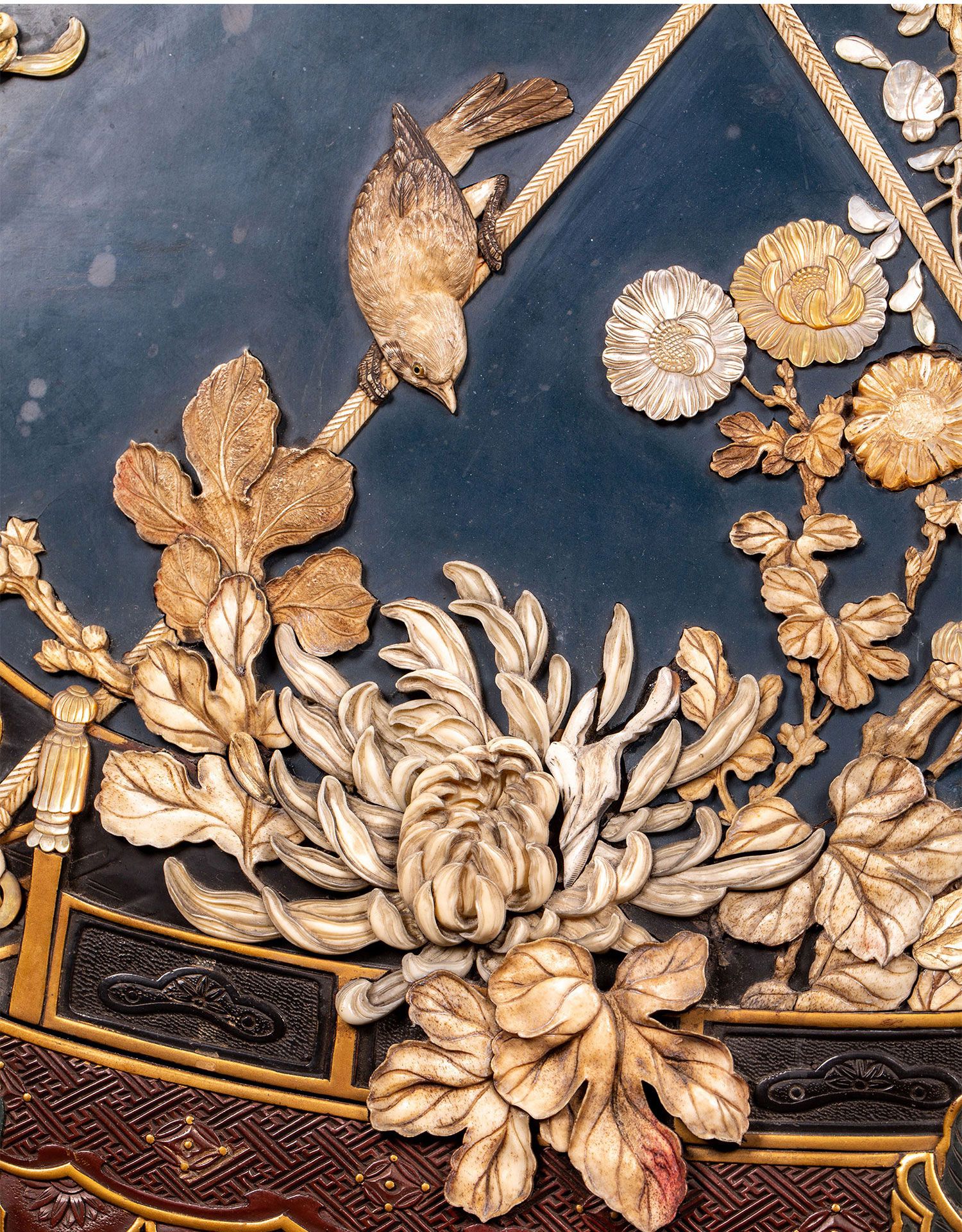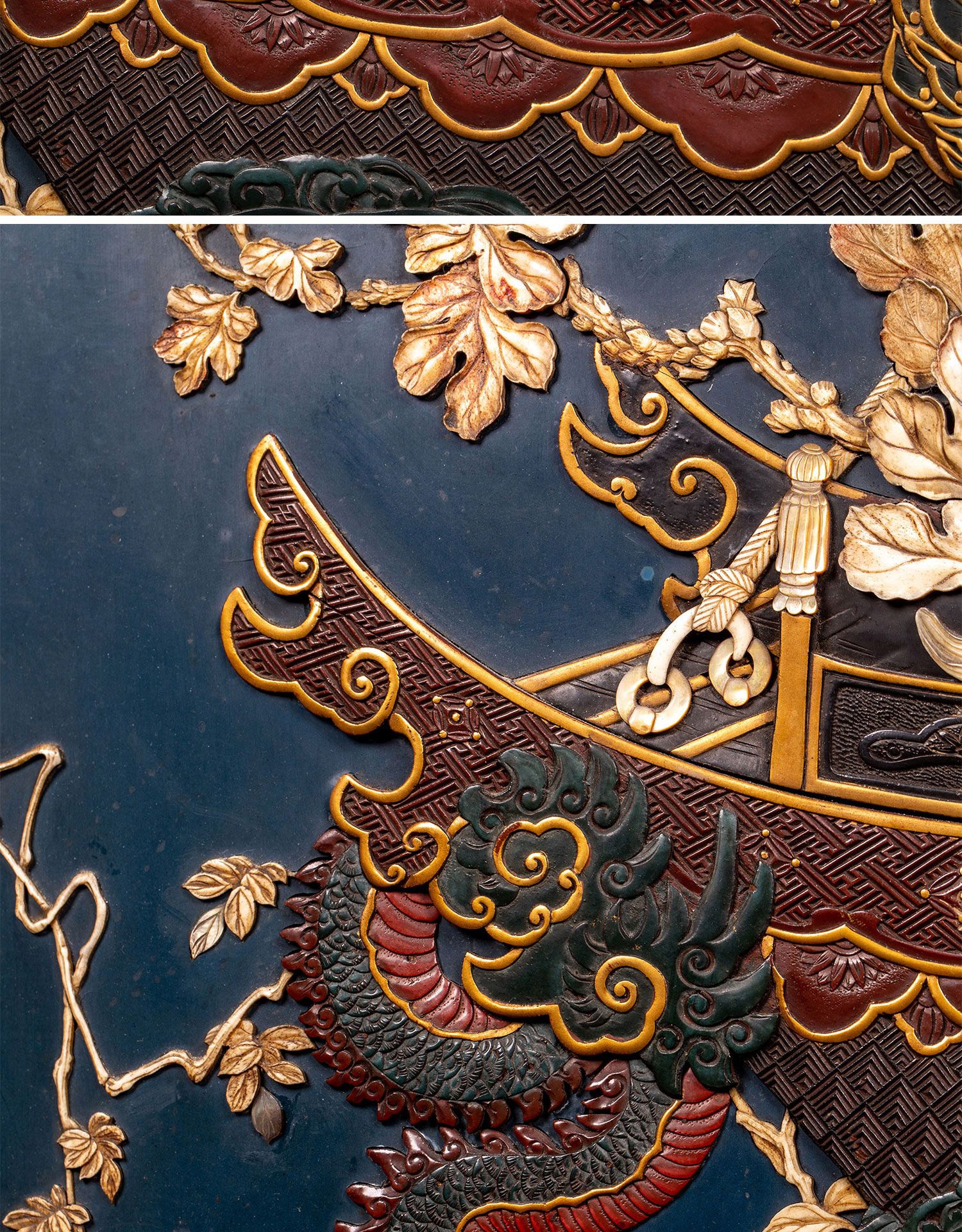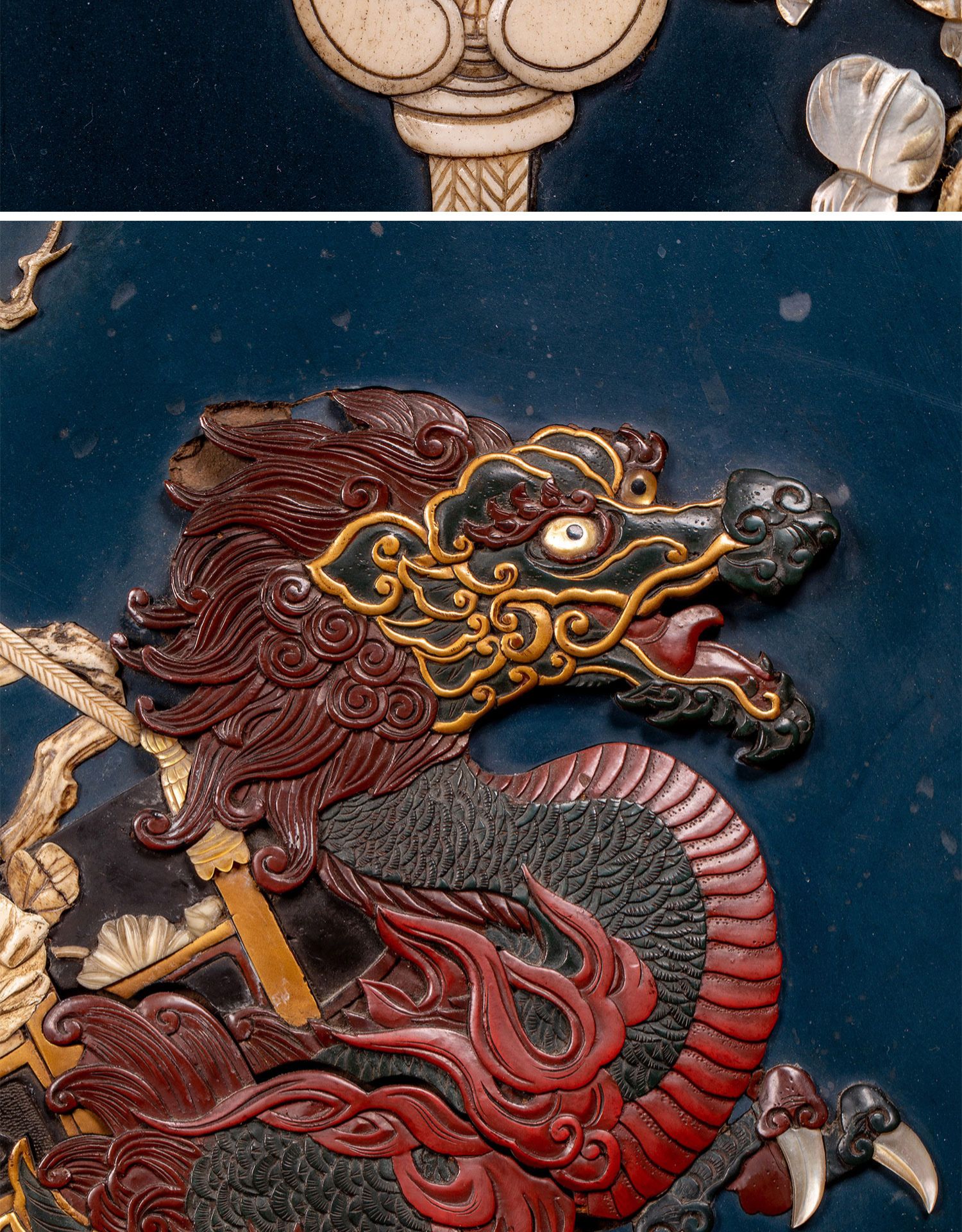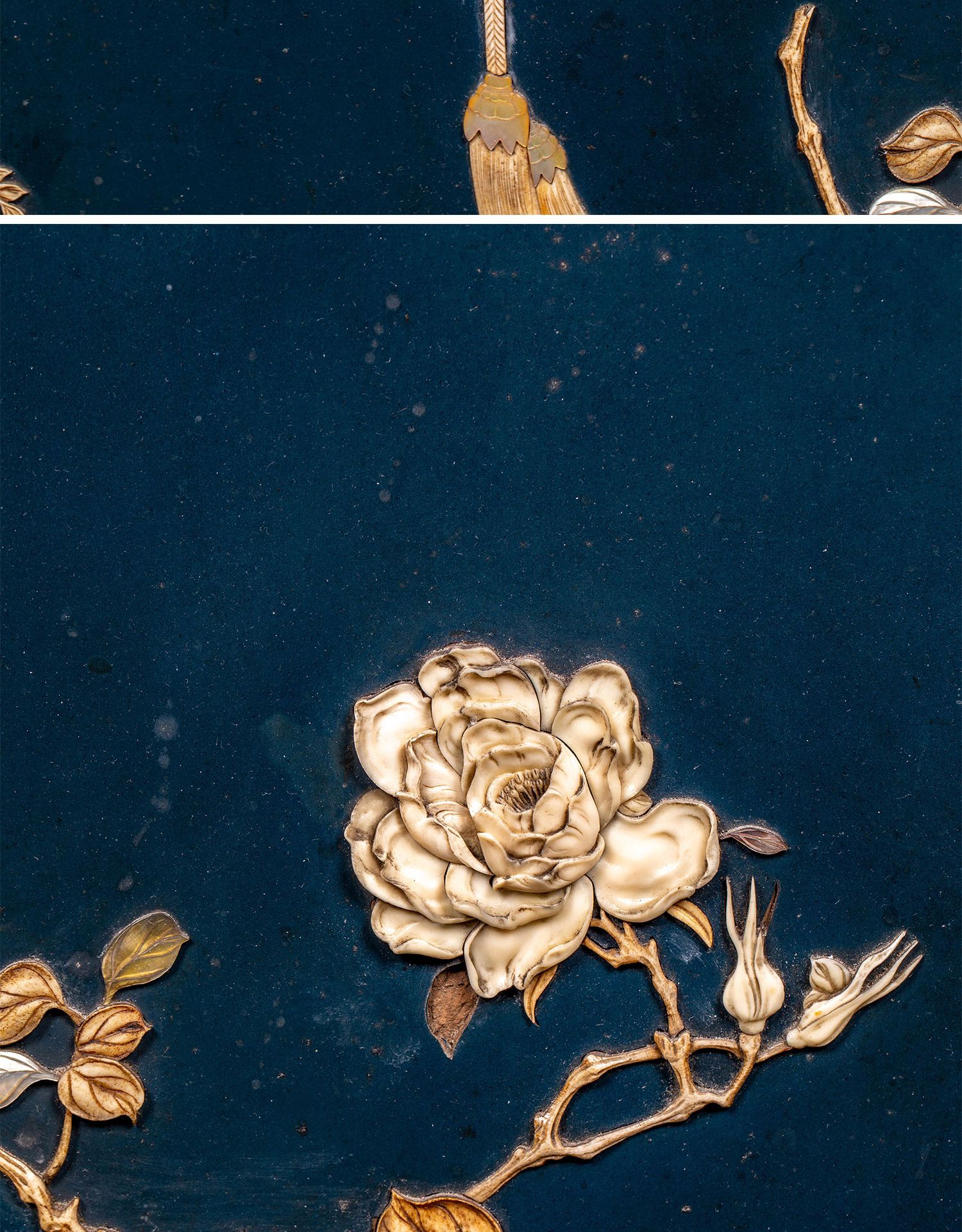 独角鹿西洋古董家居日本明治时期蓝漆地传统博古主题芝山镶嵌画