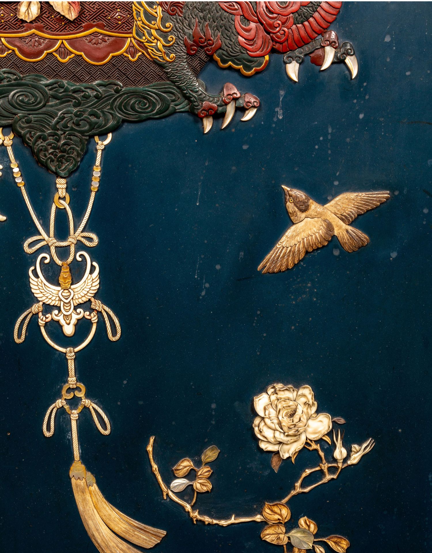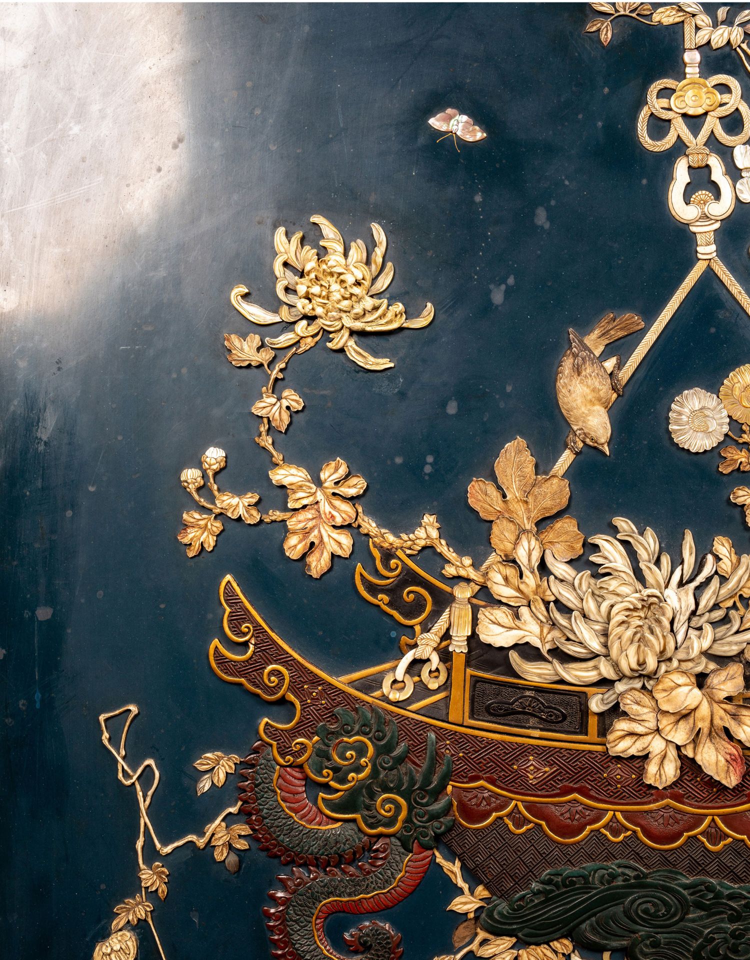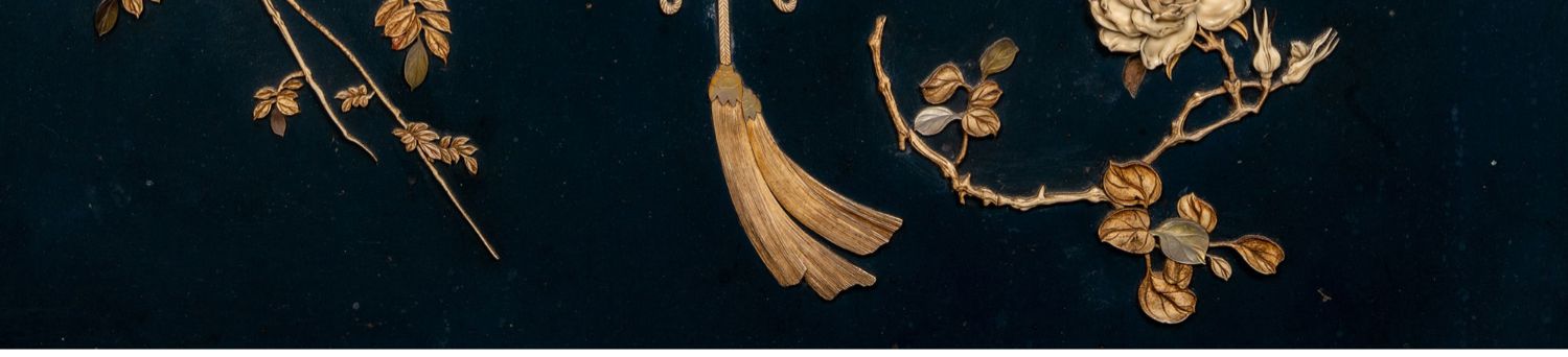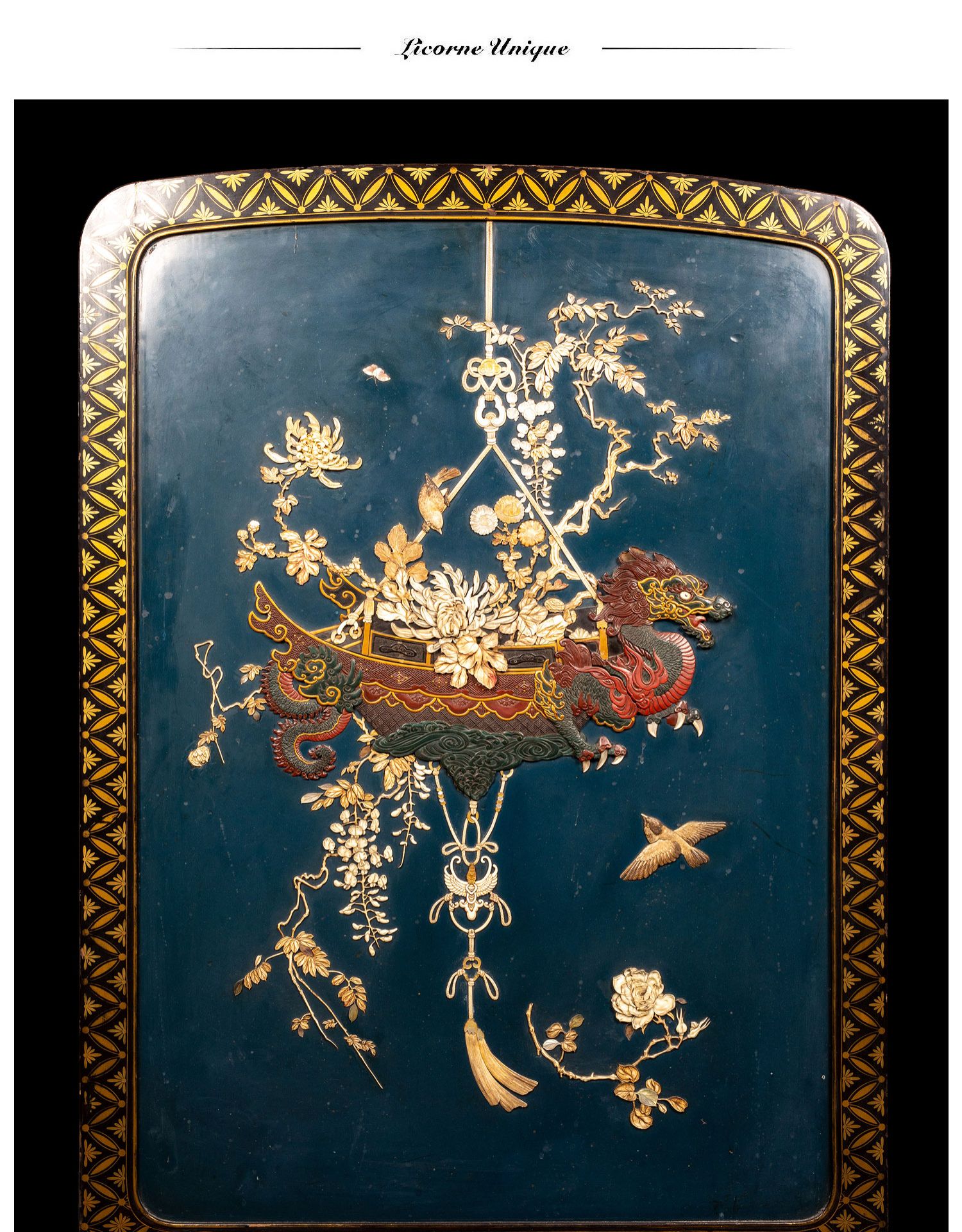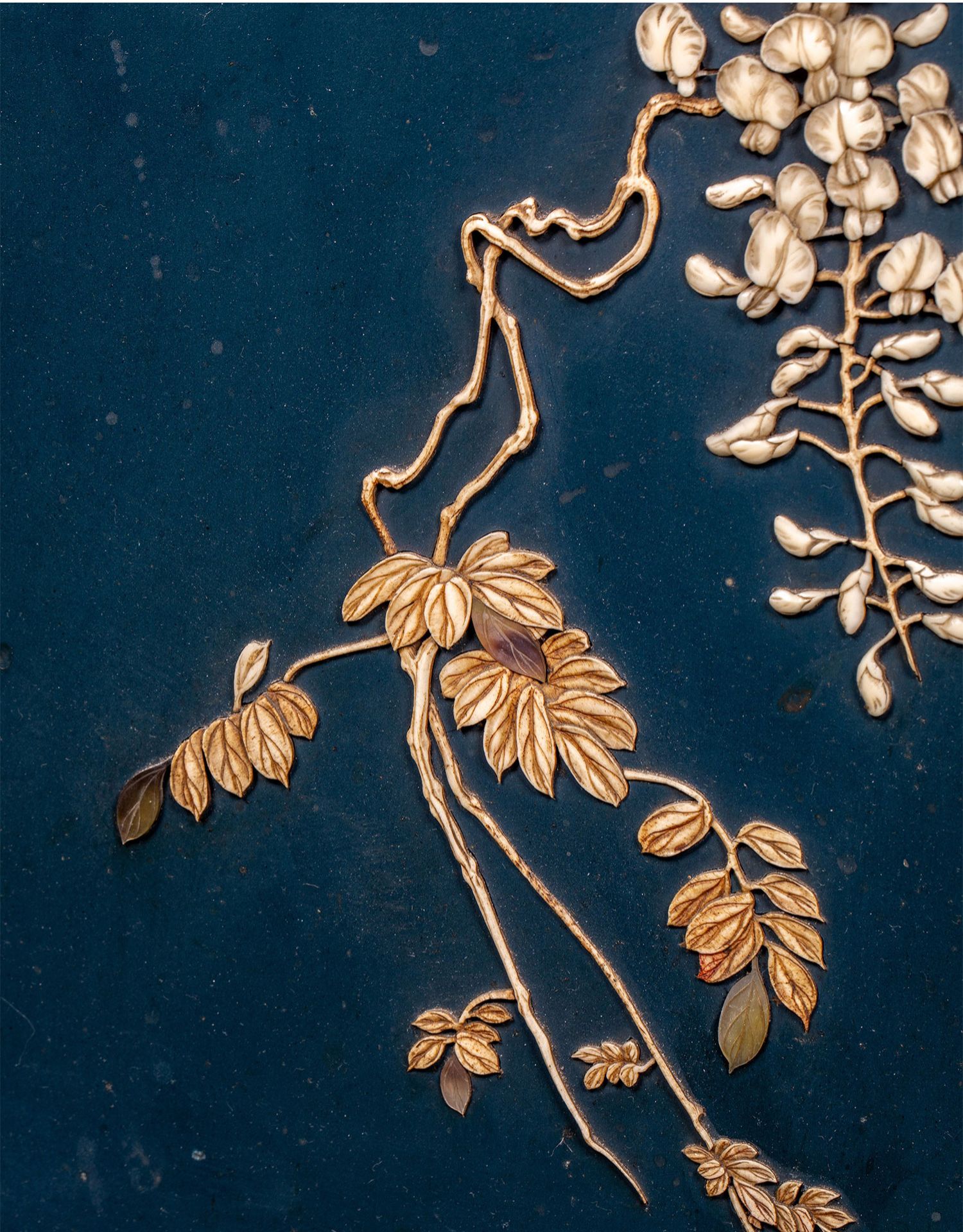 独角鹿西洋古董家居日本明治时期蓝漆地传统博古主题芝山镶嵌画