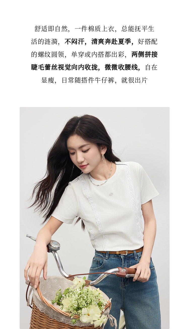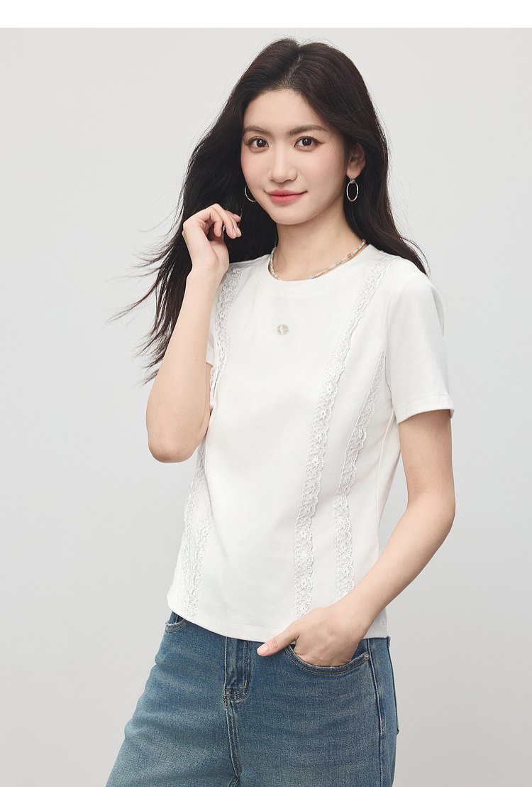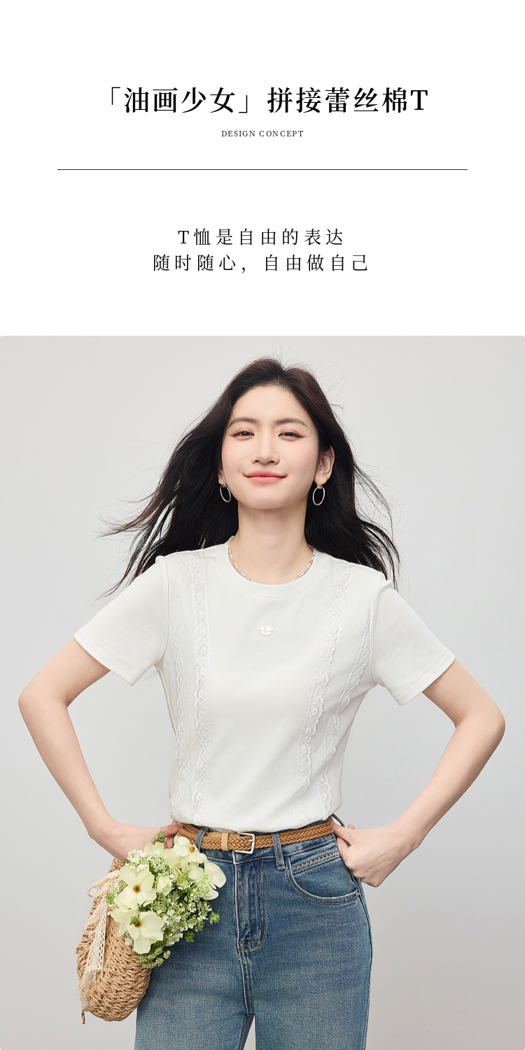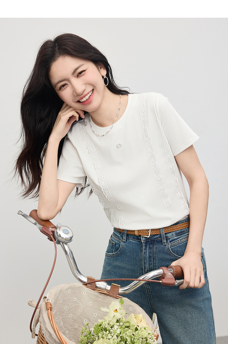 熙世界蕾丝花边拼接白色T恤女设计感圆领棉体恤上衣2025夏季新款
