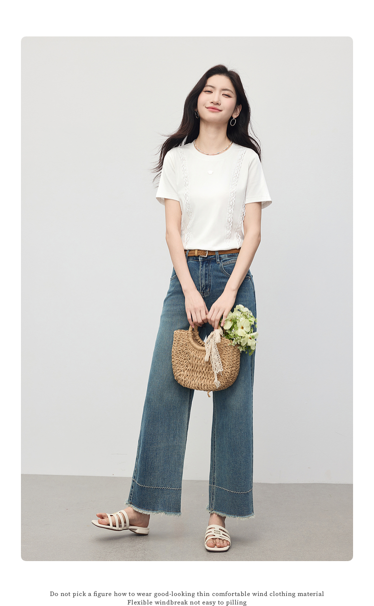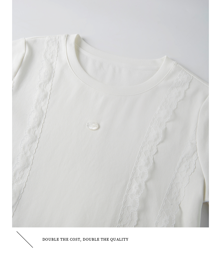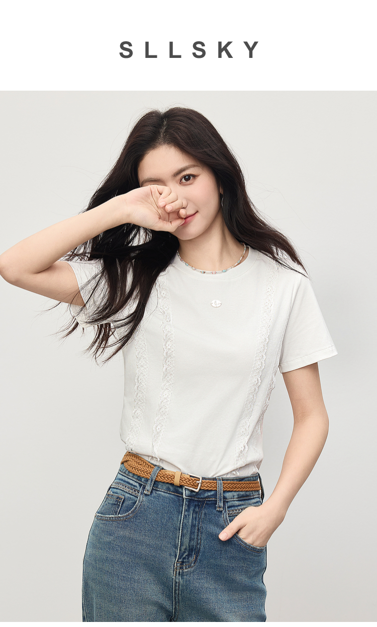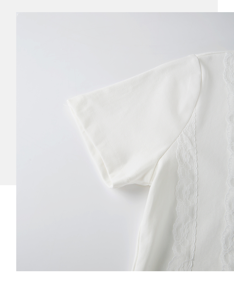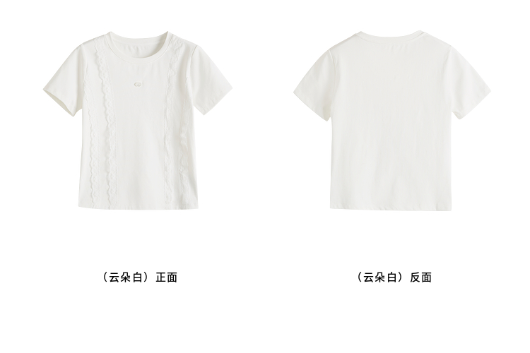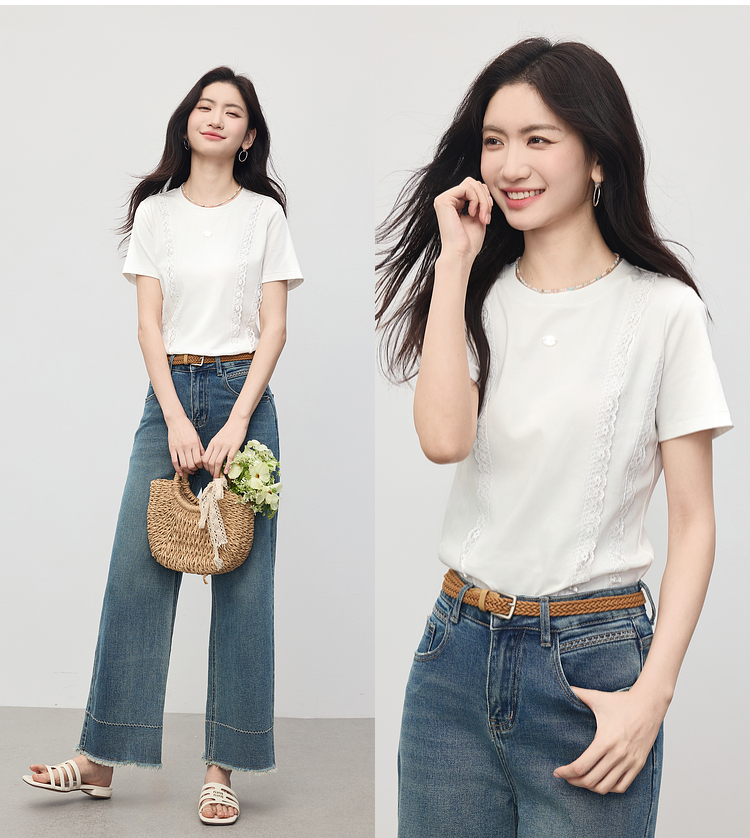 熙世界蕾丝花边拼接白色T恤女设计感圆领棉体恤上衣2025夏季新款