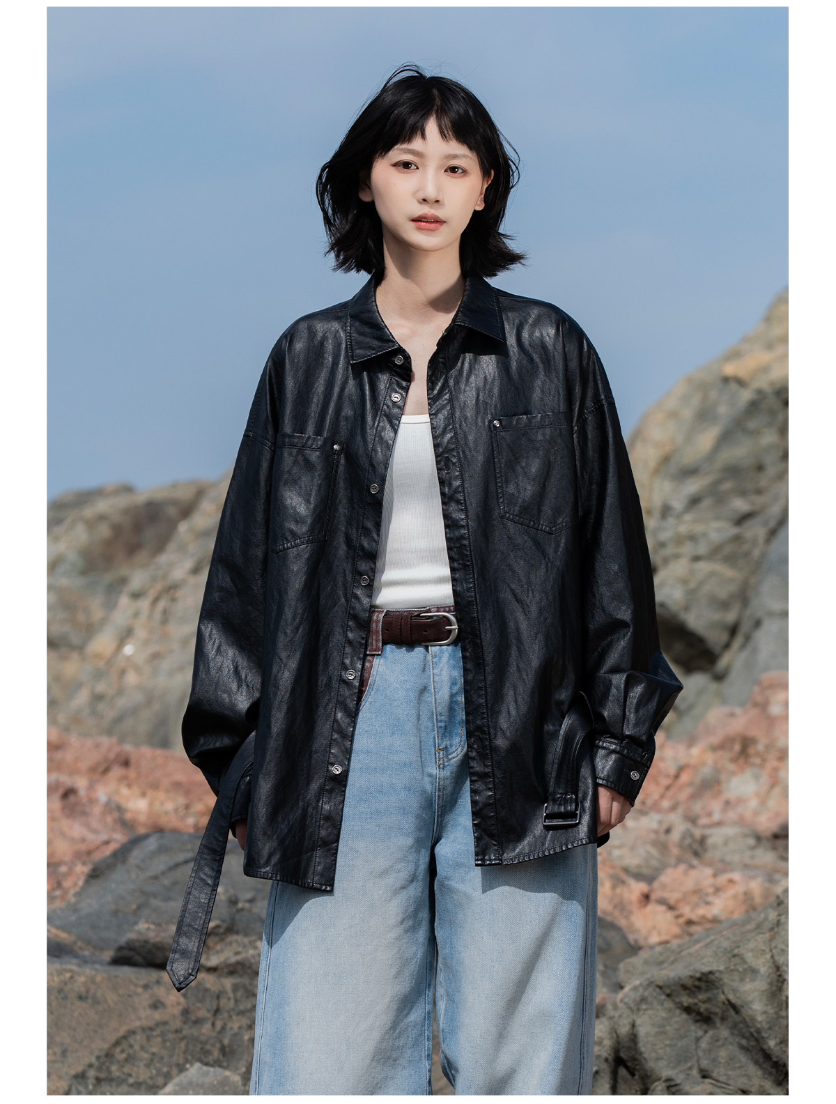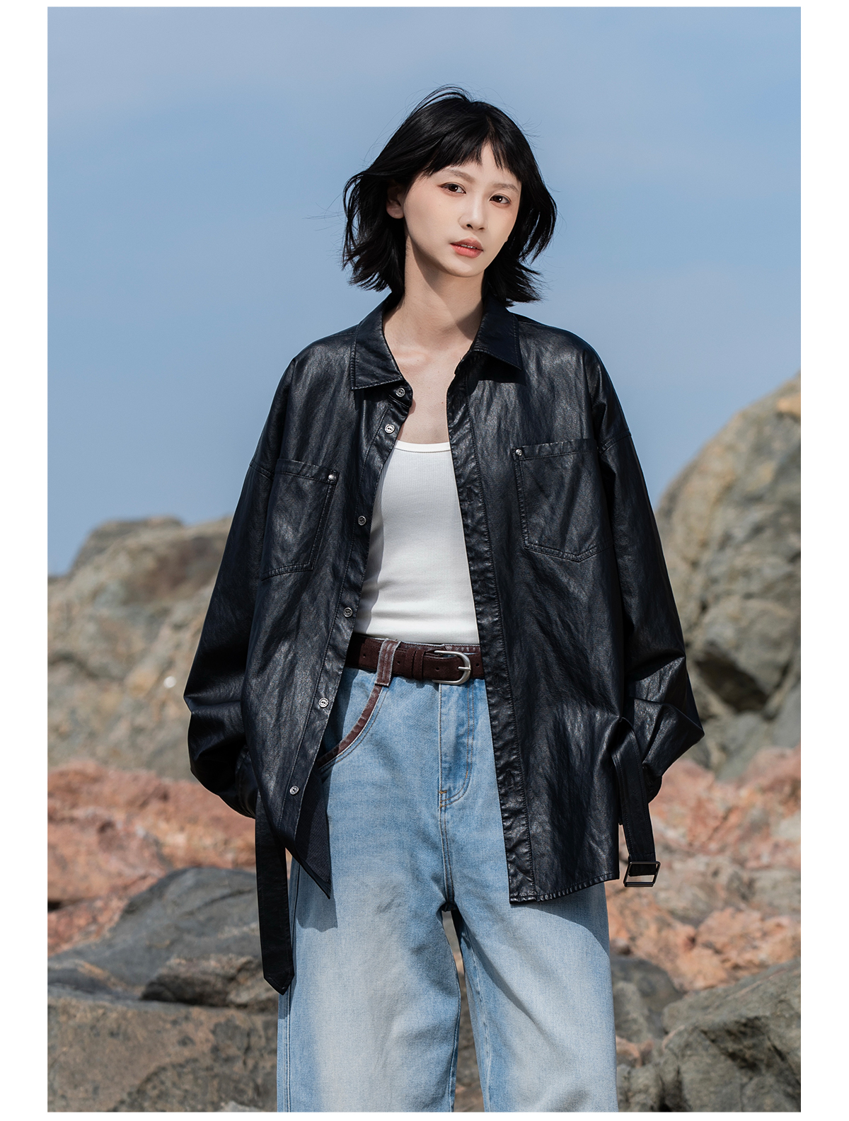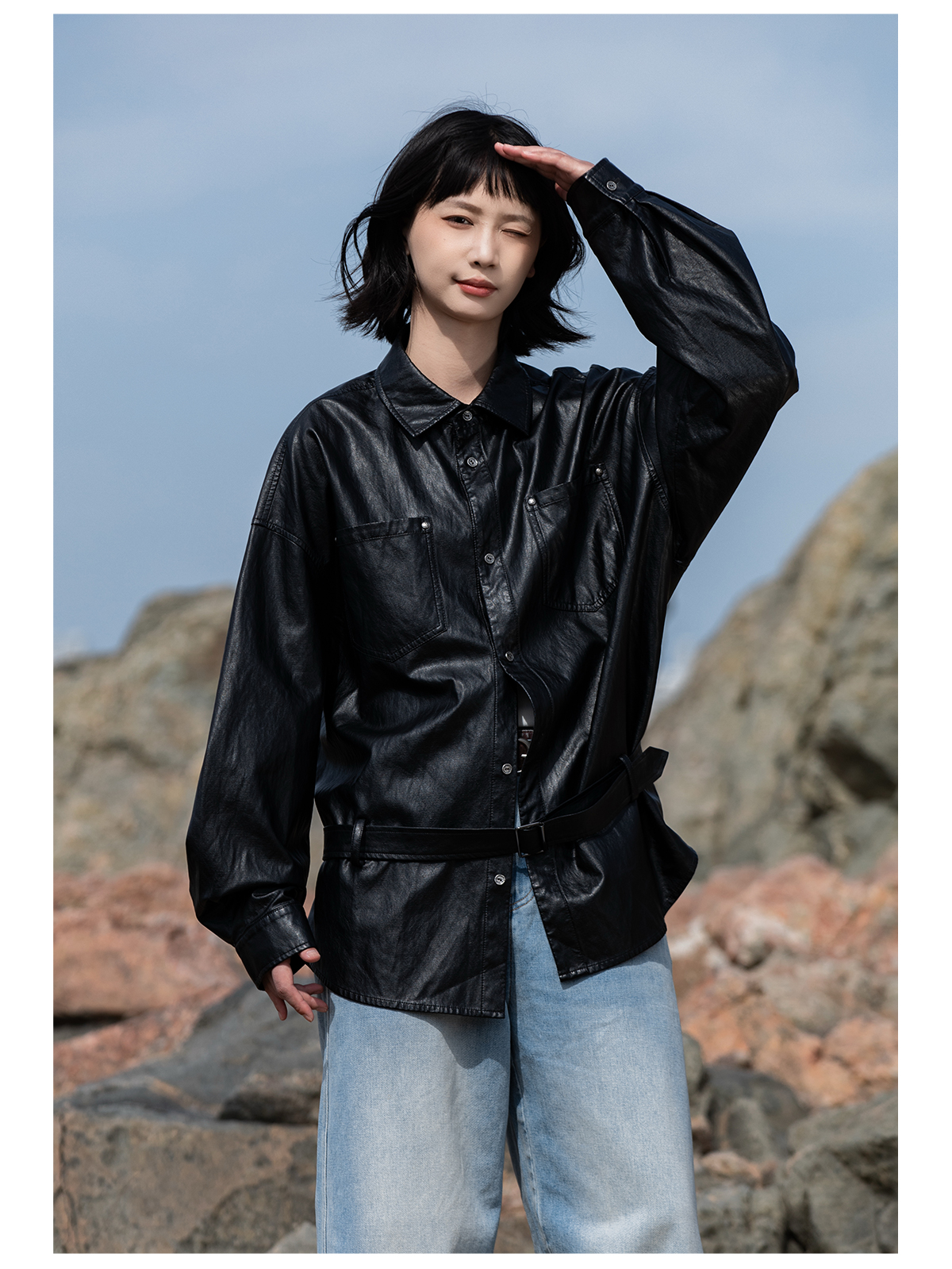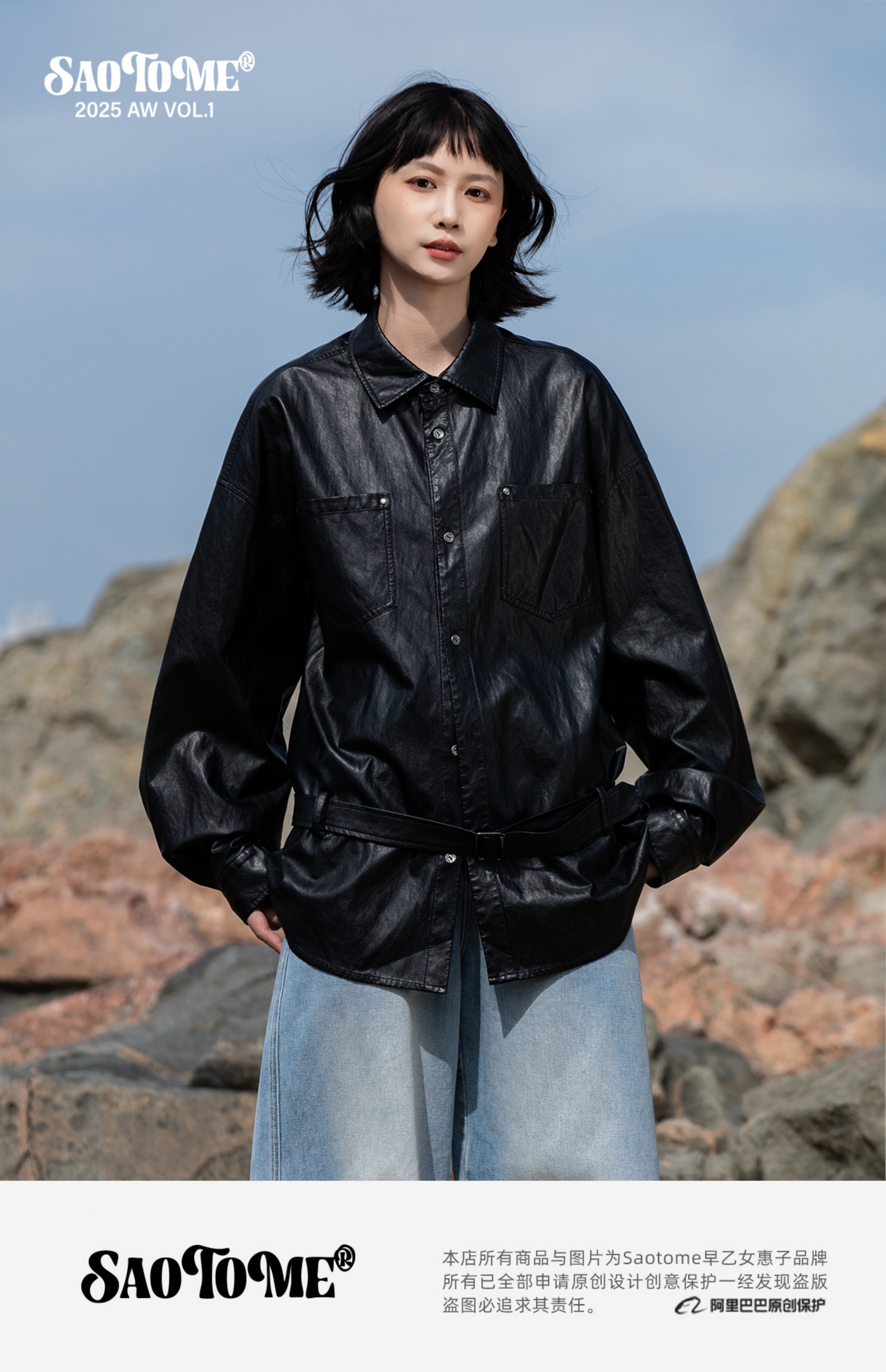 早乙女惠子saotome/STMCS13147/铆钉绑带收腰皮衬衫