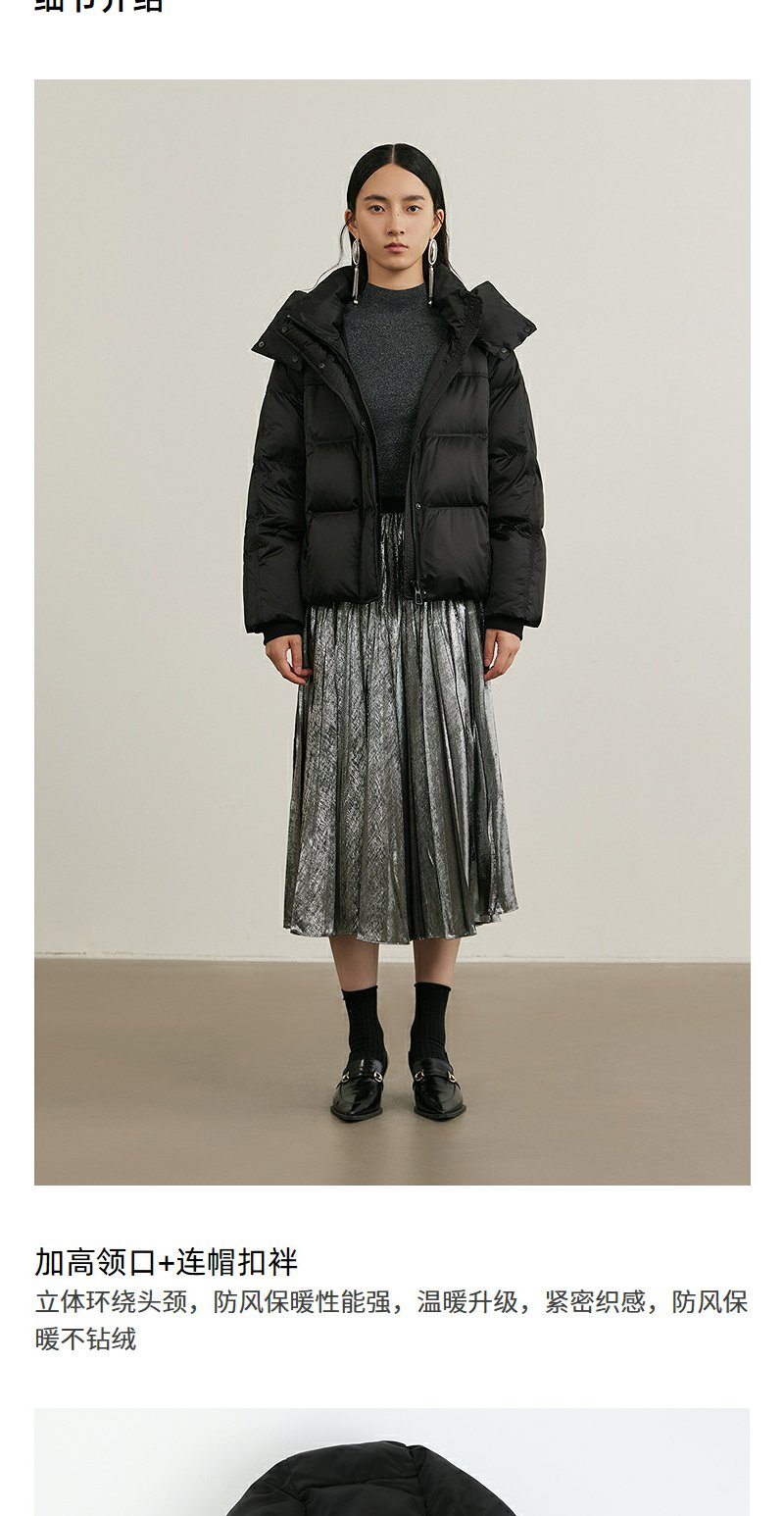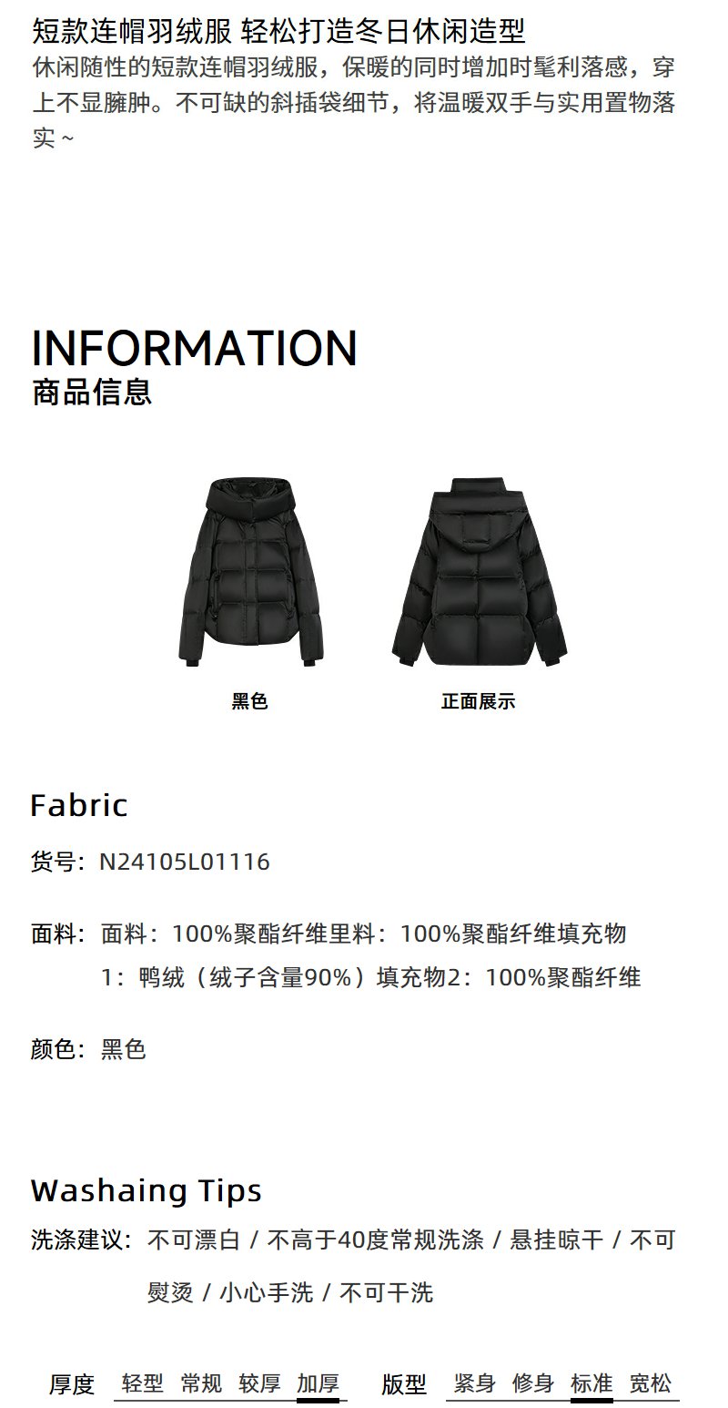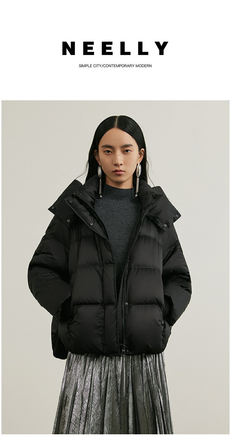 NEELLY纳俪商场同款冬新款黑色高领短款连帽外套女90白鸭绒羽绒服N24105L01116