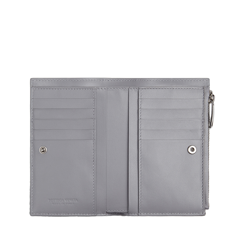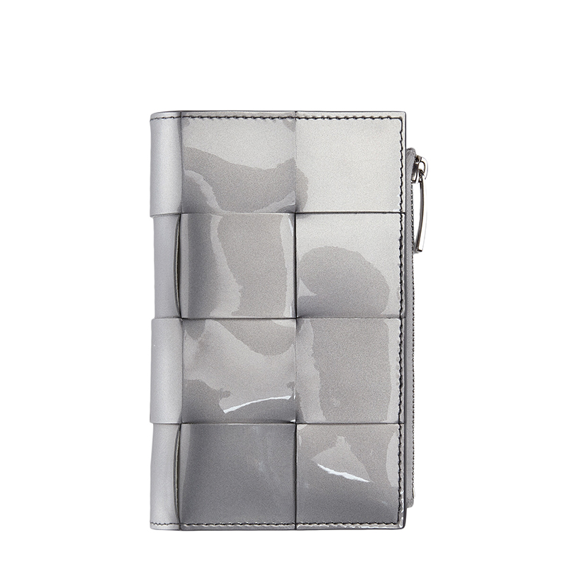 【包税】Bottega Veneta/葆蝶家 新款 女士银色Intreccio漆面牛皮革双折拉链钱包667130V1GQ28103
