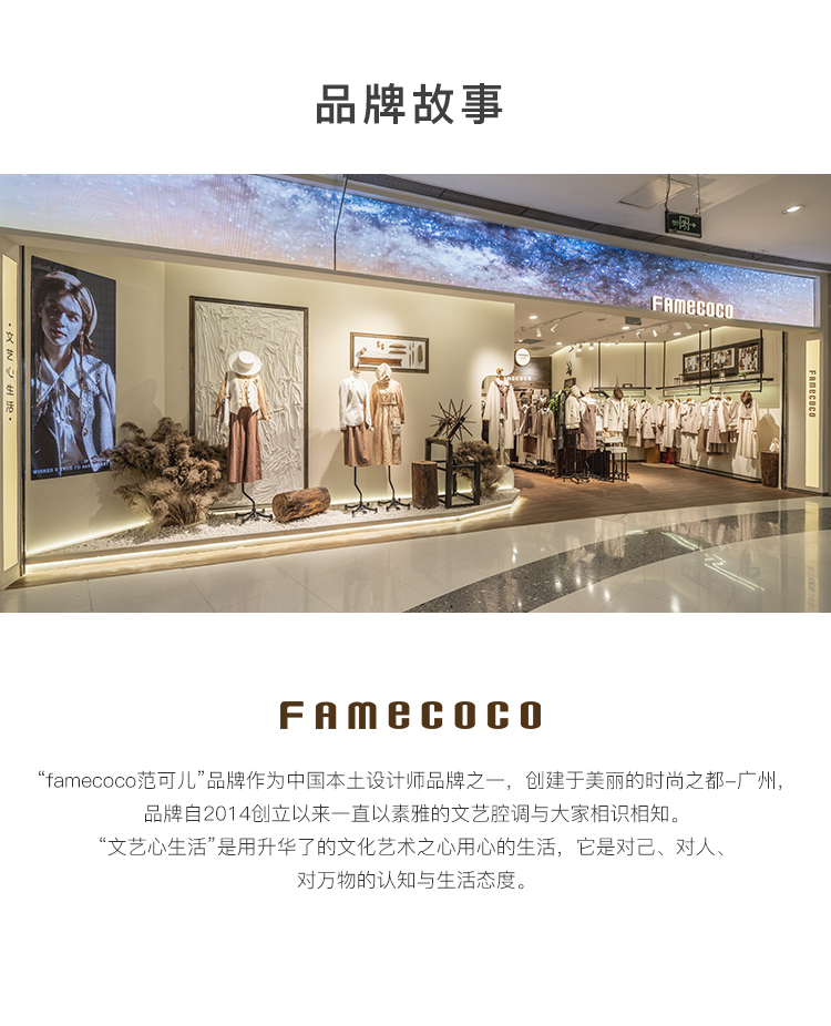 - Famecoco作为中国本土设计师品牌之一的她,创建于美丽的时尚花都广州,自2013年创立以来,一直致力于打造优雅、知性、文艺的穿着理念。