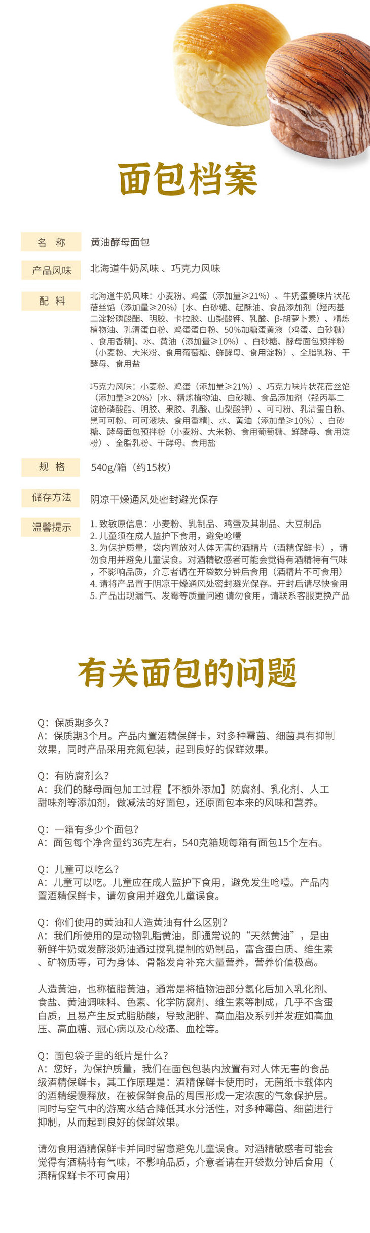 3、为保护质量,我们在面包包装内放置有对人体无害的食品级酒精保鲜卡,其工作原理是:酒精保鲜卡使用时,无菌纸卡载体内的酒精缓慢释放,在被保鲜食品的周围形成一定浓度的气象保护层。同时与空气中的游离水结合降低其水分活性,对多种霉菌、细菌进行抑制,从而起到良好的保鲜效果。