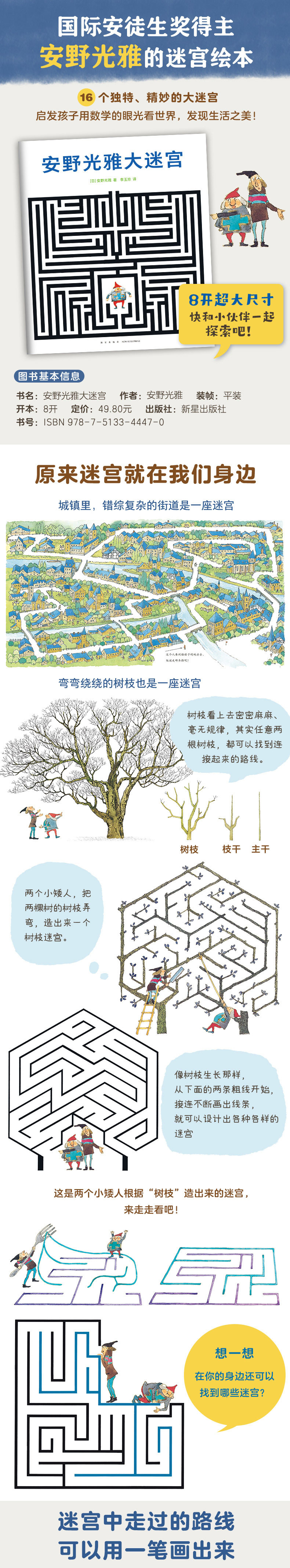 纵横交错的街道、弯弯绕绕的树枝、绳子编织而成的花纹,还有古寺庙墙壁上的神秘图案……原来这些都可以看作是迷宫!两个小矮人被弄得晕头转向,怎么才能从迷宫里走出去呢?试着用手指走一走吧!