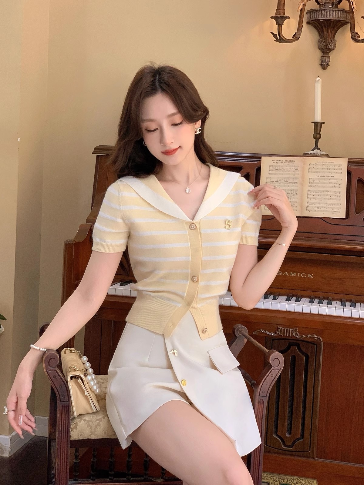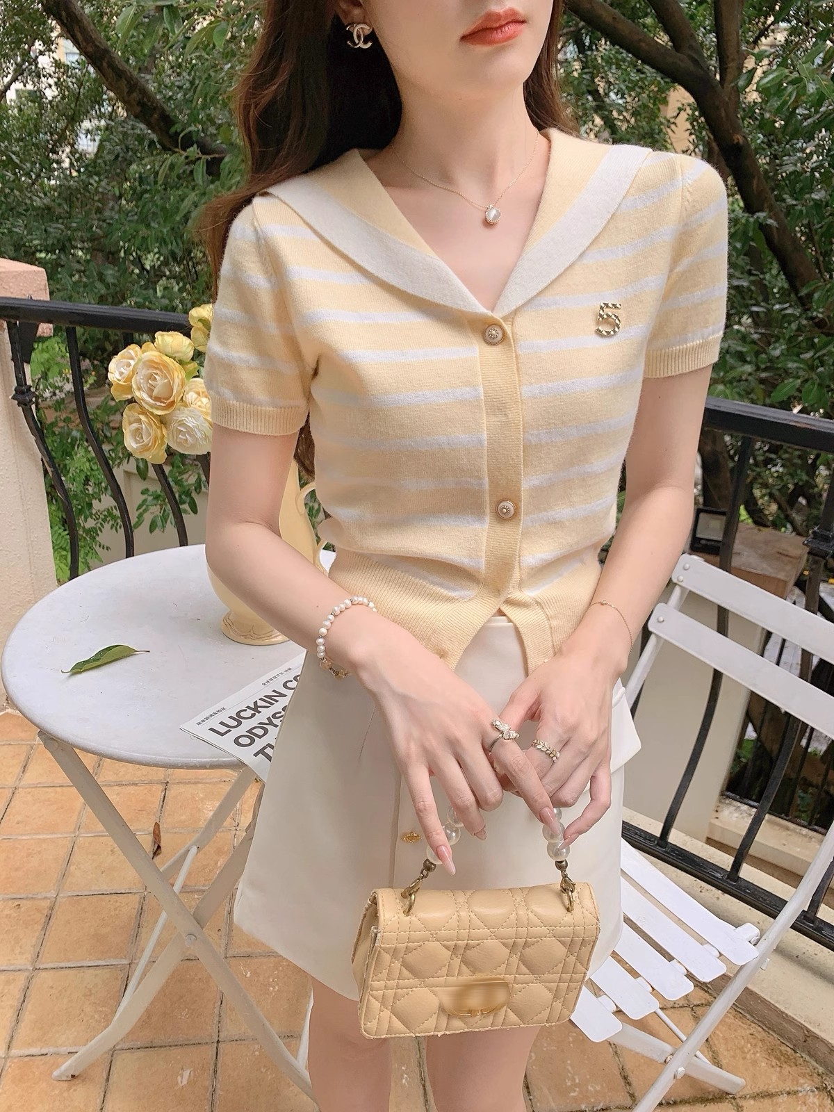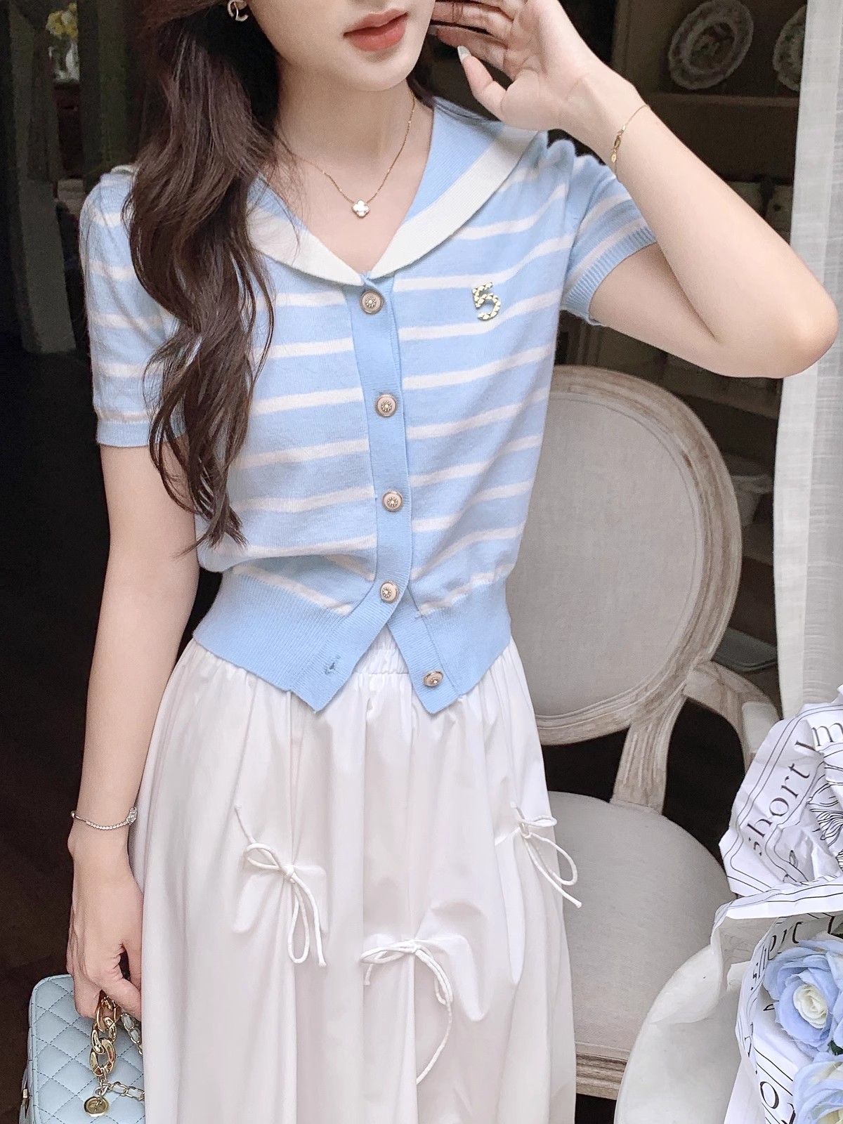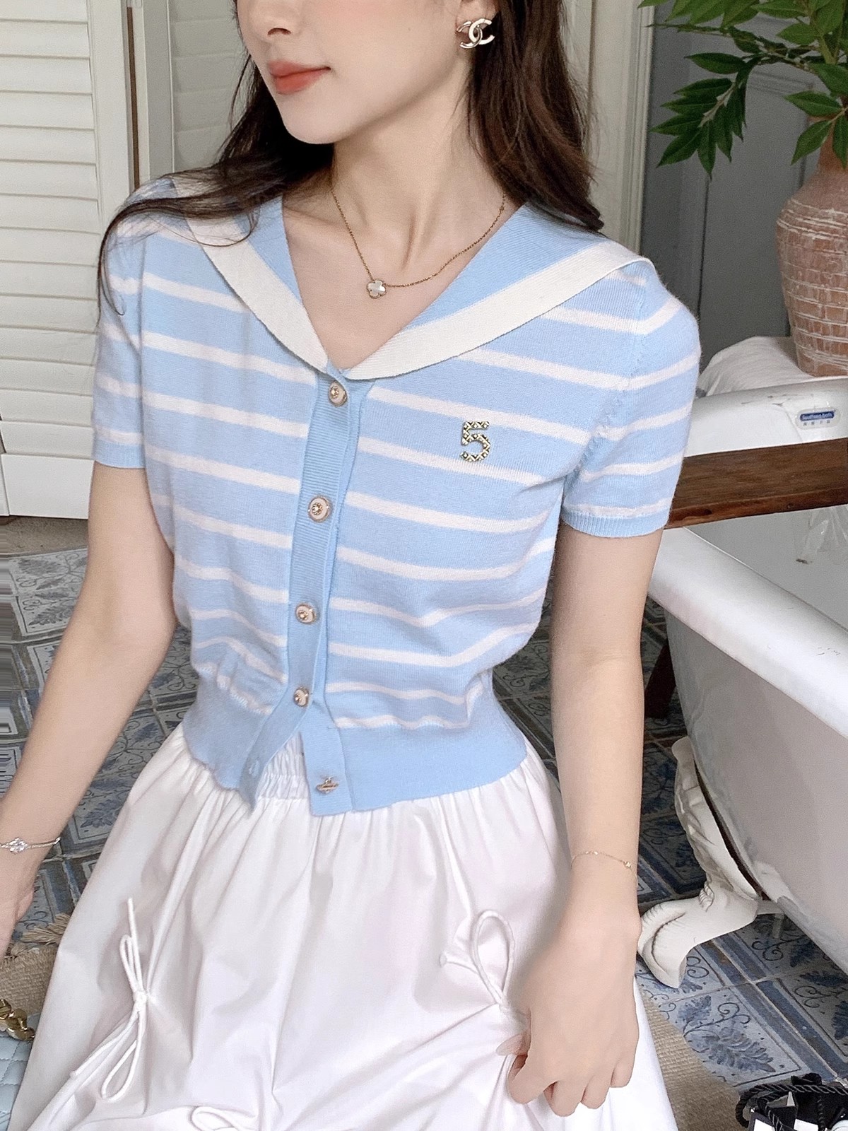 张心子【香芒甜茶】海军领减龄条纹针织上衣女夏季新款法式polo衫 U2406016