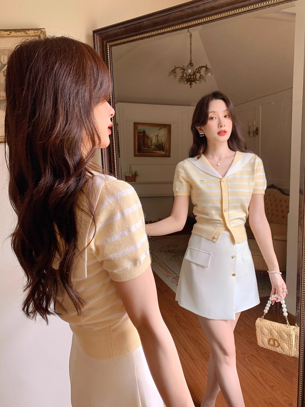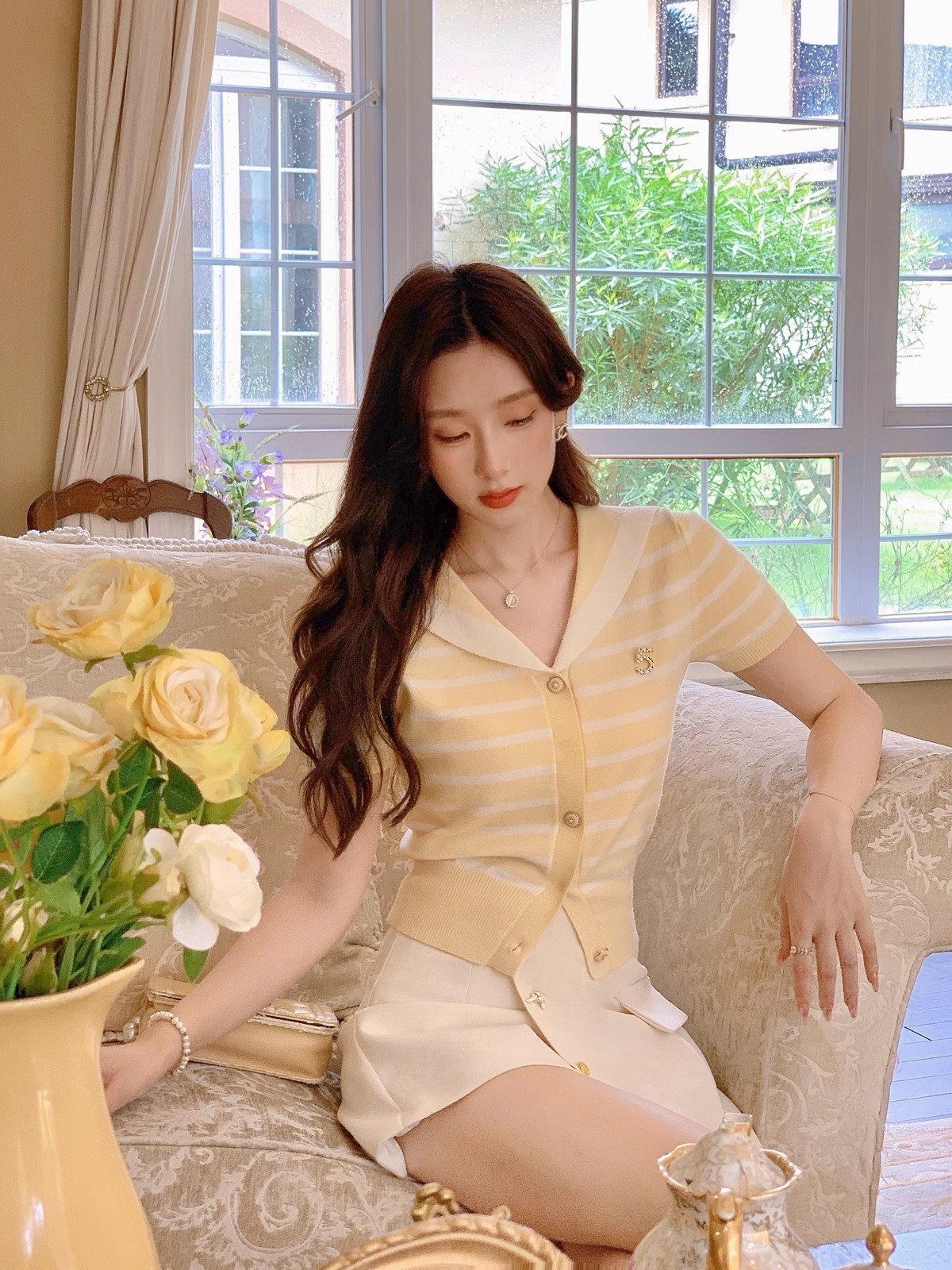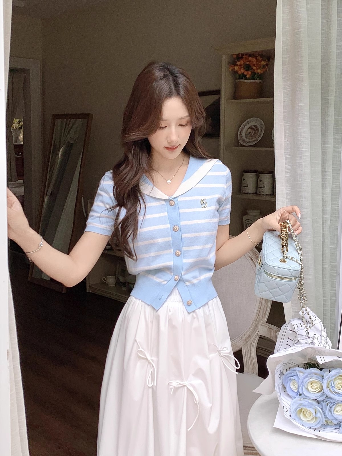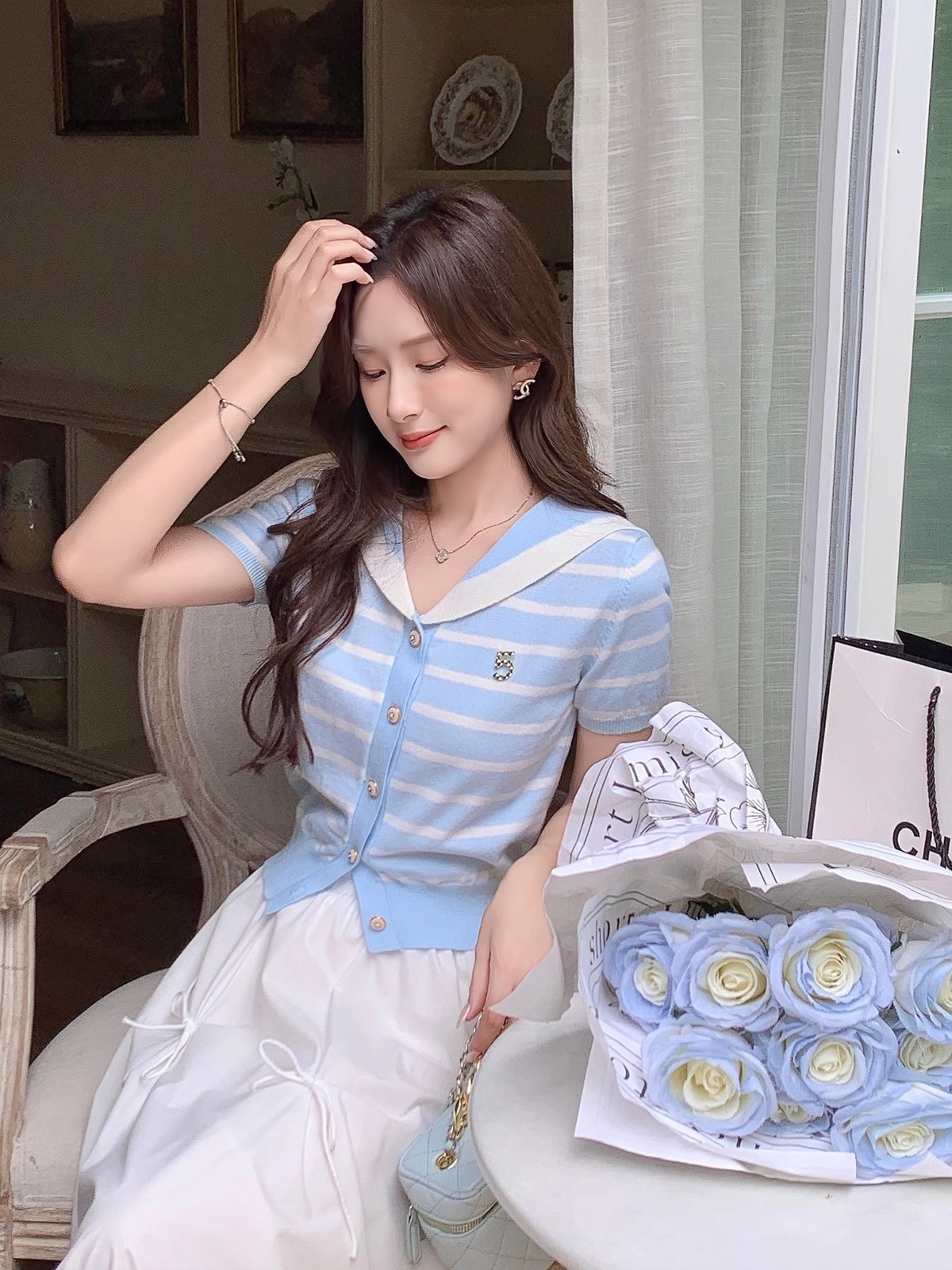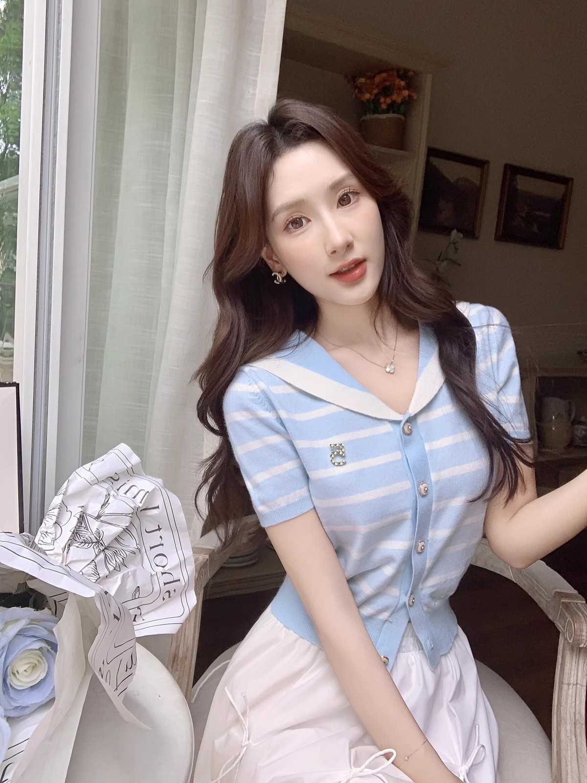 张心子【香芒甜茶】海军领减龄条纹针织上衣女夏季新款法式polo衫 U2406016