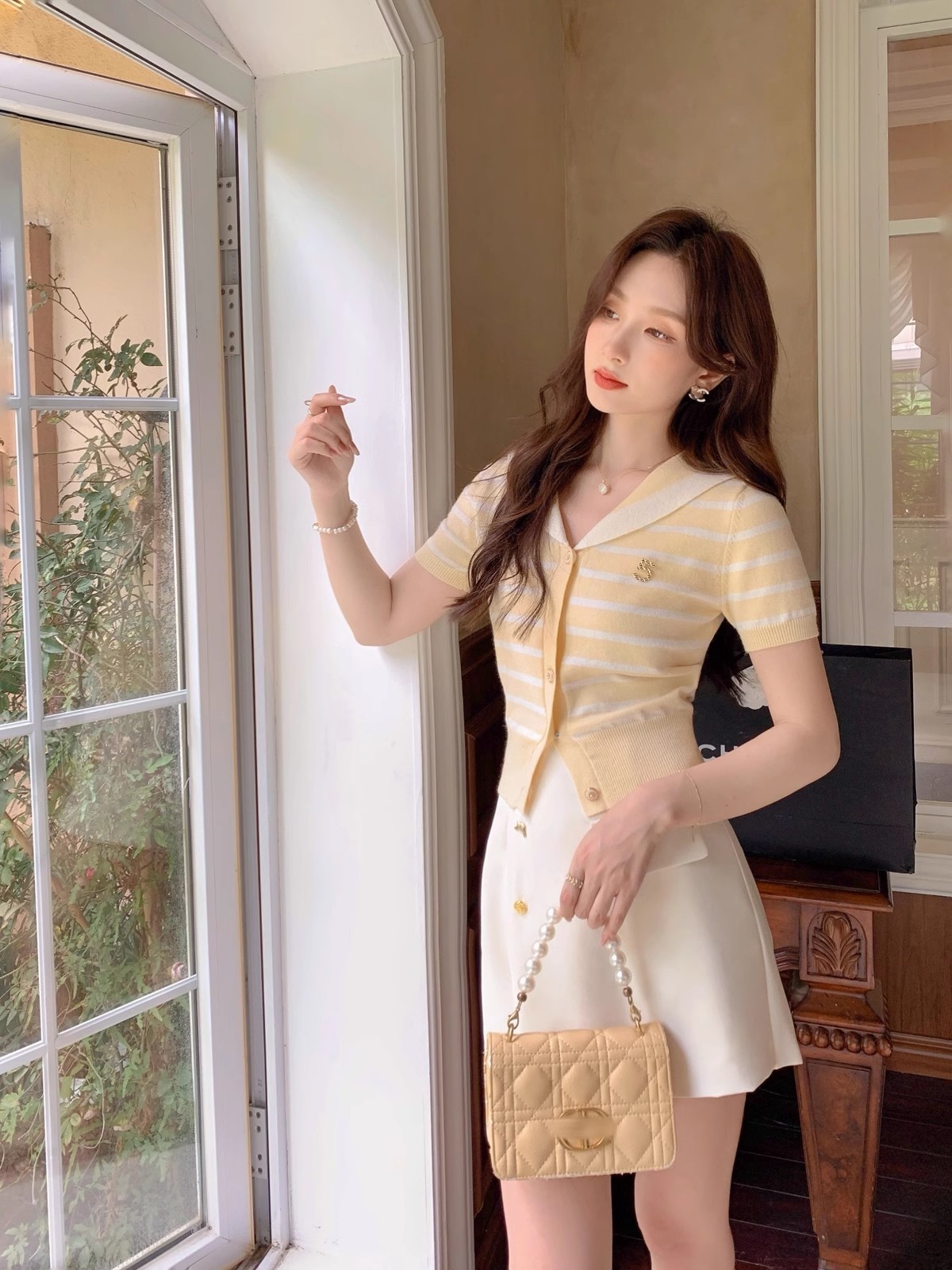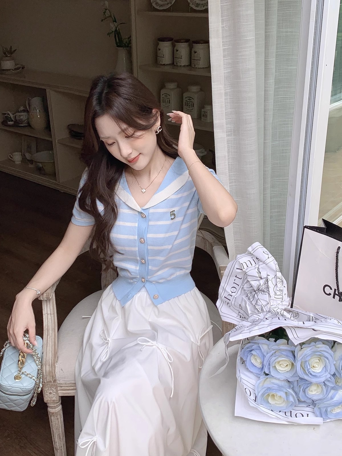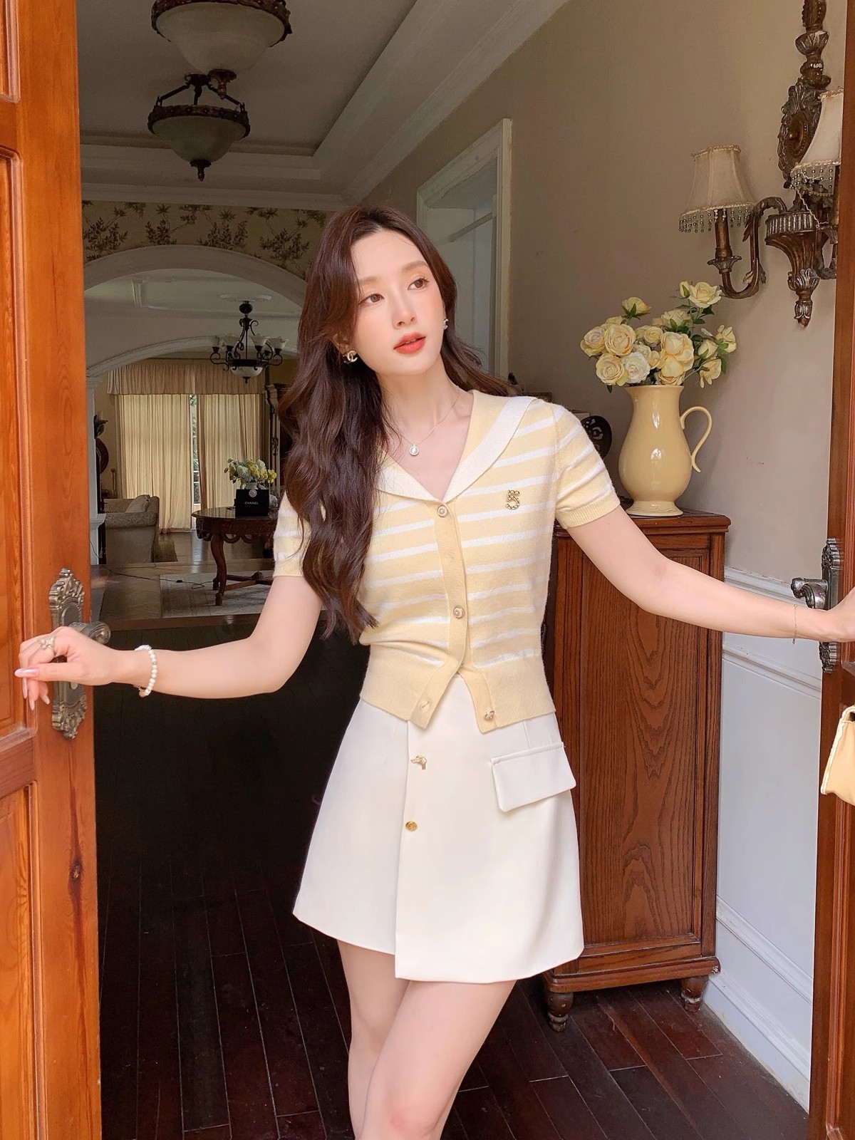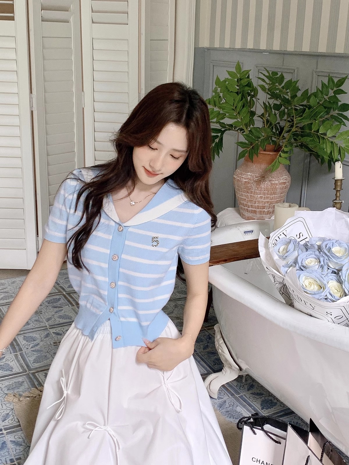 张心子【香芒甜茶】海军领减龄条纹针织上衣女夏季新款法式polo衫 U2406016