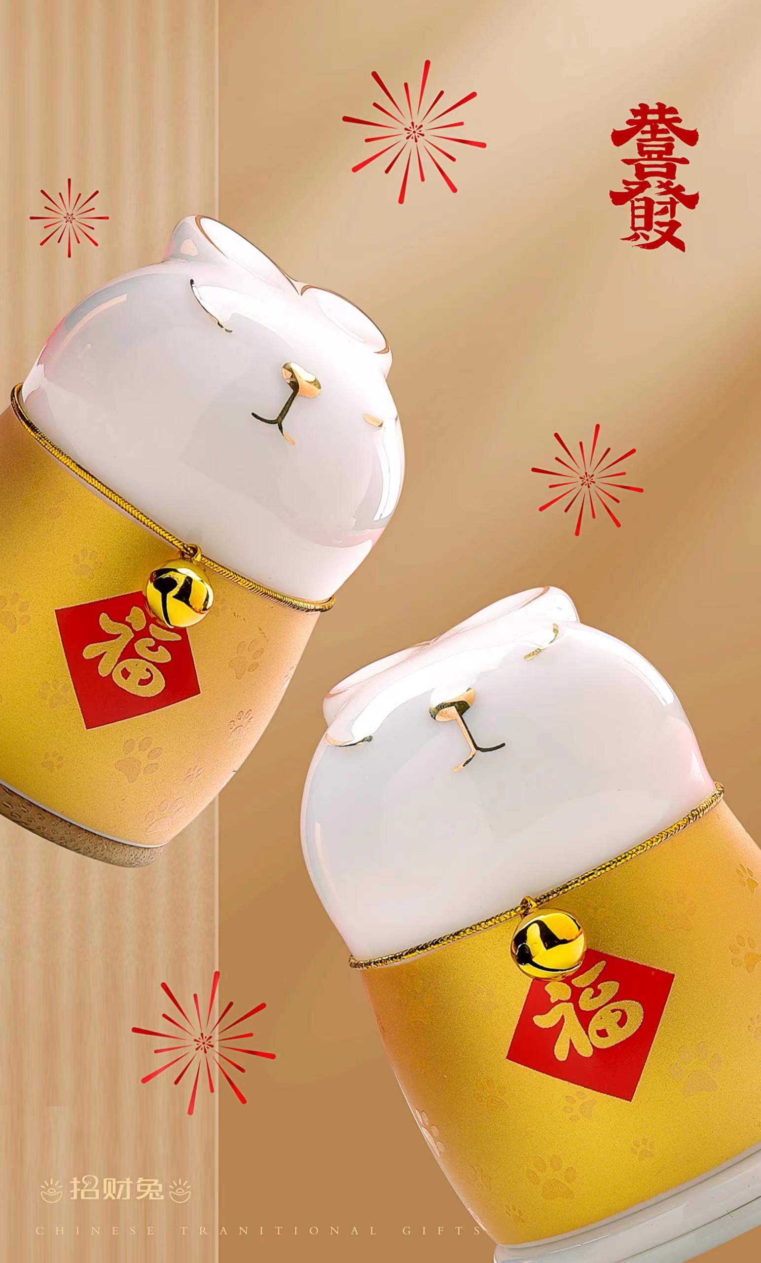 福兔寓意着美意连连,福寿永续,兔子善于跳跃,在障碍面前总是一跃而过,象征人们在面对困难时要积极向上,鼓足勇气战胜困难,也就是寓意超越自我,迈向成功、心想事成。