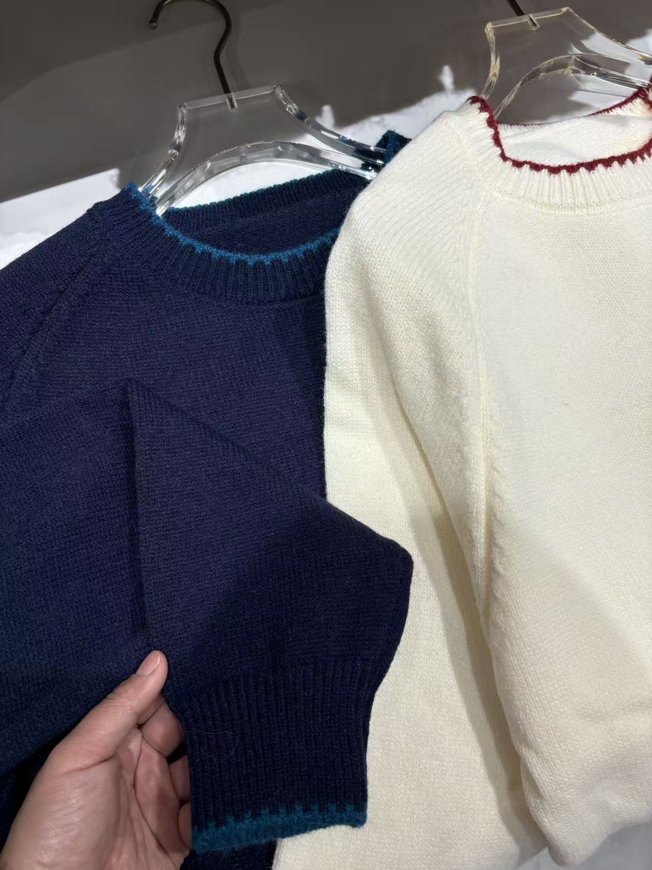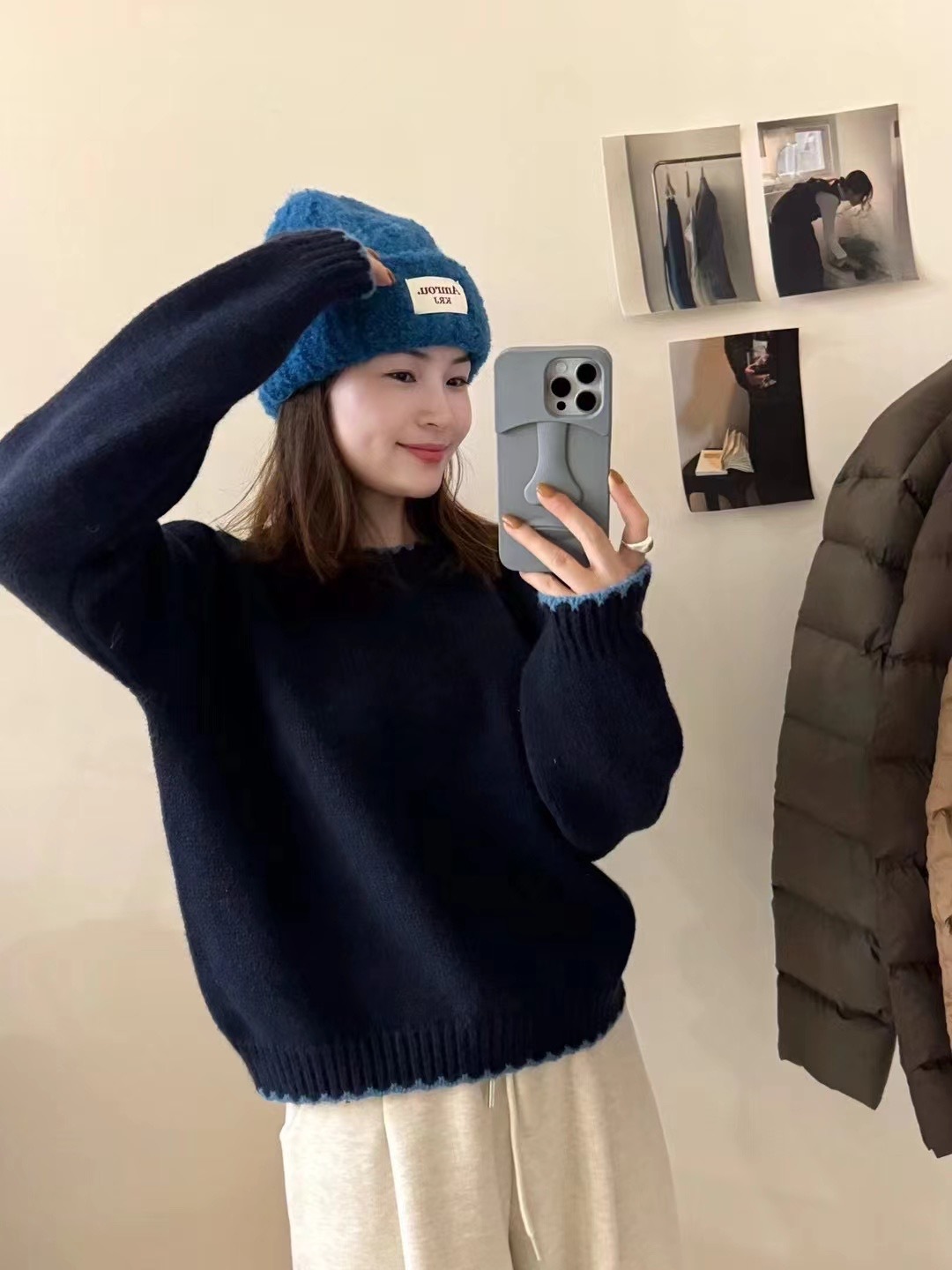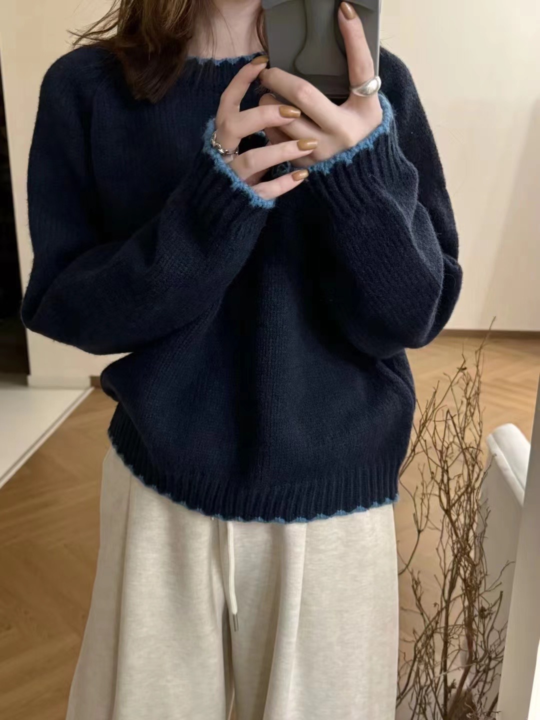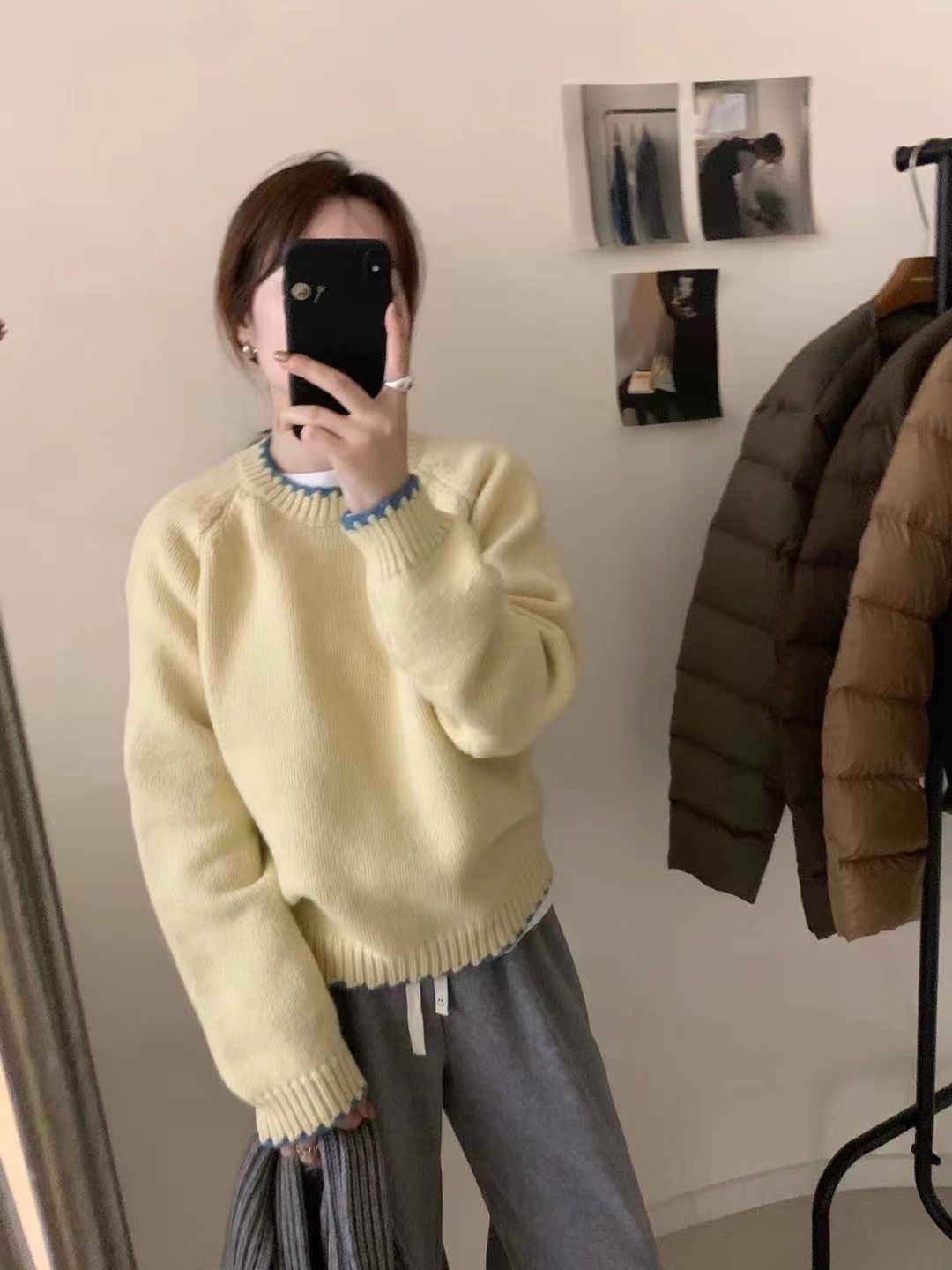 【YW】无忧购韩版温柔风撞色勾边圆领套头毛衣女宽松百搭针织衫8116#(截单后5-7天发货)