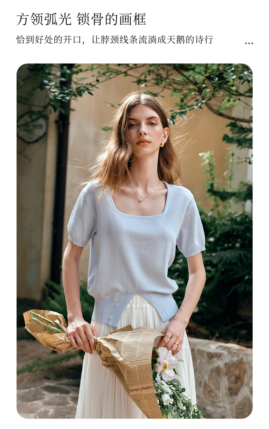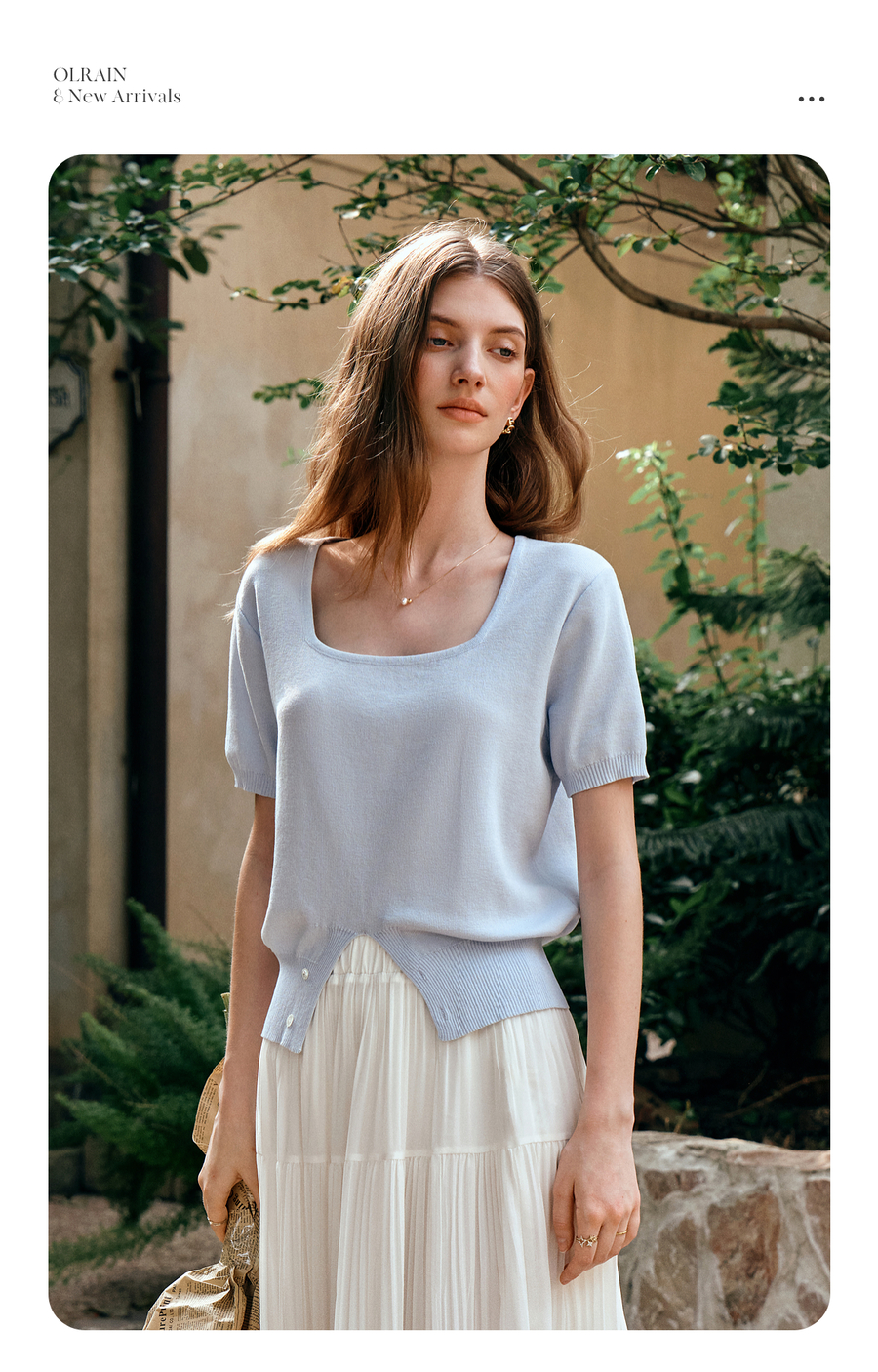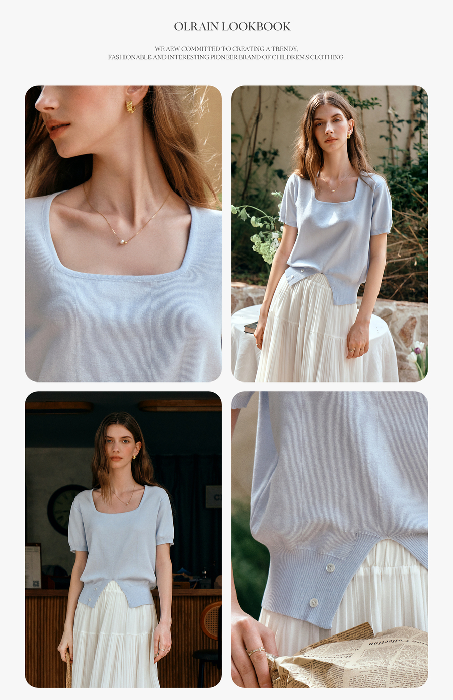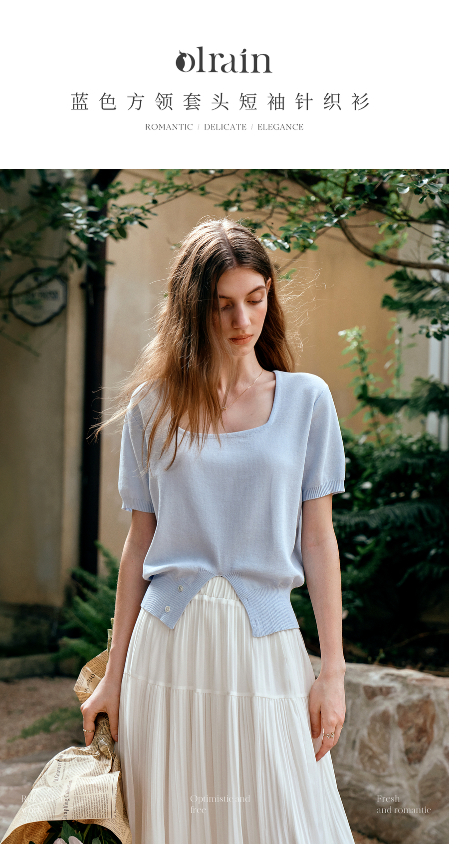 OLrain欧芮儿蓝色方领套头短袖针织衫女夏2025新款不规则下摆上衣