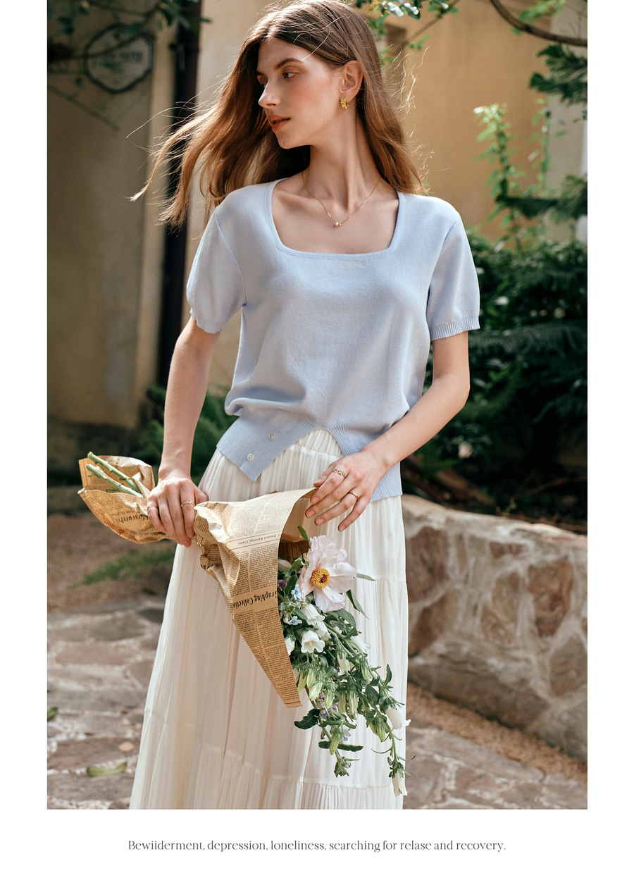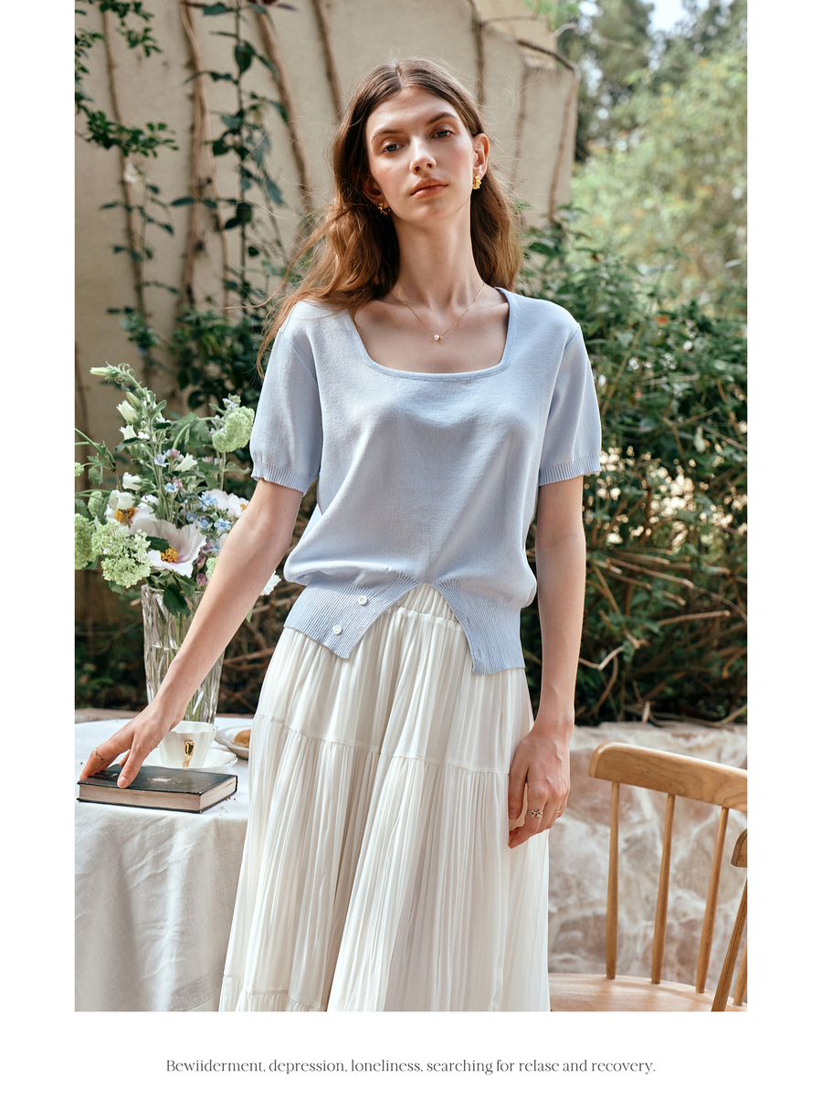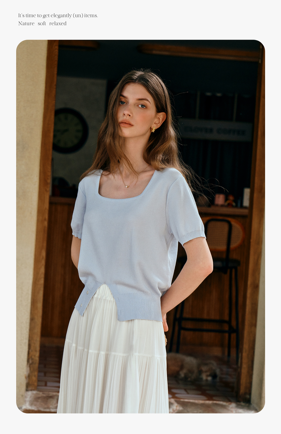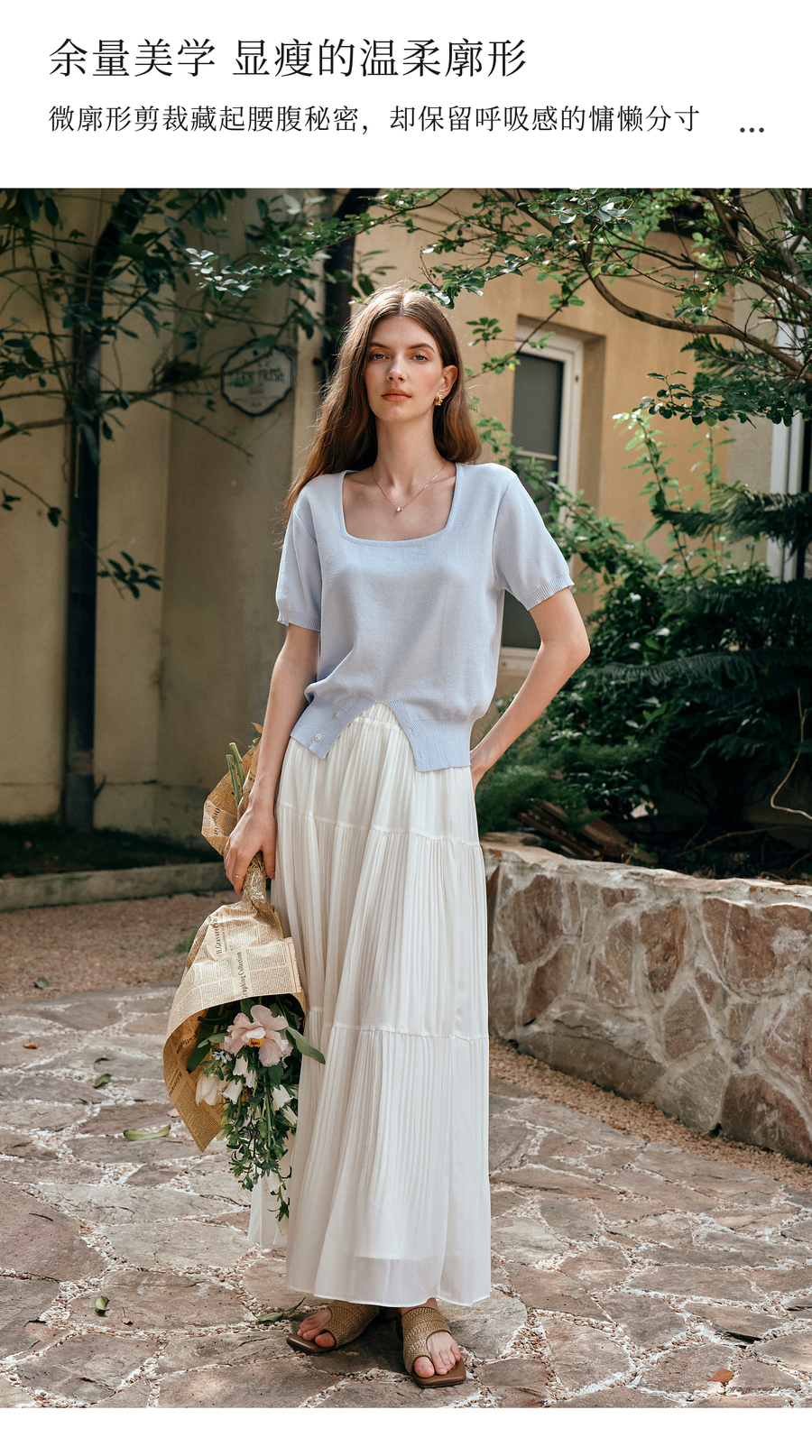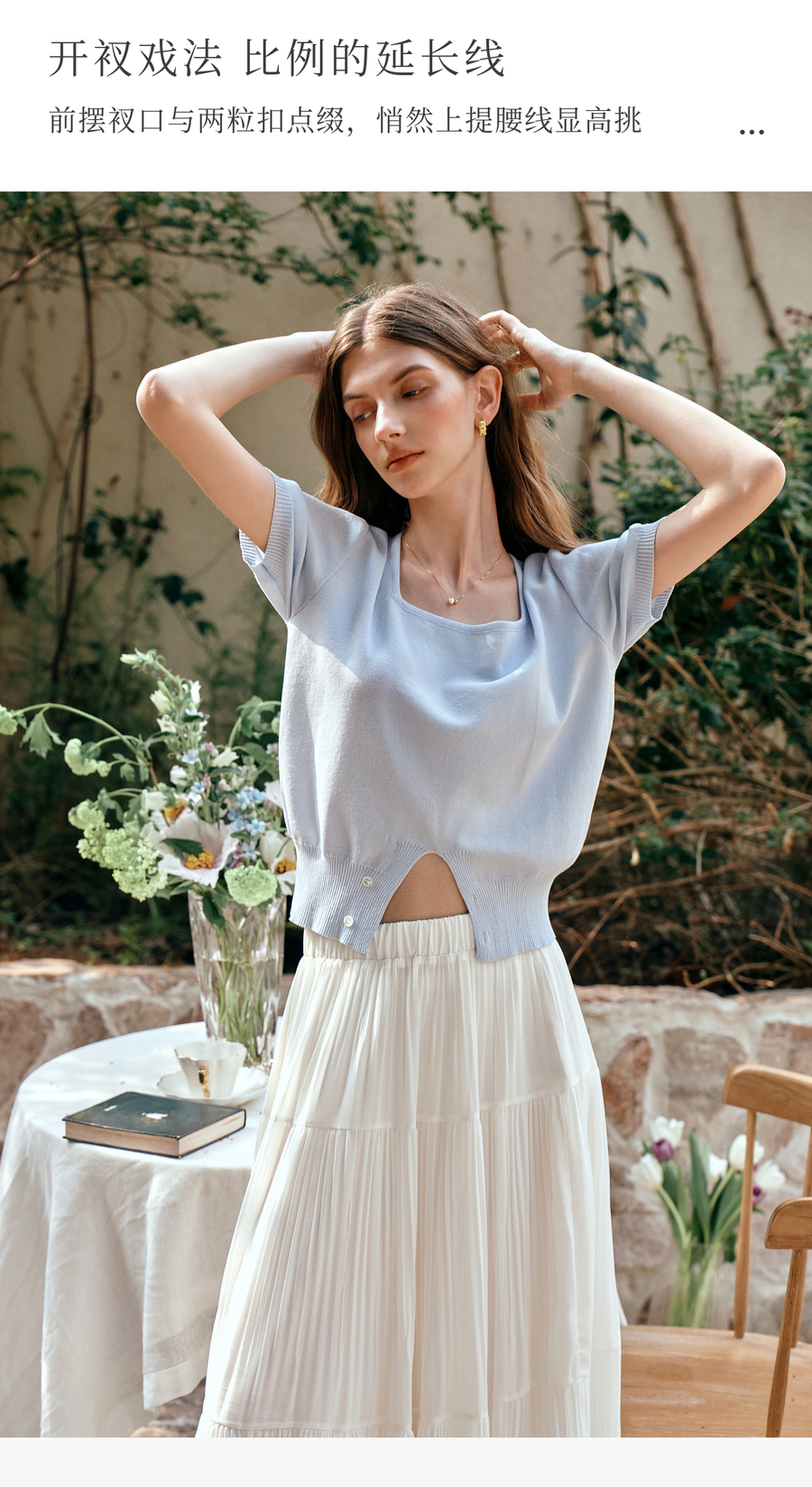 OLrain欧芮儿蓝色方领套头短袖针织衫女夏2025新款不规则下摆上衣