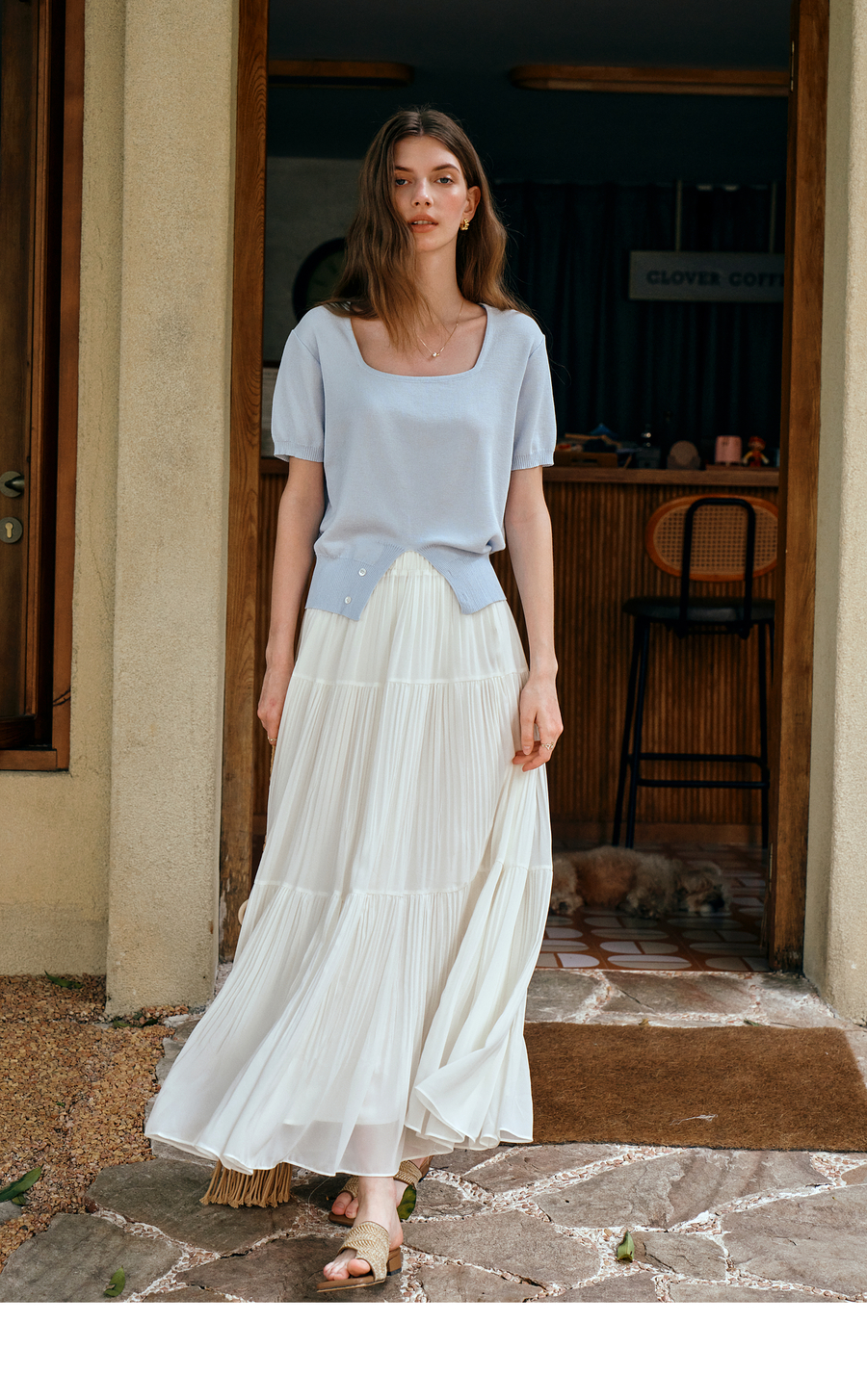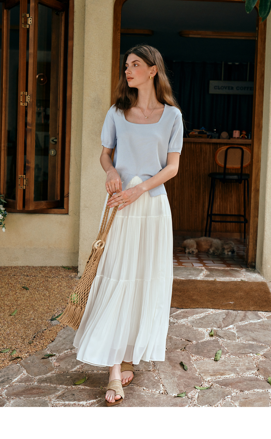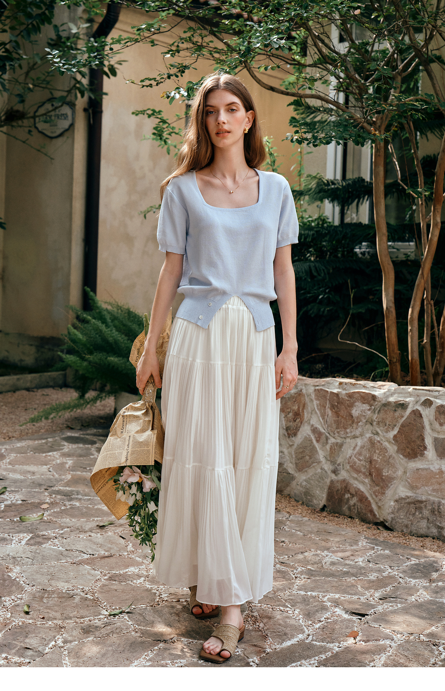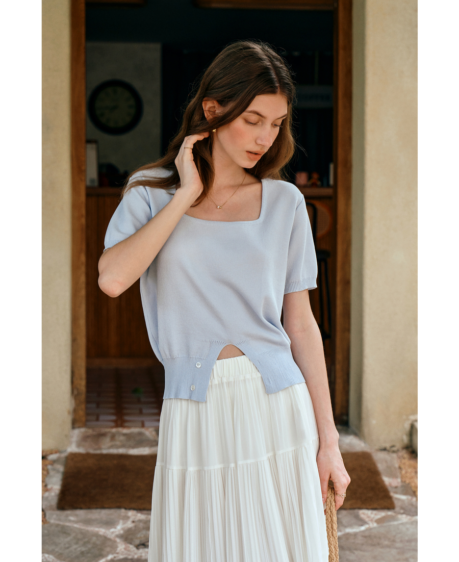 OLrain欧芮儿蓝色方领套头短袖针织衫女夏2025新款不规则下摆上衣