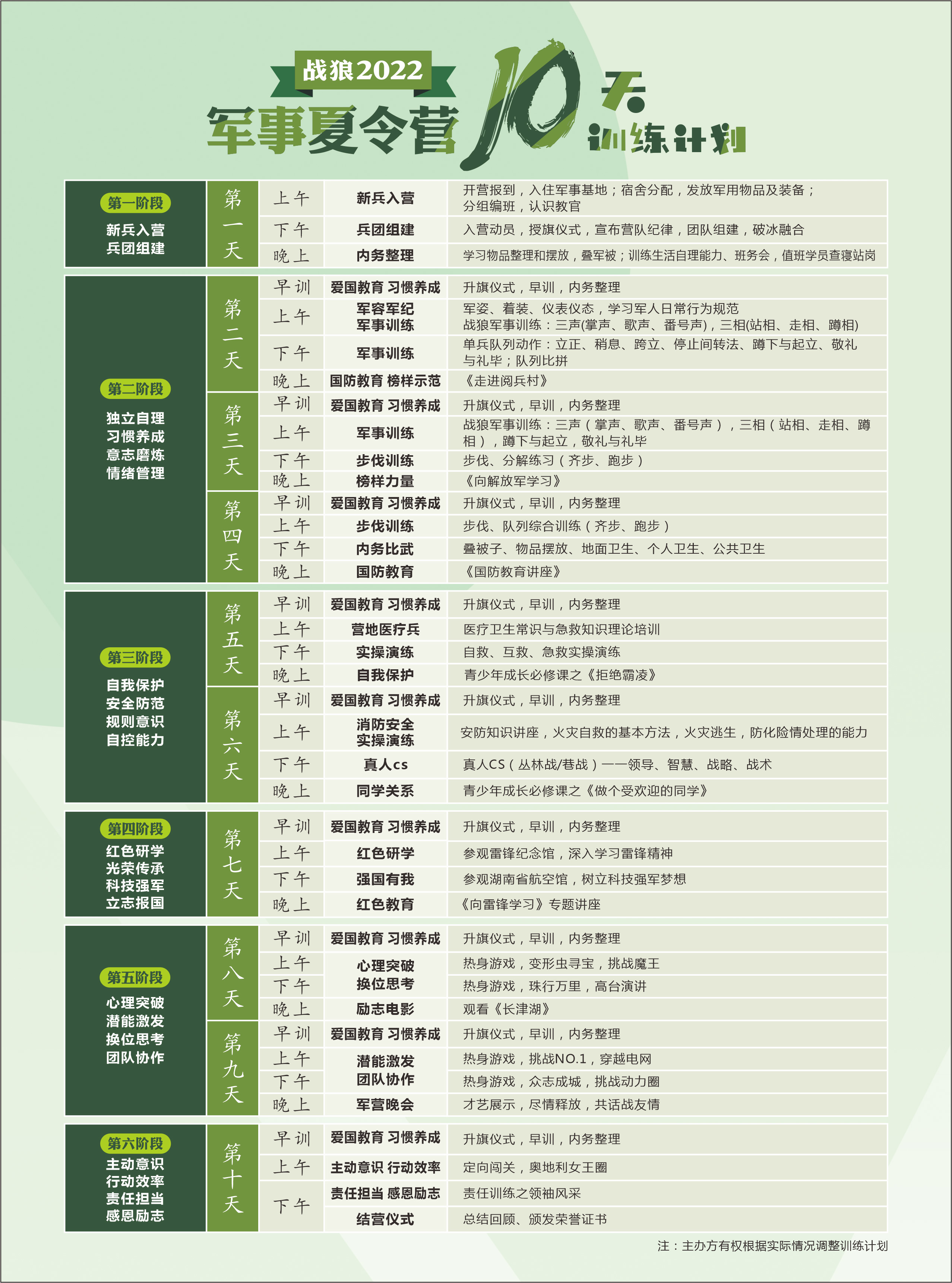 夏令营活动采用全封闭军事化管理,营员统一食宿,活动期间不安排家长探视;