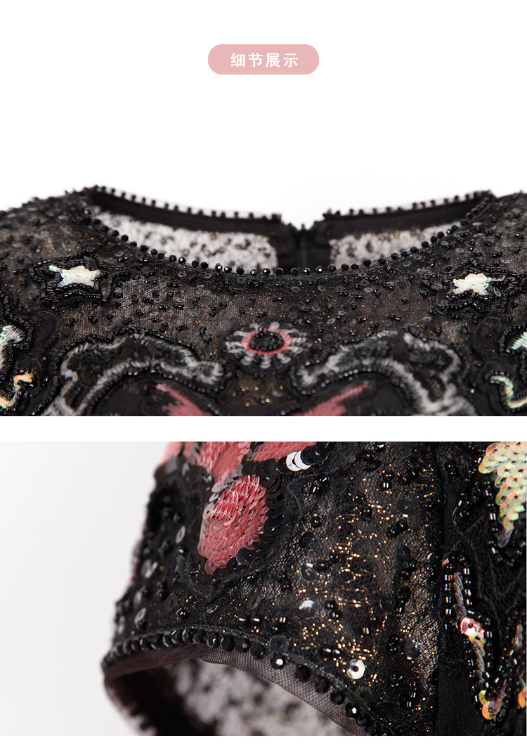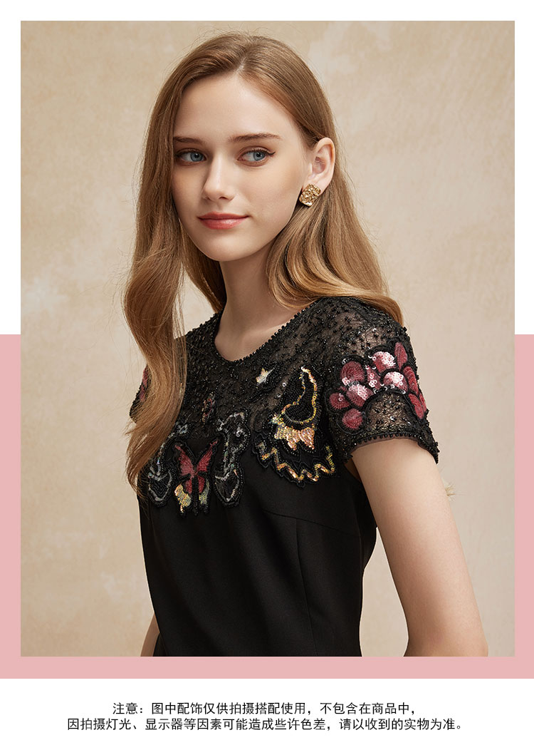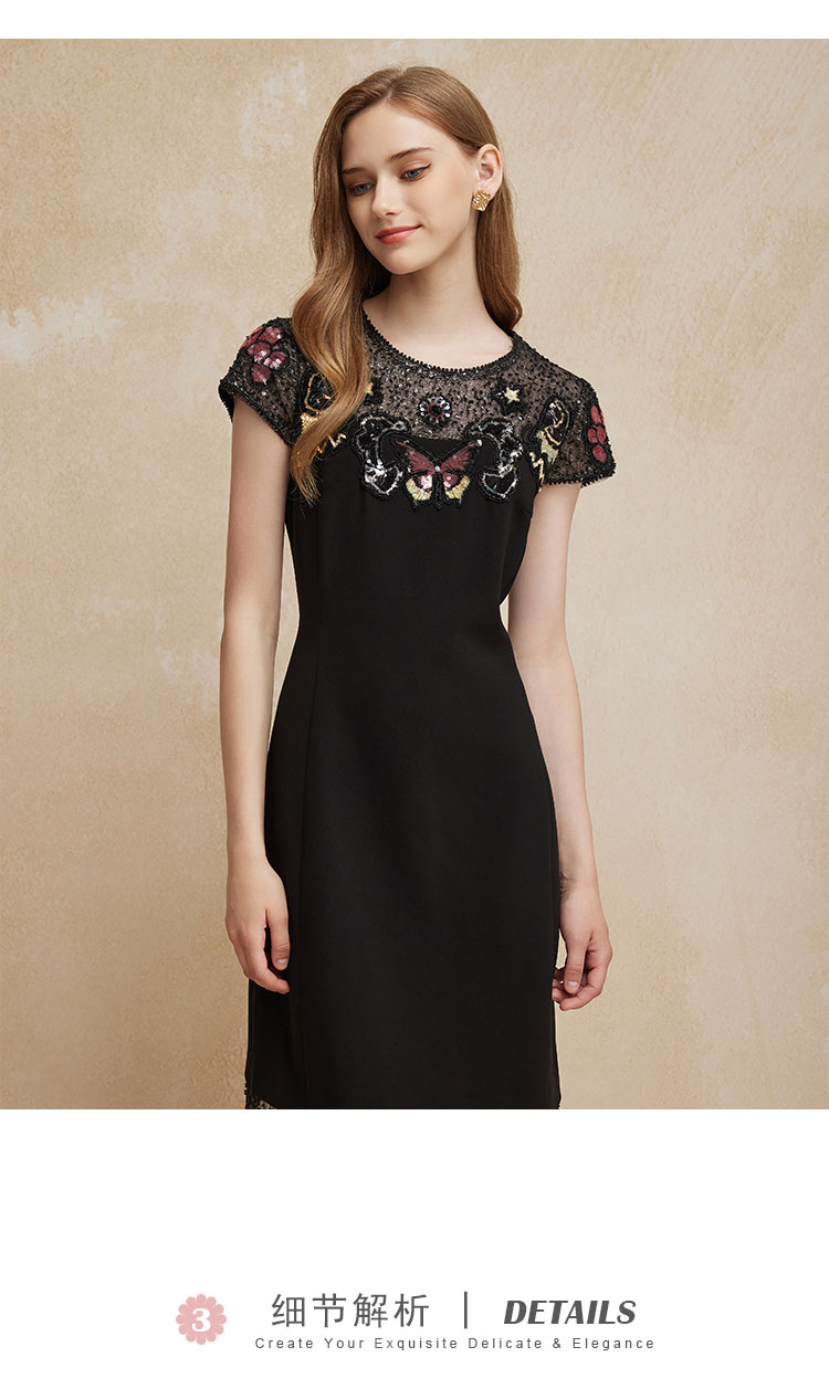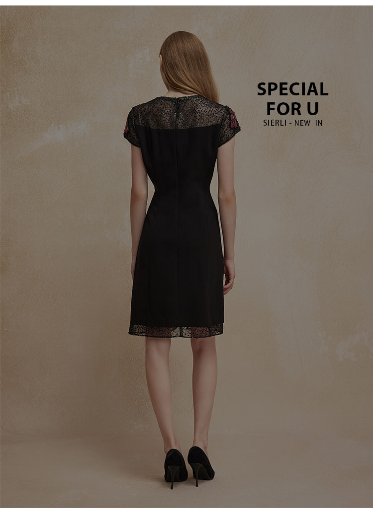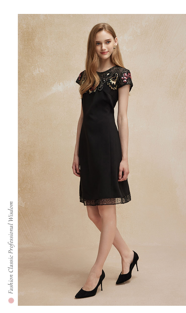 PF83A斯尔丽瑟俪夏季新款高贵优雅蕾丝珠片时尚绣花A摆小黑裙礼裙