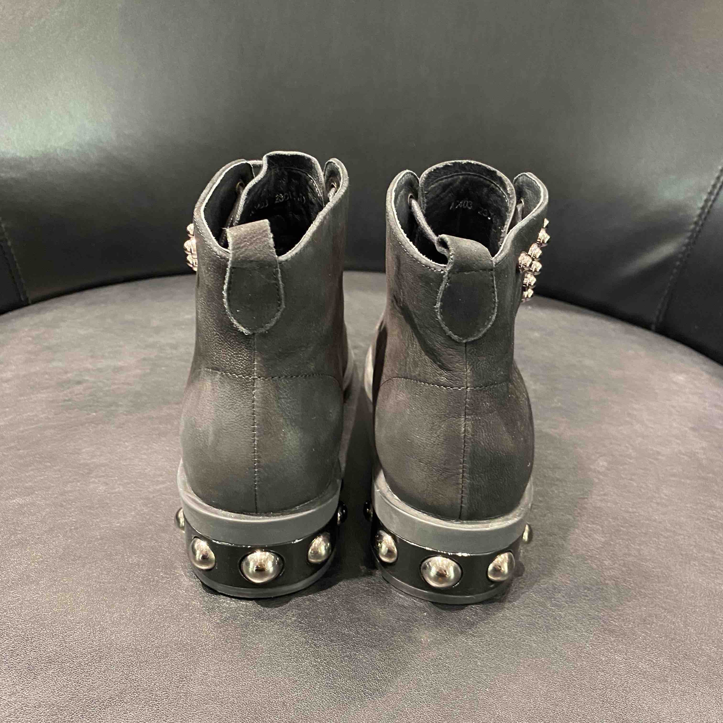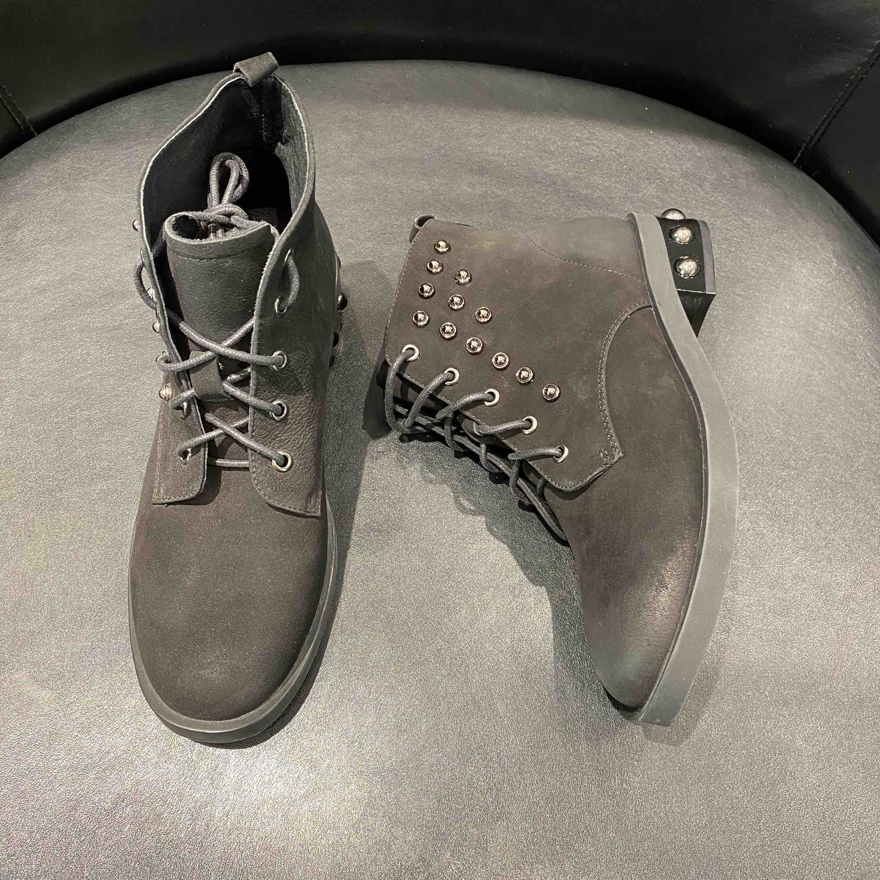 LFGJ 3872 头层牛皮圆头英伦金属铁链铆钉重工马丁靴机车靴短靴系带
