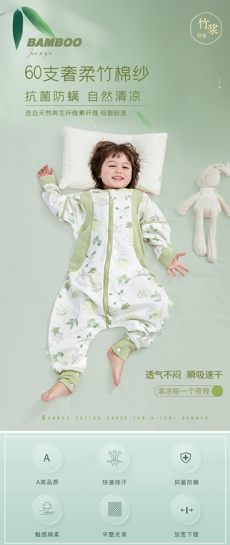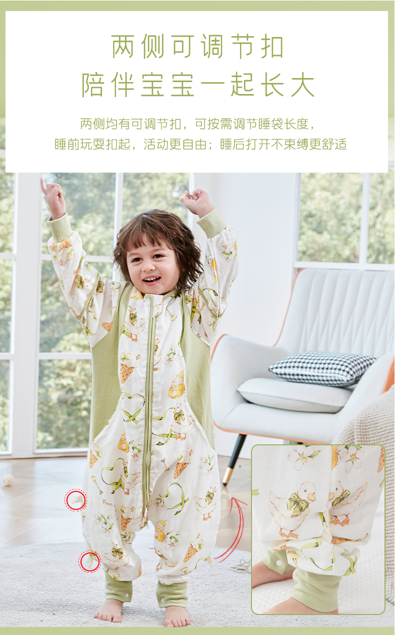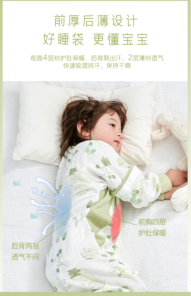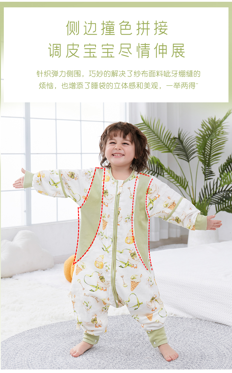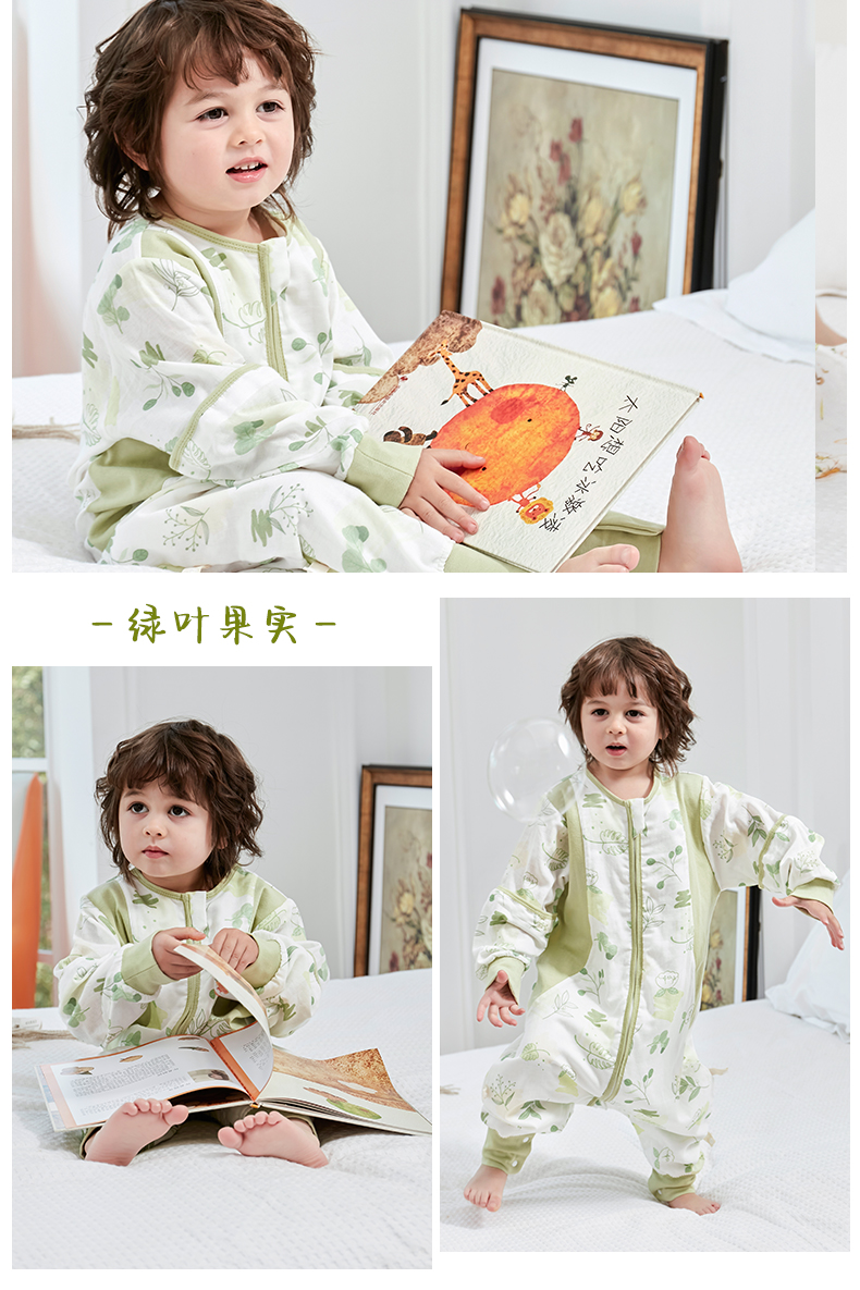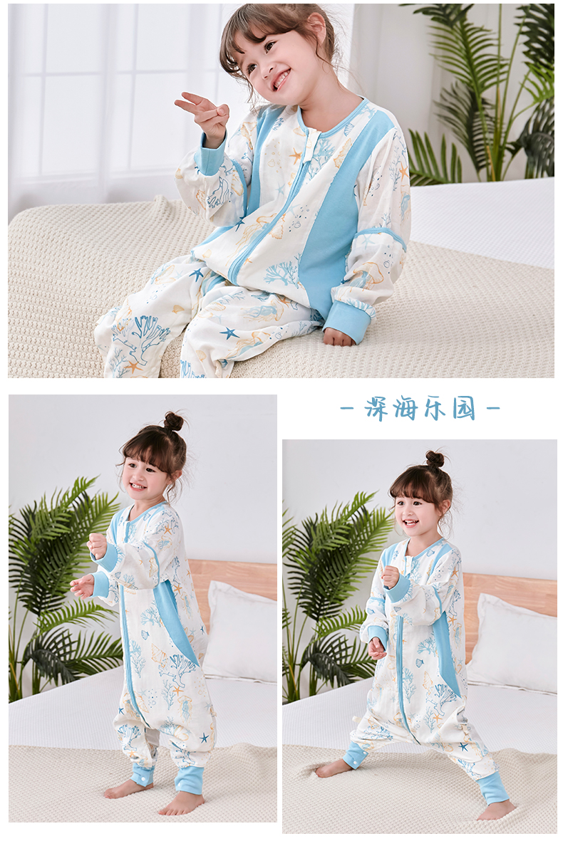 盼盼树儿童春夏儿童自然清凉柔竹面纱吸湿快干透气不闷睡袋婴儿竹纤维分腿睡袋宝宝抗菌睡衣可拆袖80-120