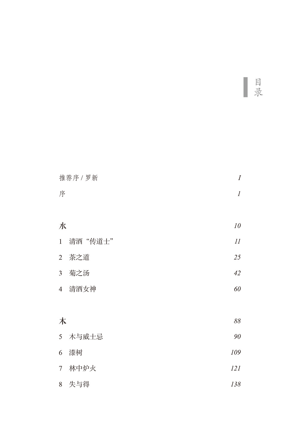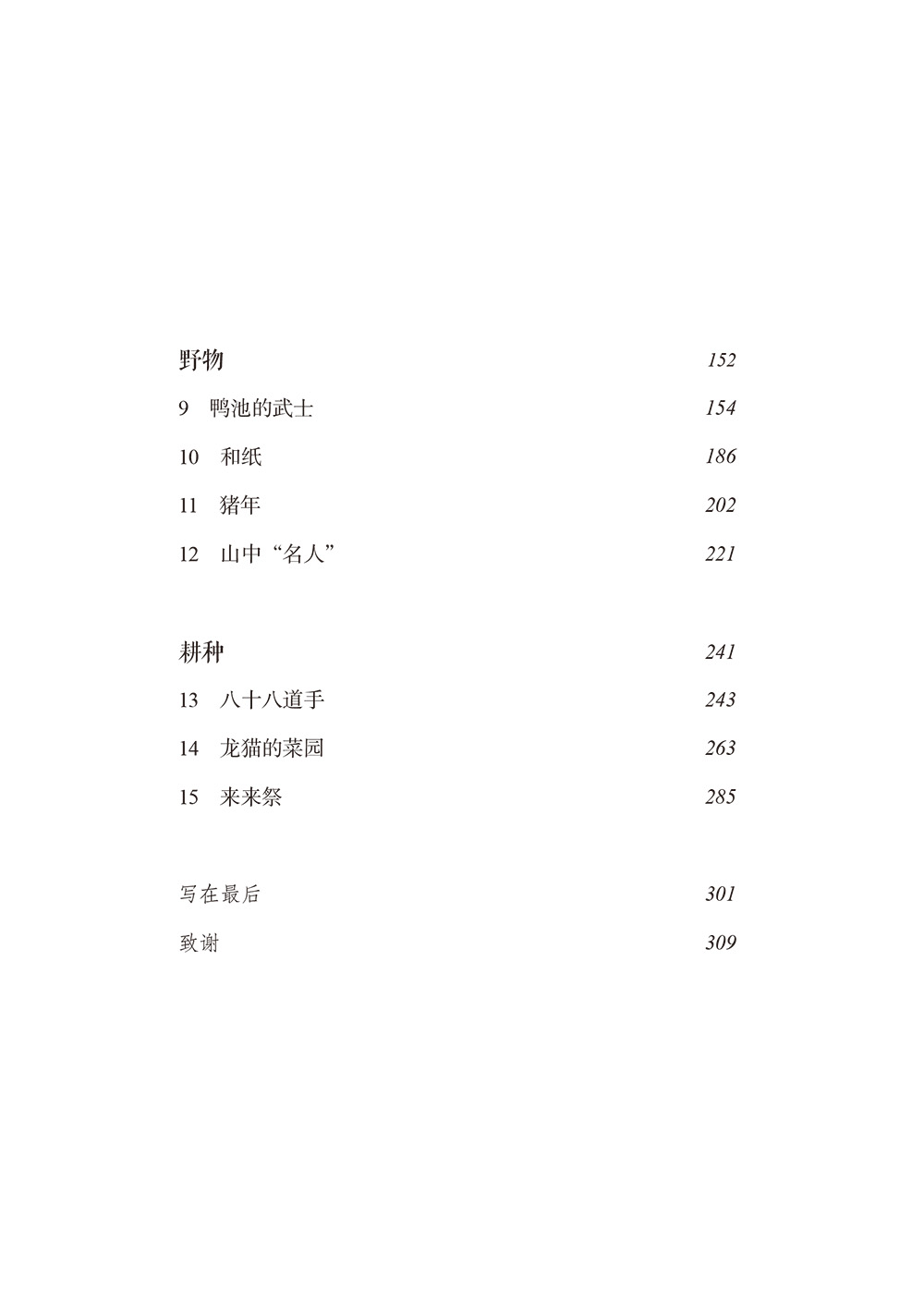 水,木与野物(Water, Wood, and Wild Things)三大门类+耕作(cultivation),共15章节,分别介绍清酒、茶道和温泉、木旋艺术、漆工技艺、烧炭、木托盘、古法捕猎野鸭、雁皮和纸、捕猎野猪、采摘野菜、种稻谷、种蔬菜和年度祭祀来来祭等。