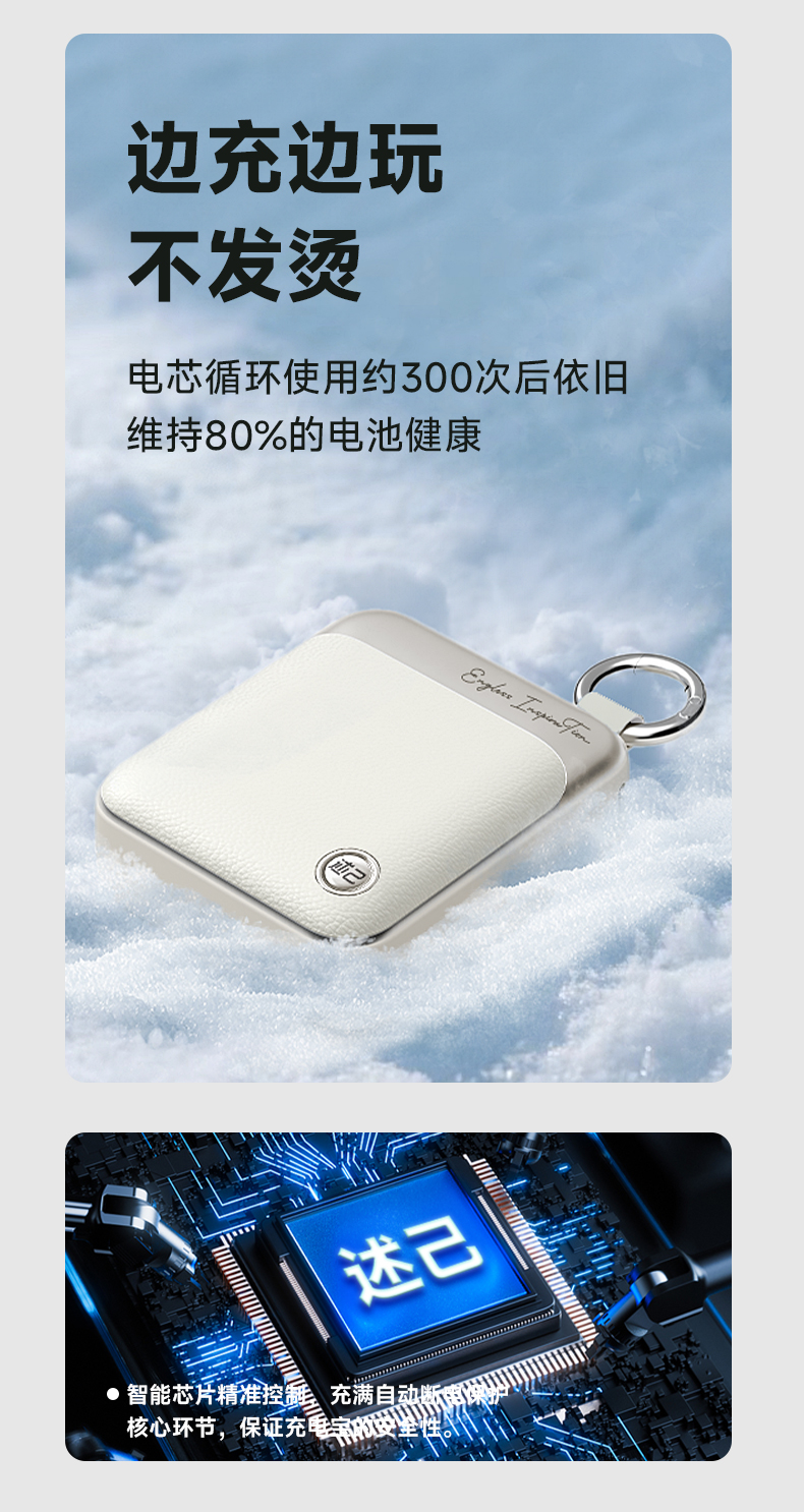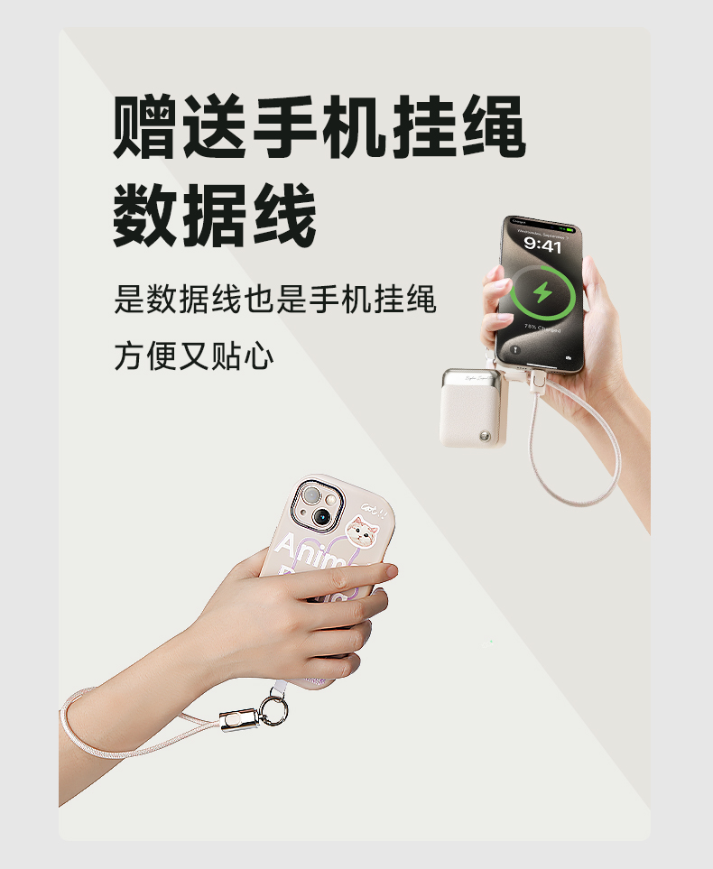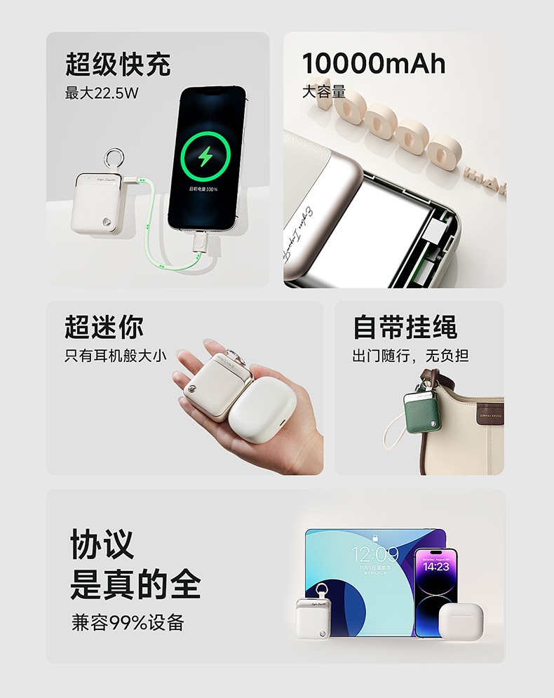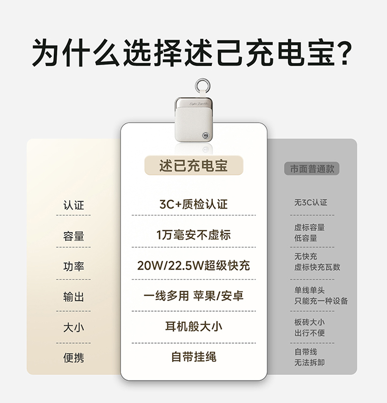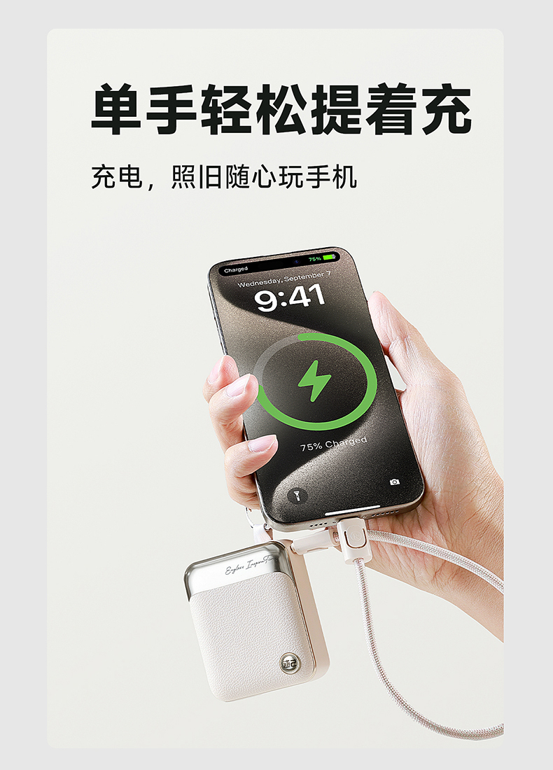 【3C充电宝】述己轻巧充电宝自带线快充超薄便携大容量10000毫安移动电源适用苹果15iPhone华为小米可上飞机