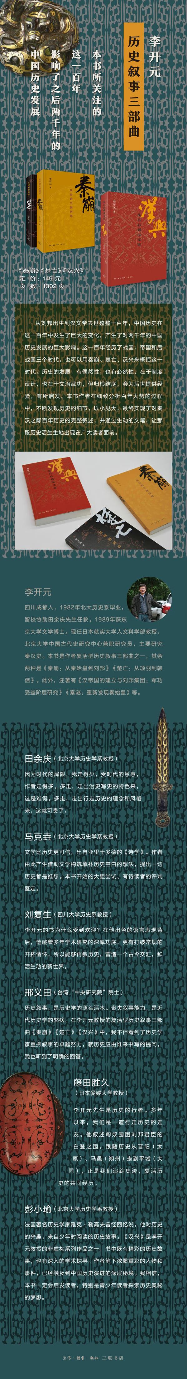 李开元 ,四川成都人,1982年北京大学历史系毕业,留校担任田余庆先生助教。1989年获东京大学文学博士。现任日本就实大学人文科学部教授,北京大学中国古代史研究中心兼职研究员,主要研究秦汉史。除本书姊妹篇《秦崩:从秦始皇到刘邦》外,还著有《汉帝国的建立与刘邦集团:军功受益阶层研究》(2000)、《秦谜:重新发现秦始皇》(2015)等。