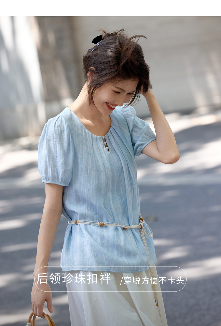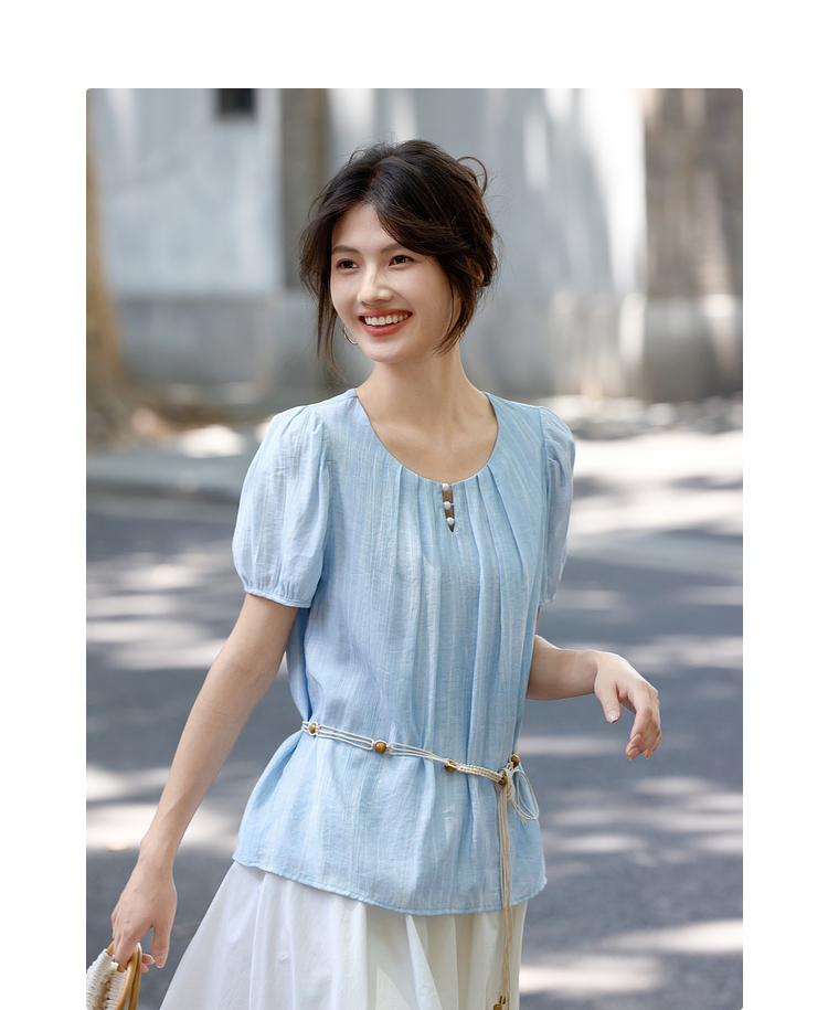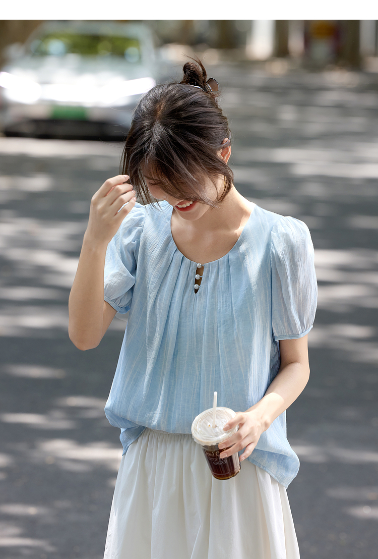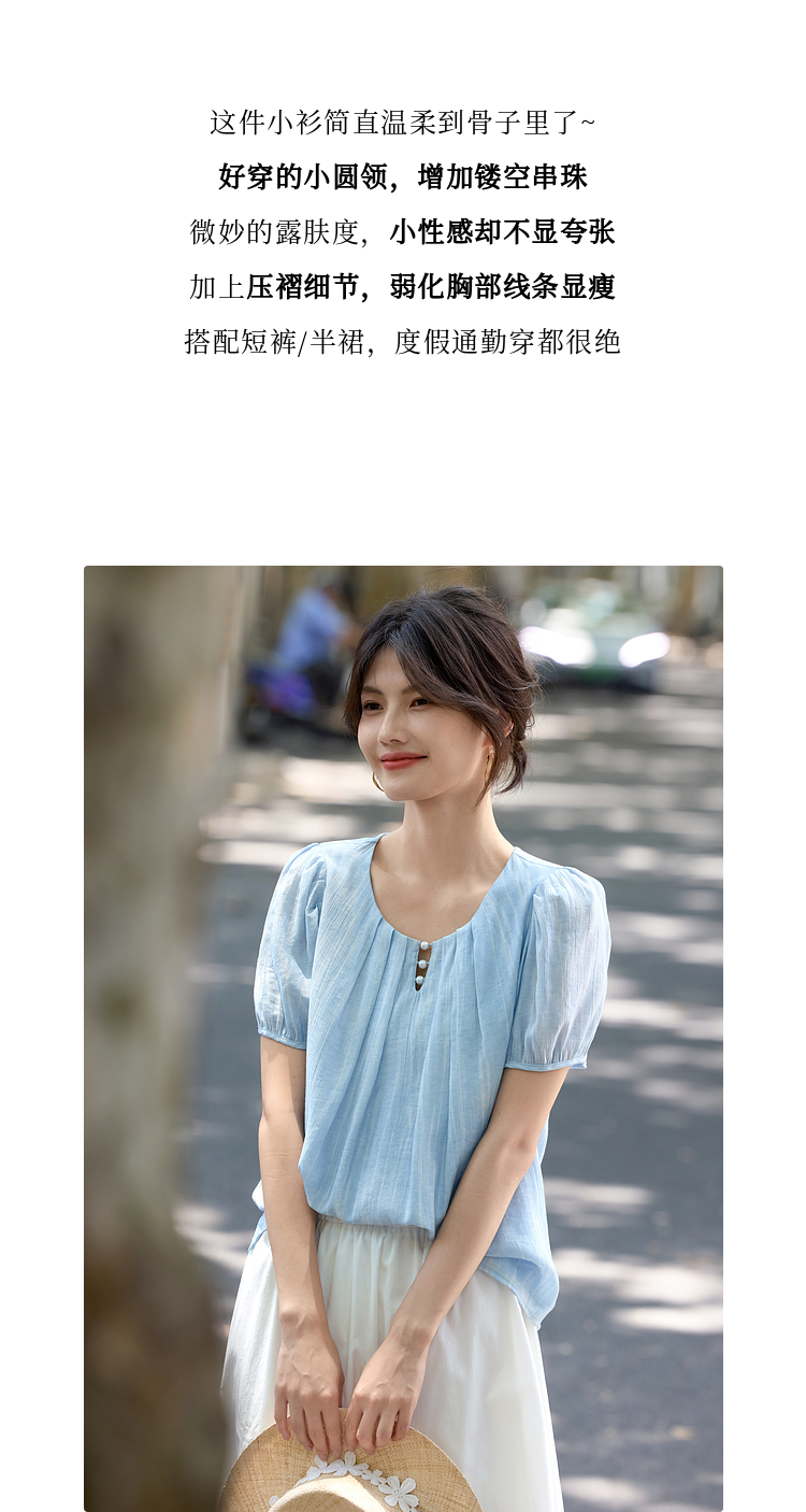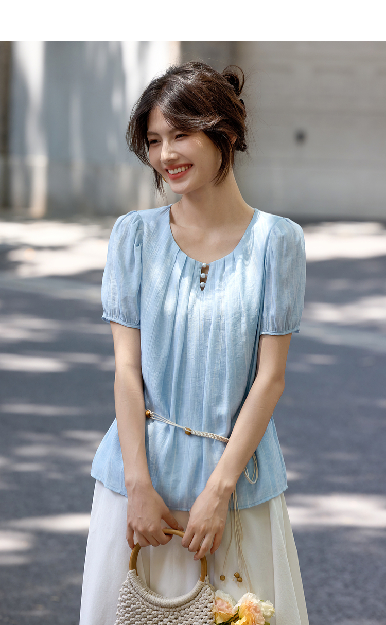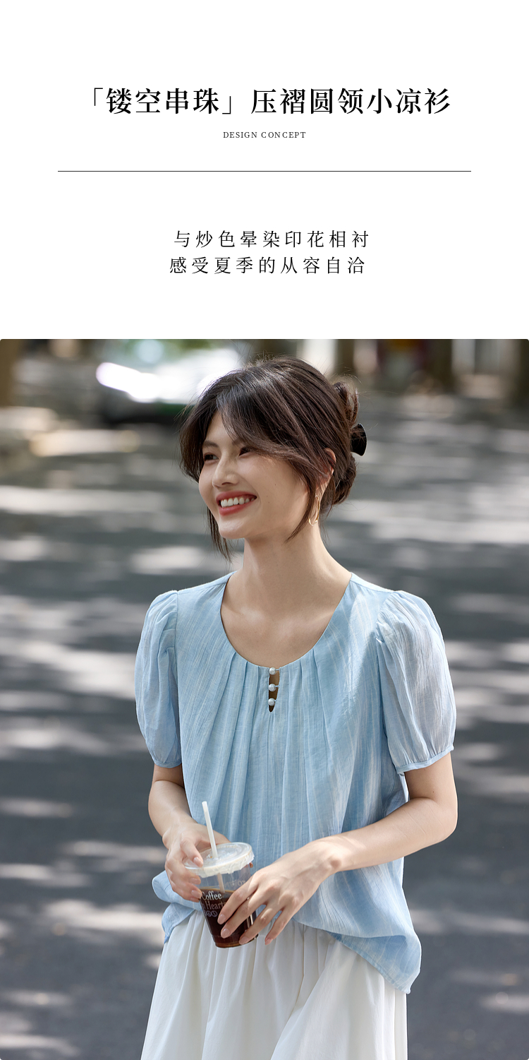 【08/06新品】熙世界法式串珠圆领衬衫女设计感别致压褶泡泡袖小衫2025夏季新款