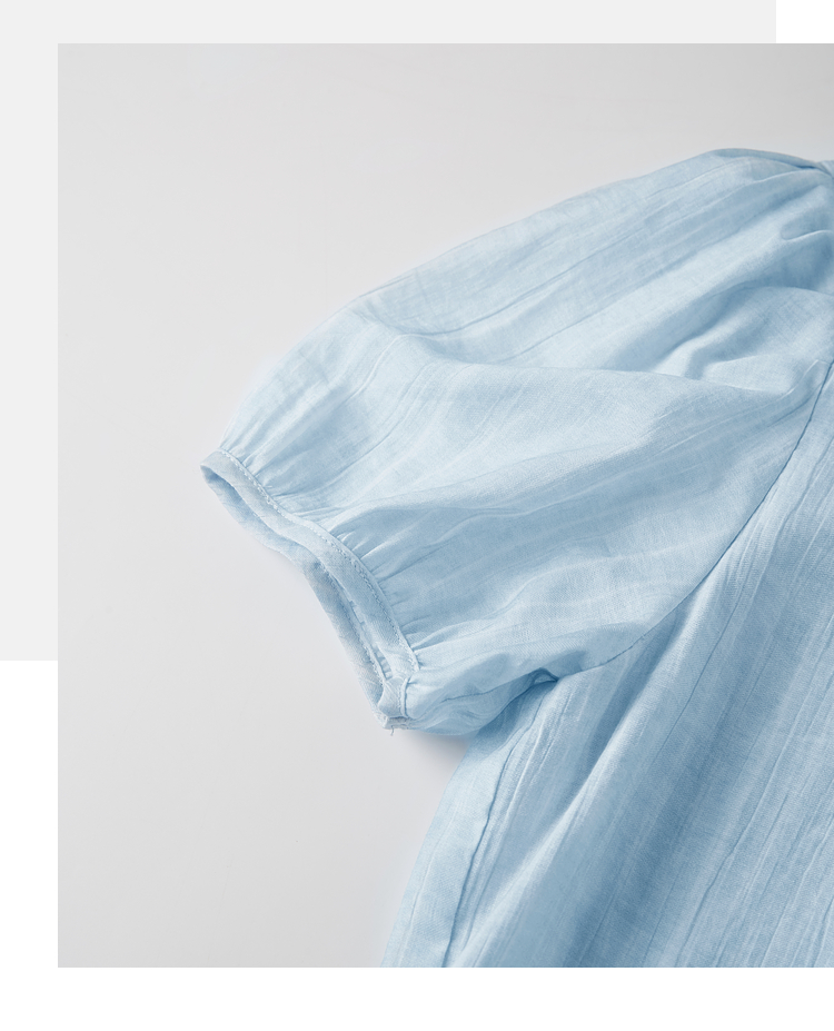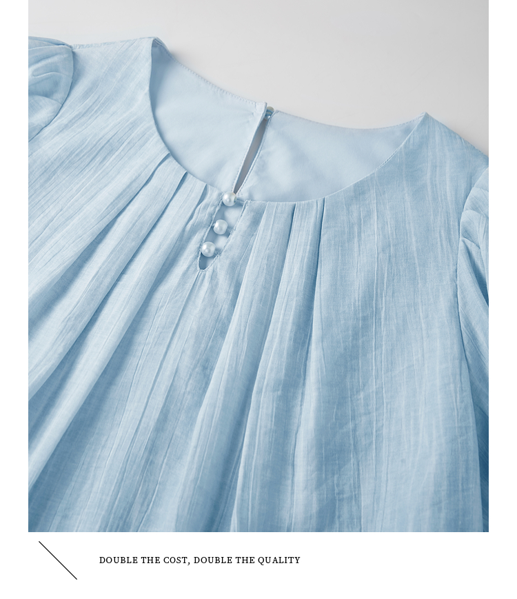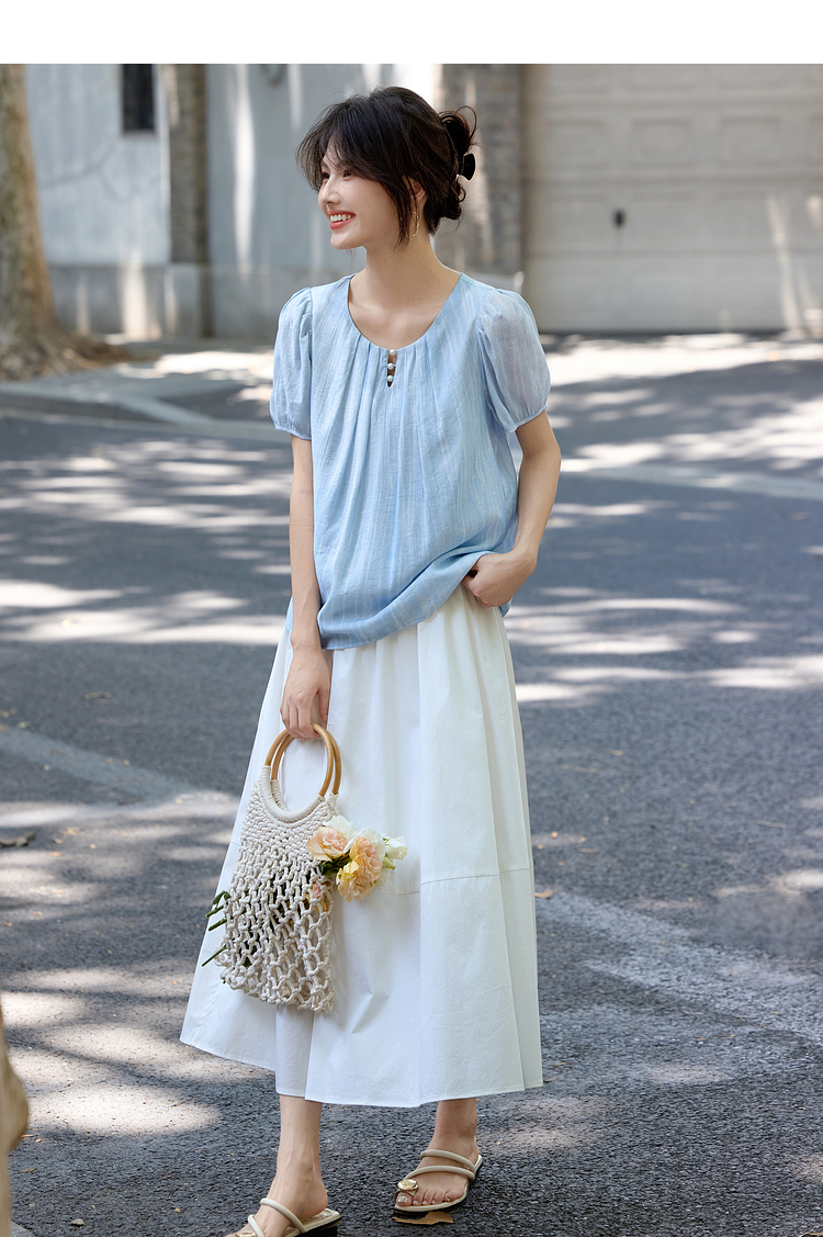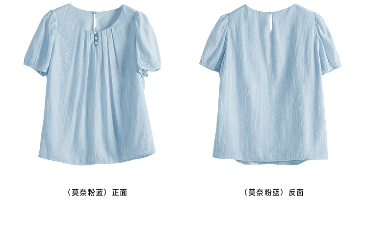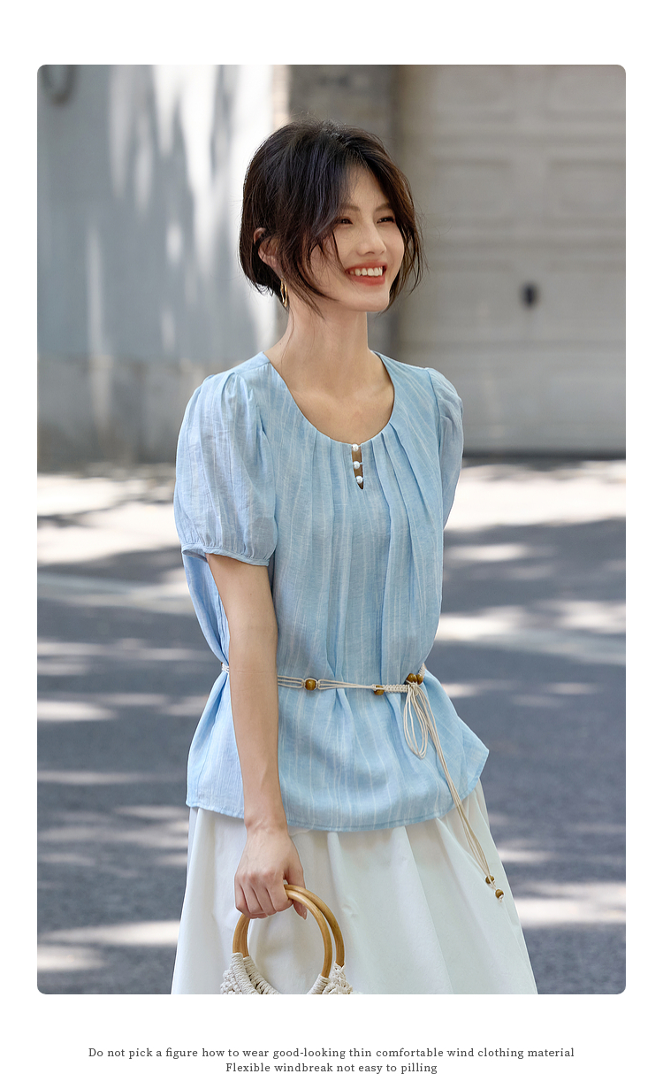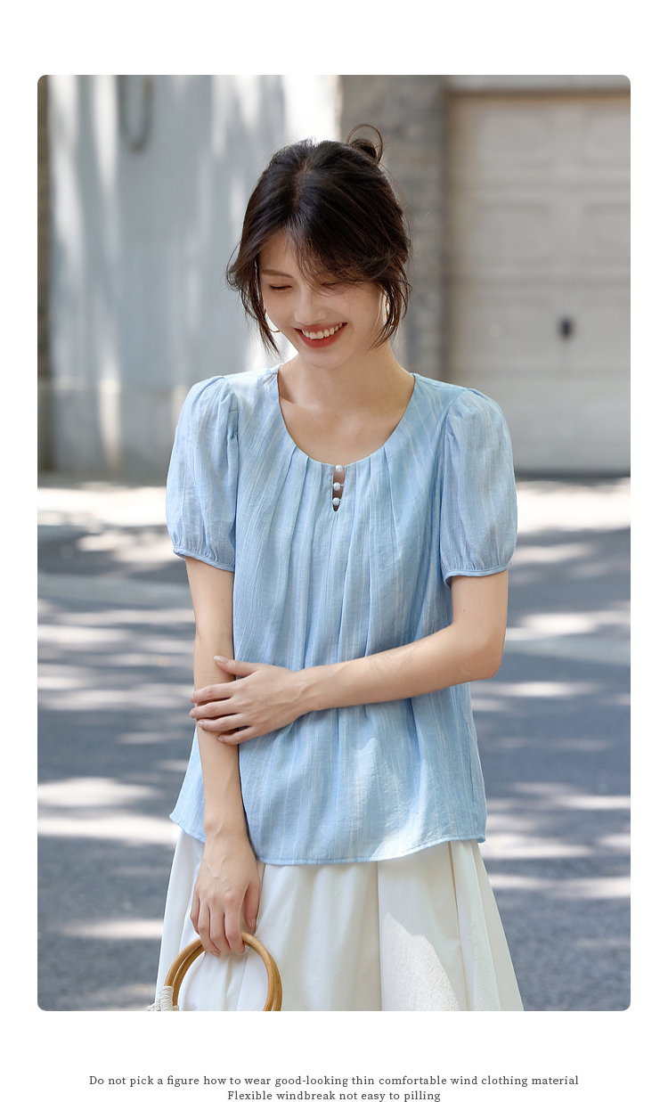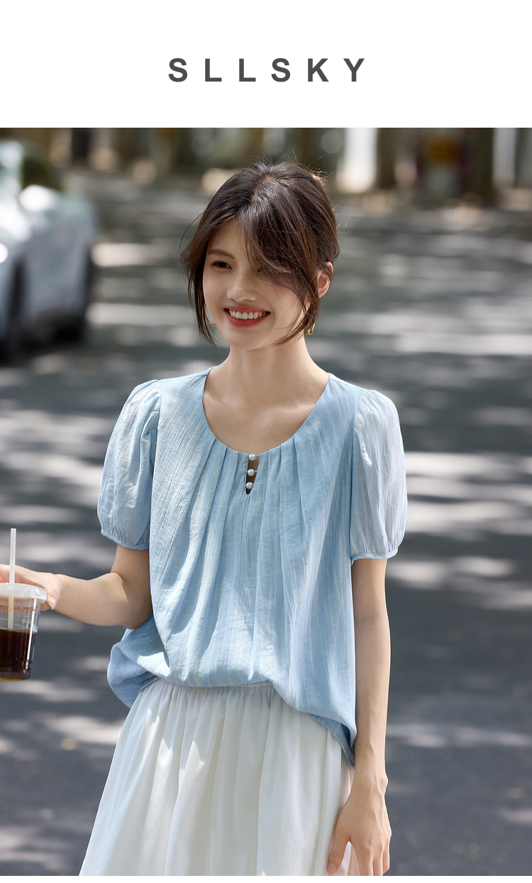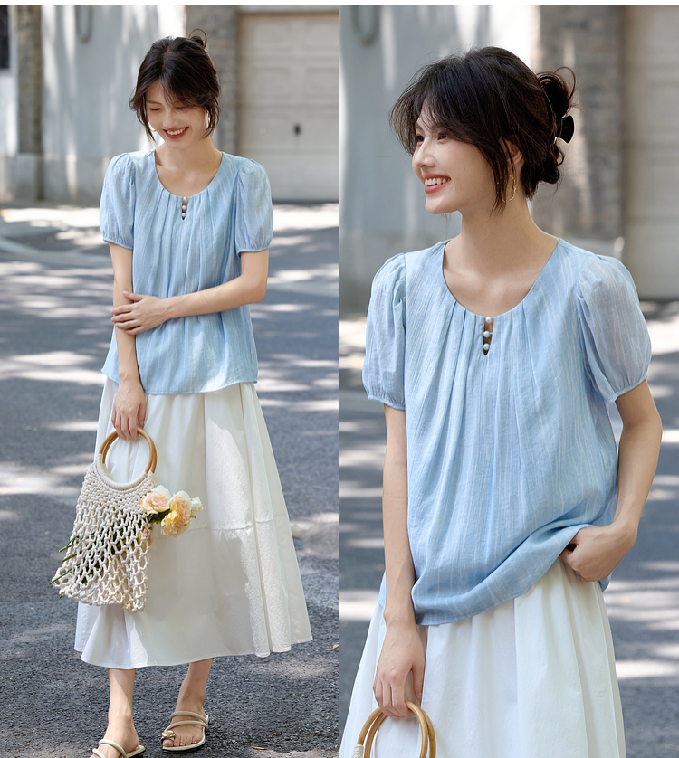 【08/06新品】熙世界法式串珠圆领衬衫女设计感别致压褶泡泡袖小衫2025夏季新款
