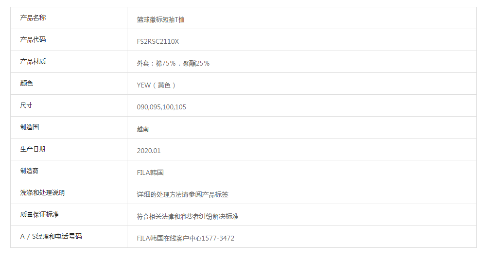 韩国F家斐乐韩国篮球系列宽松徽标短袖FS2RSC2110X_YEWJPY带授权招加盟代理