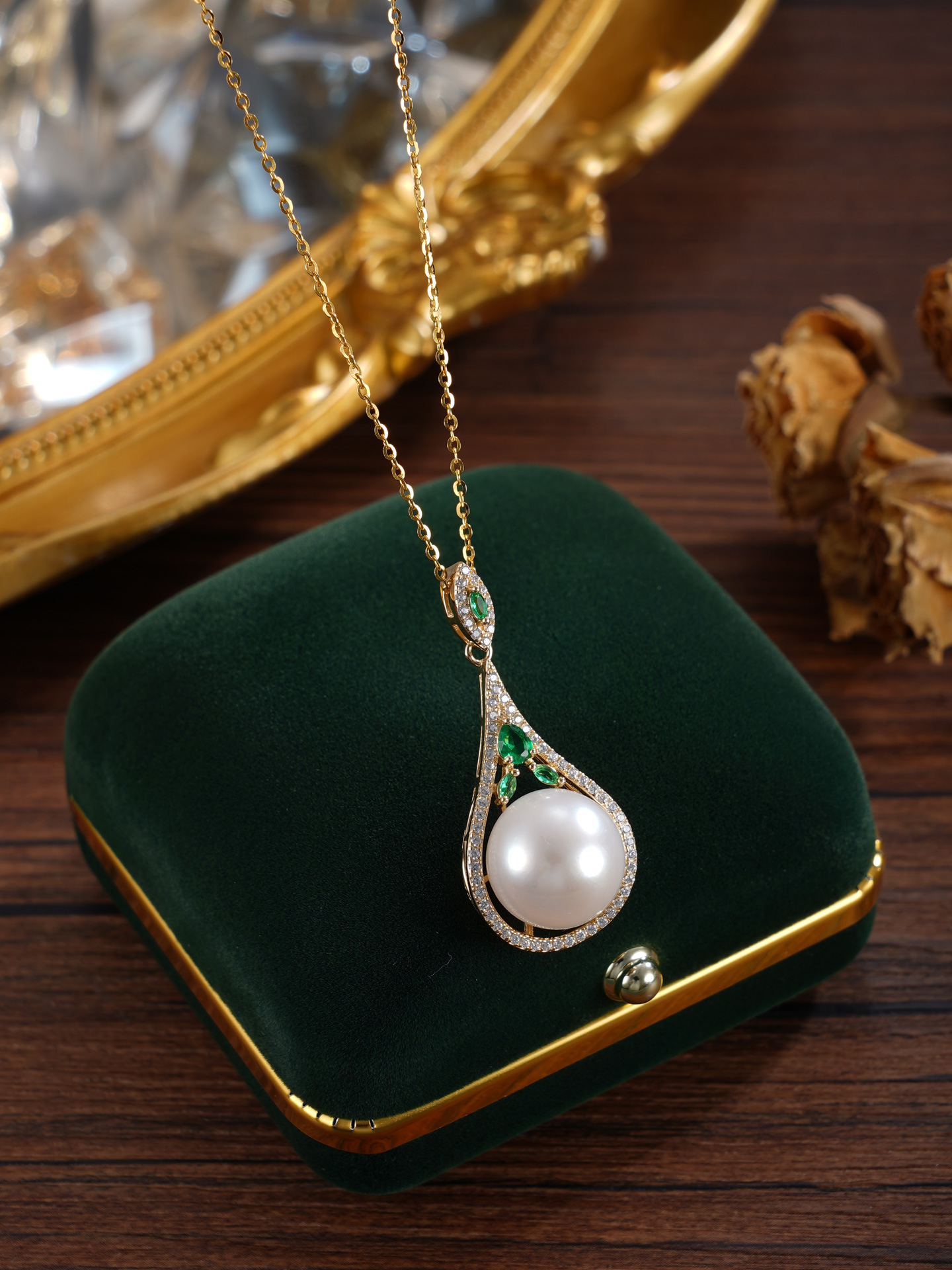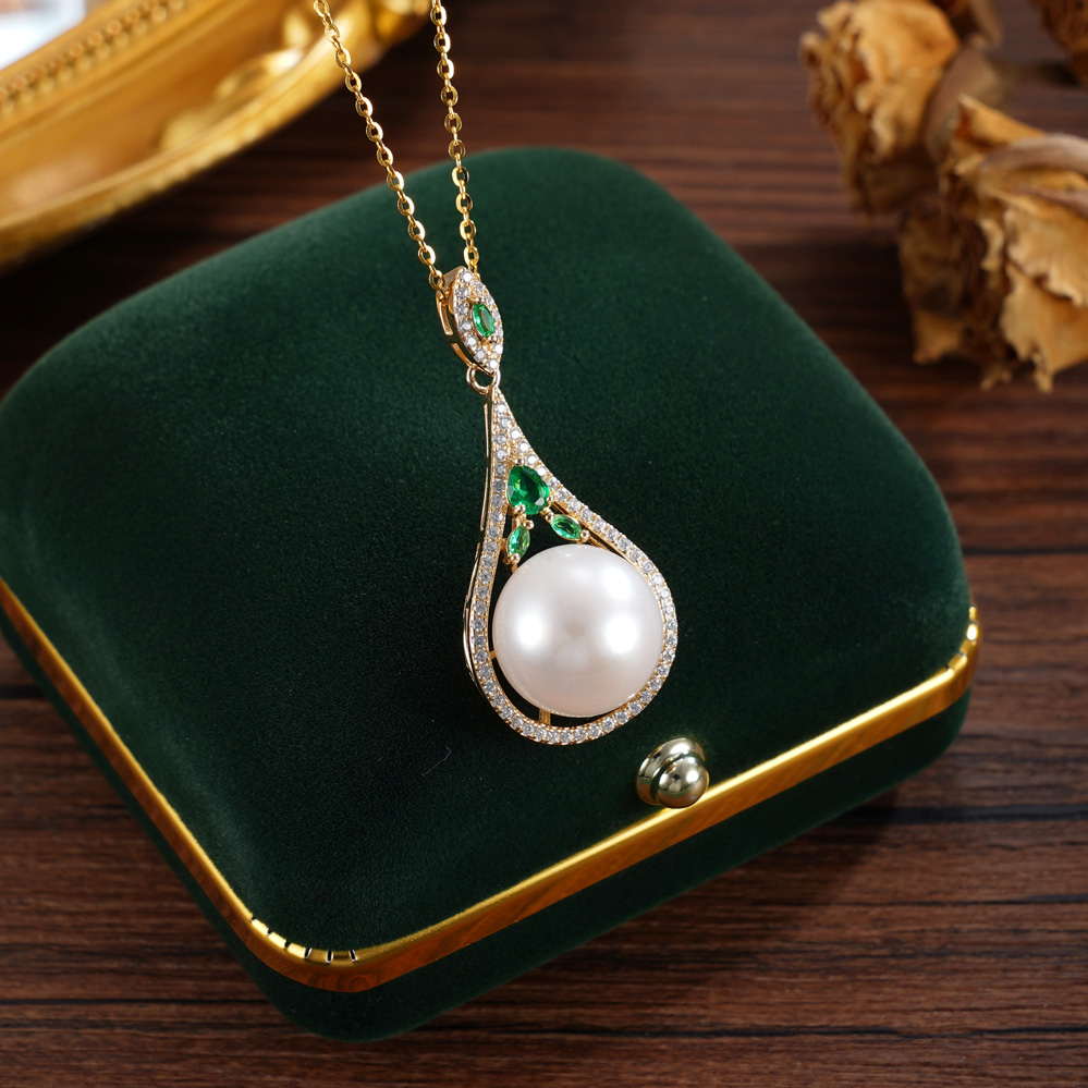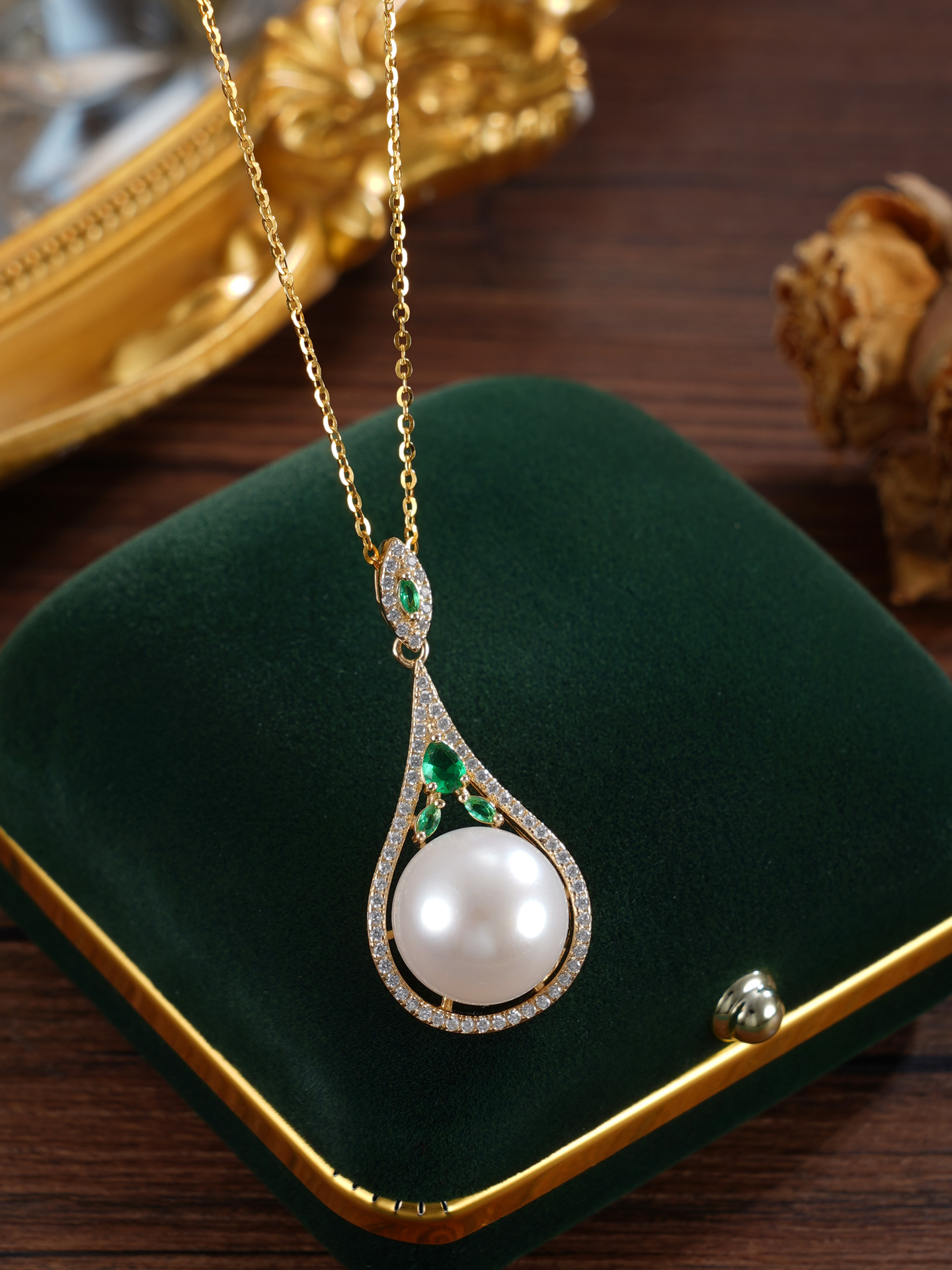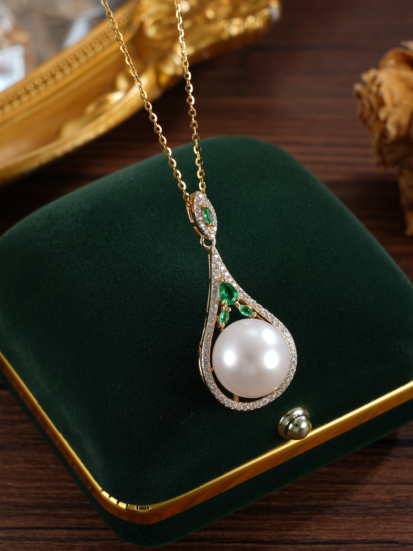 子佩集【恒久珍视】银S925珍珠惜王妃套链【P1926A】12.5mm珠绿点水滴镀金2601