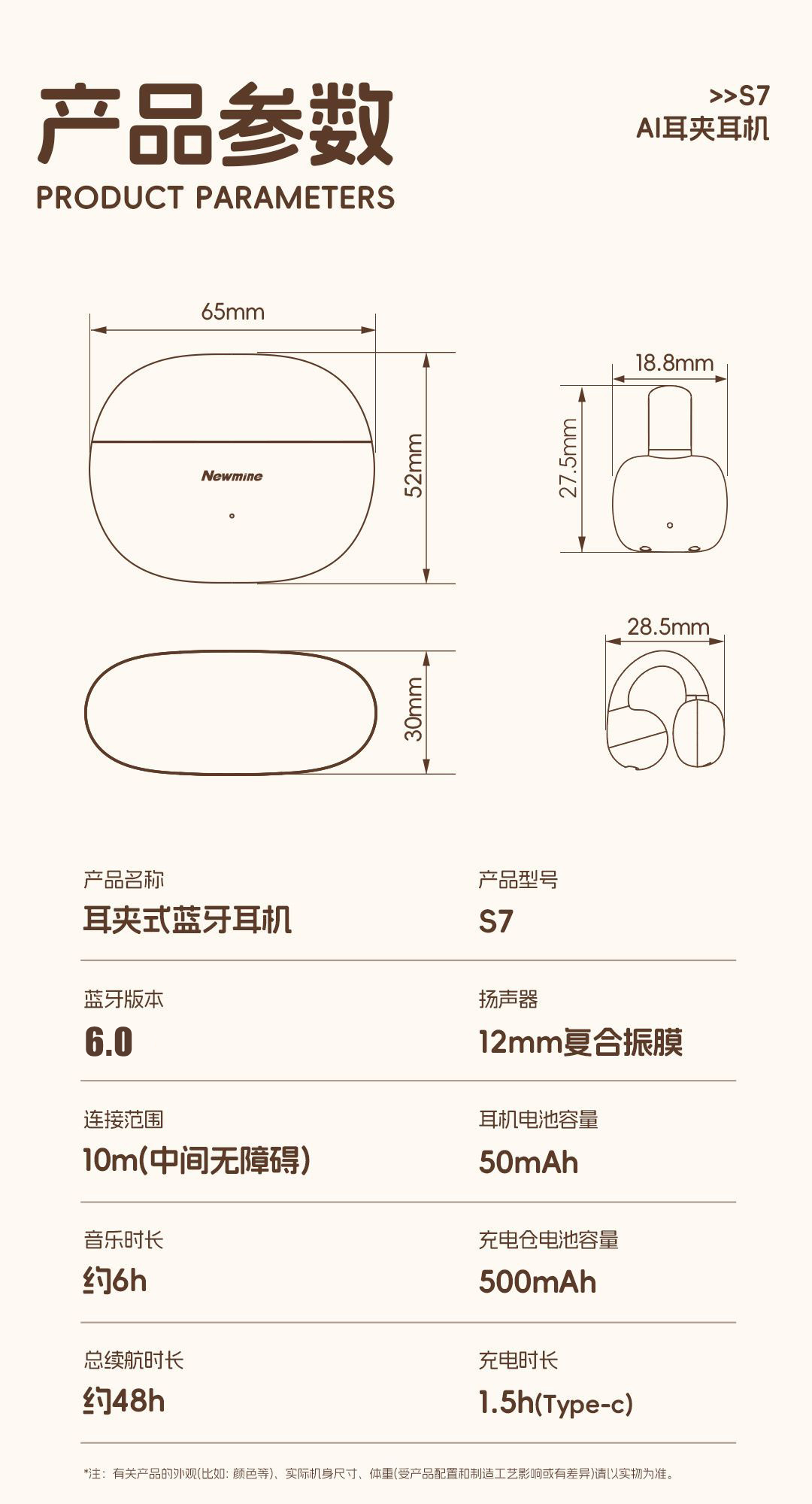 Newmine纽曼 S7 AI耳夹耳机,品牌直发!30年国货品牌纽曼音质保证,耳夹设计不入耳,摇晃不掉,可扫码验真伪【一年质保】