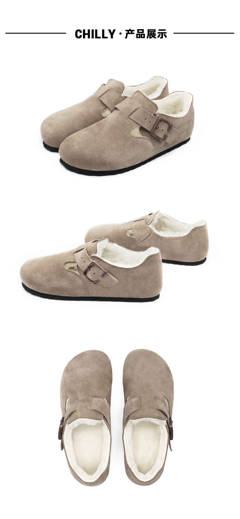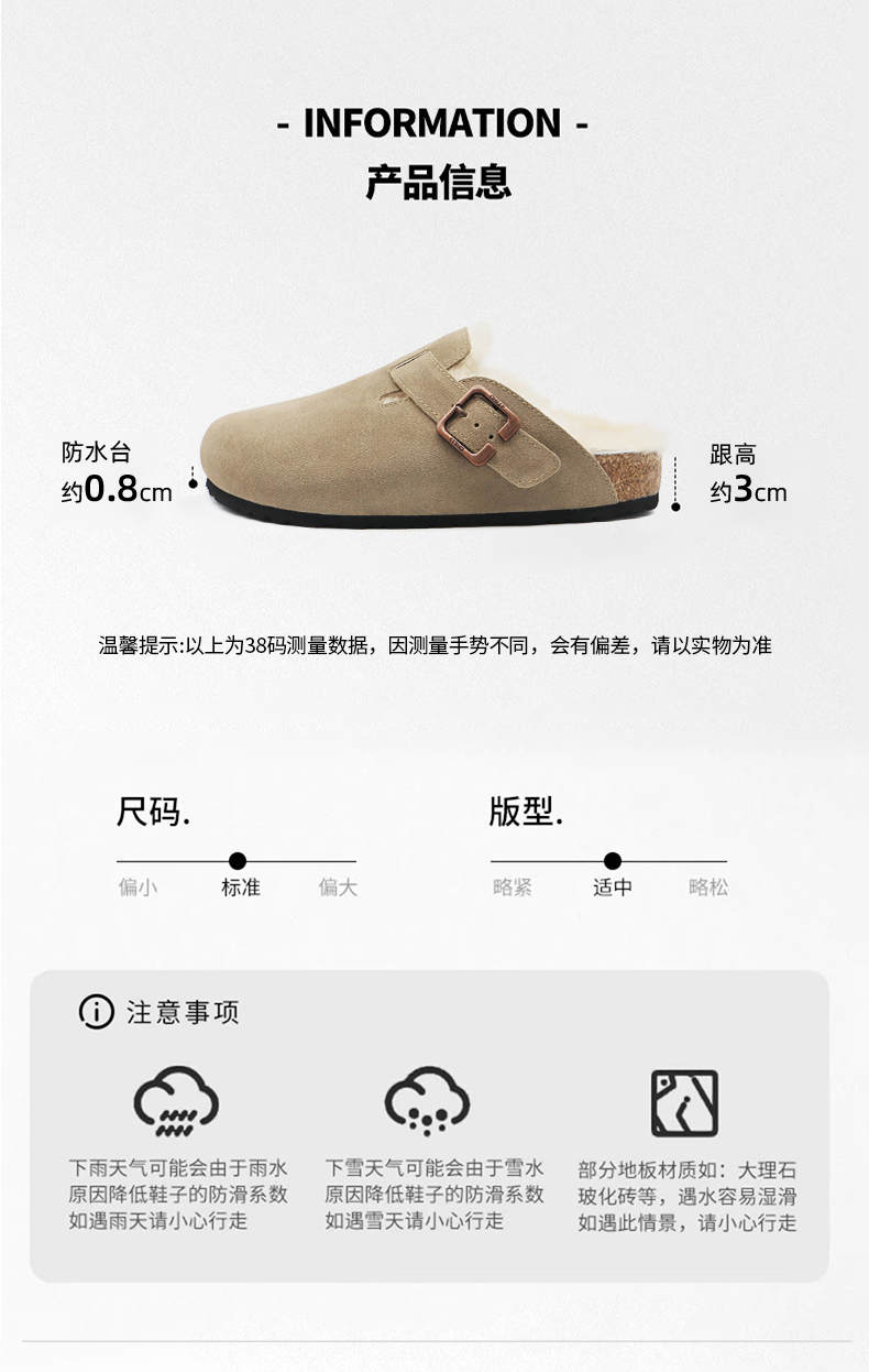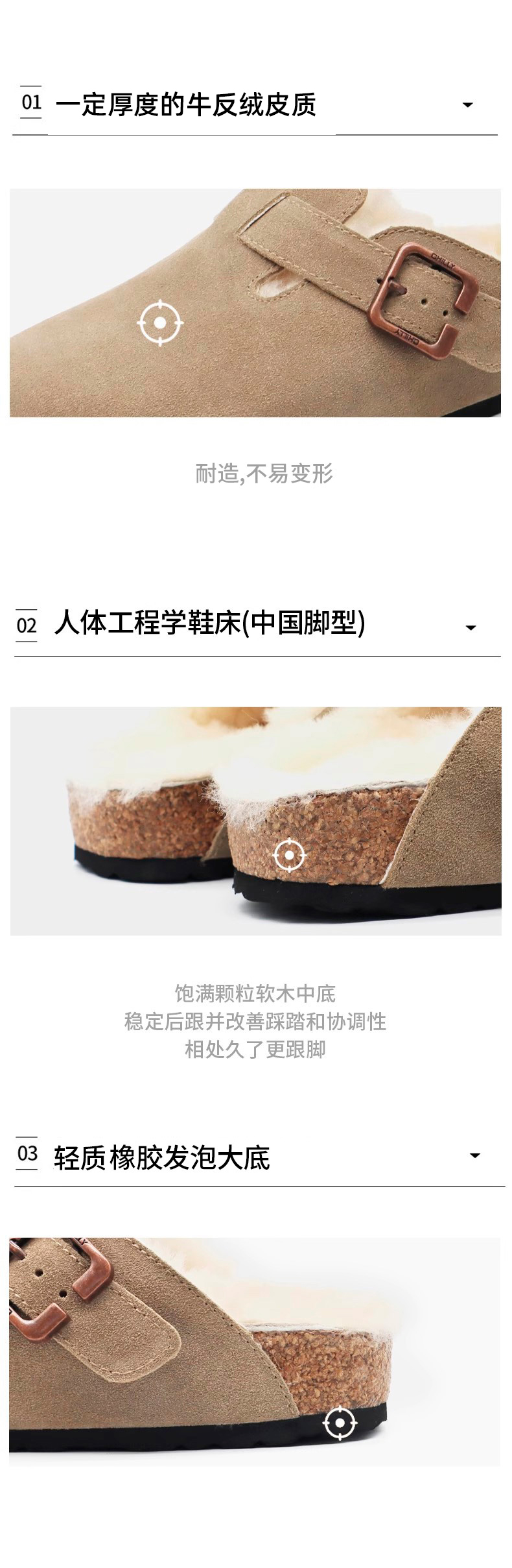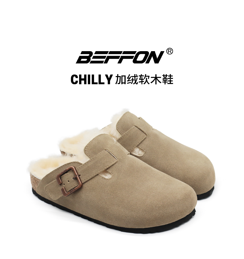 【云优选】BEFFON北风冬季软木博肯鞋,加绒保暖半拖包头鞋 真羊毛 厚牛皮 更健康