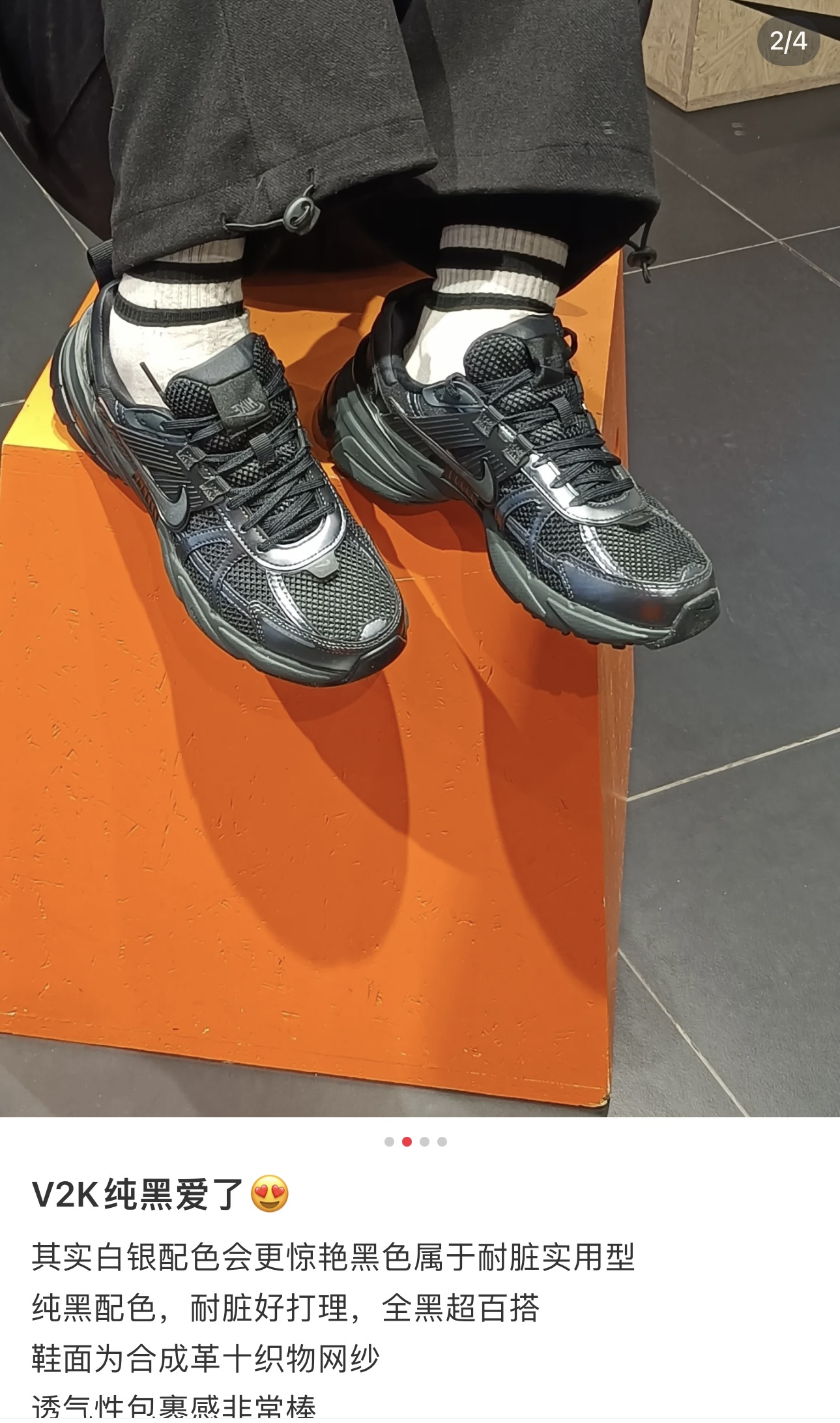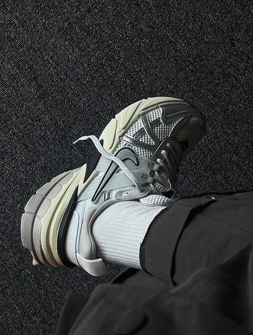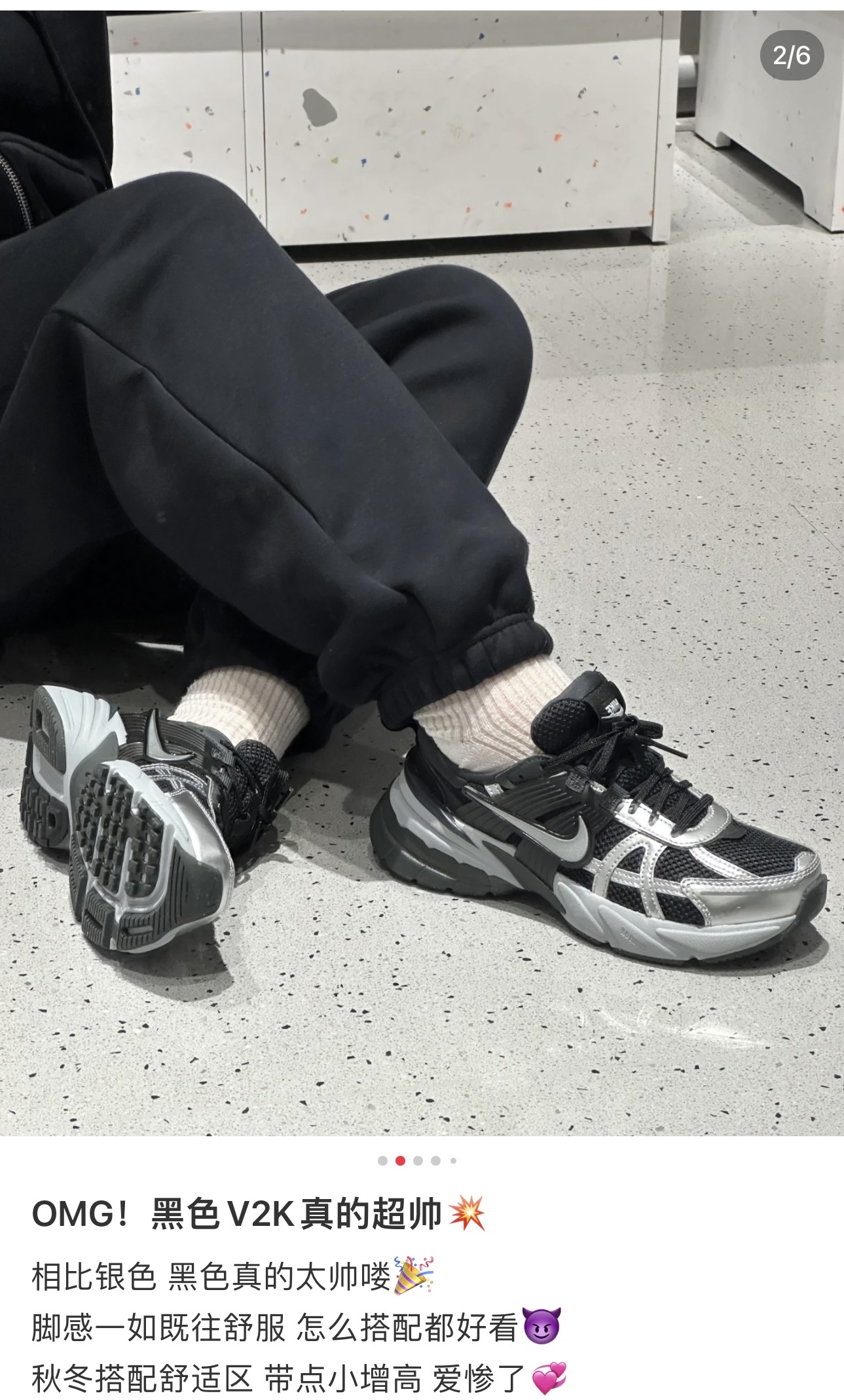 😎V2K Run黑银的设计简直长在我的审美点上。黑色的鞋面搭配银色的细节,如鞋带扣侧面的装饰条等,营造出一种神秘又高级的未来感,妥妥的赛博朋克风而且它的鞋型很有特点,复古的轮廓融合了现代的线条上脚后显得脚型特别好看,瞬间提升整体穿搭的时尚度感觉能陪我“征战”好久。