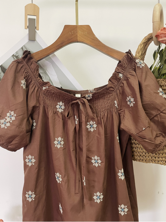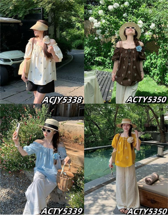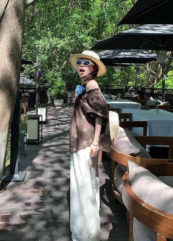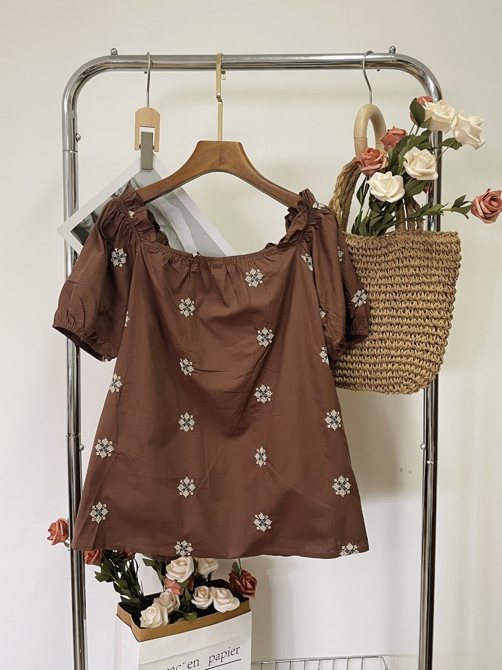 第一款:焦格玛奇”夏季泡泡短袖刺绣一字肩娃娃小衫ACTY5350 琥珀棕很有异域风情 三种不同色不同花型的刺绣面料 深浅交织制作的撞色刺绣彩色花朵 放在黑底上有种更明媚热烈的氛围 一如既往的精致!! 娃娃衫版型太懂藏肉哲学 宽松又不膨胀的下摆更是显瘦的小心机~ 还做了两个颜色:棕色和黄色