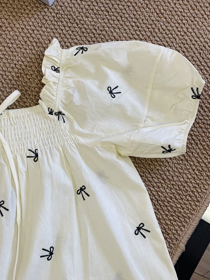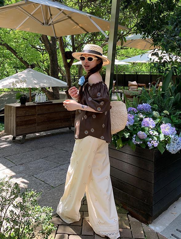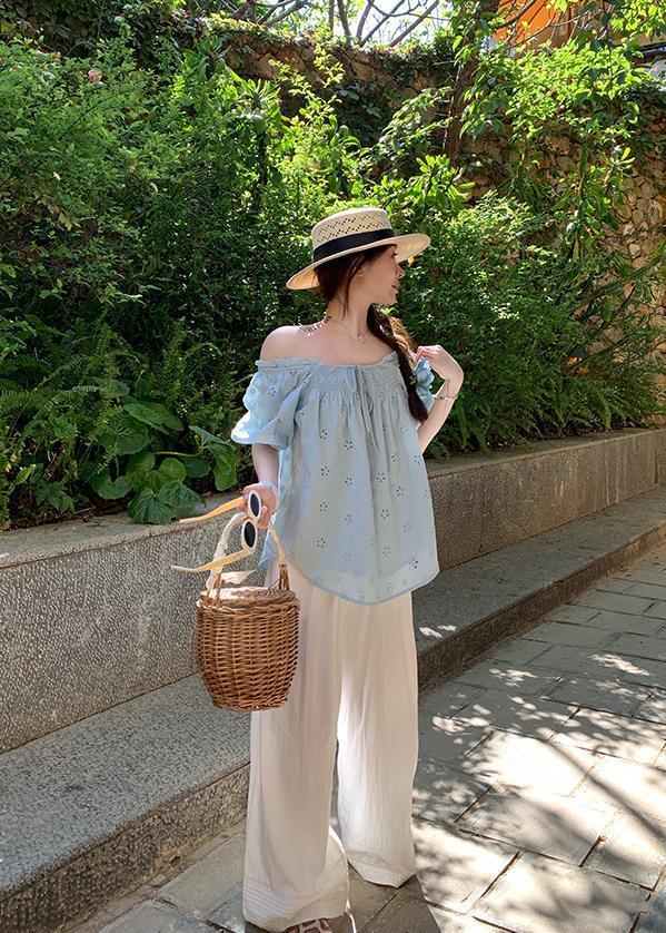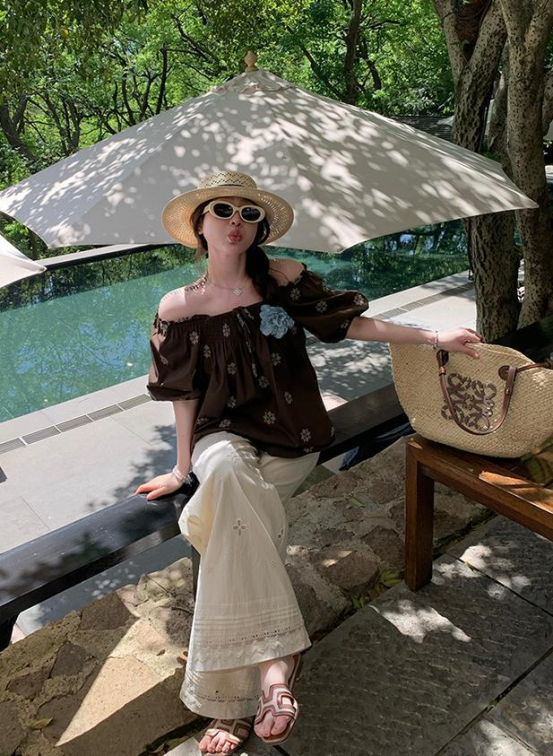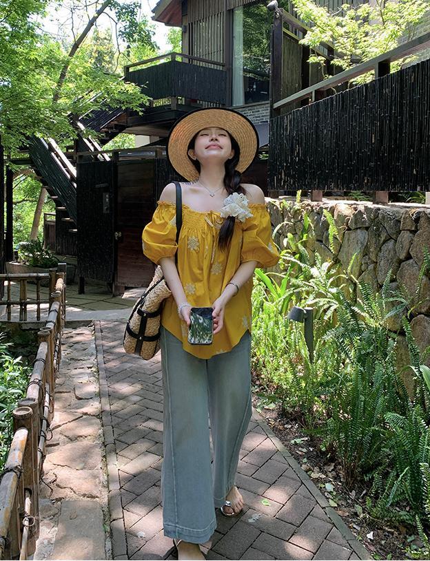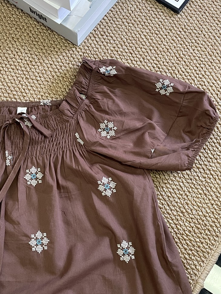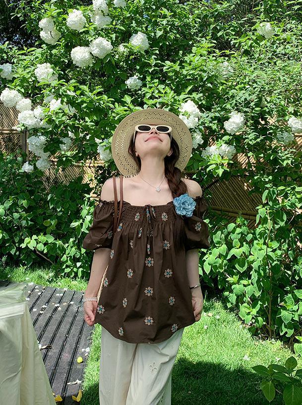 ✅精致刺绣绝美!衬气质的效果一流 ✅一字肩可两穿设计搭配抽绳展现优美脖颈线条,轻松撑起整体筋骨 ✅领口拼接木耳边增加穿搭层次感,灯笼袖口的松散状态反衬手臂纤细