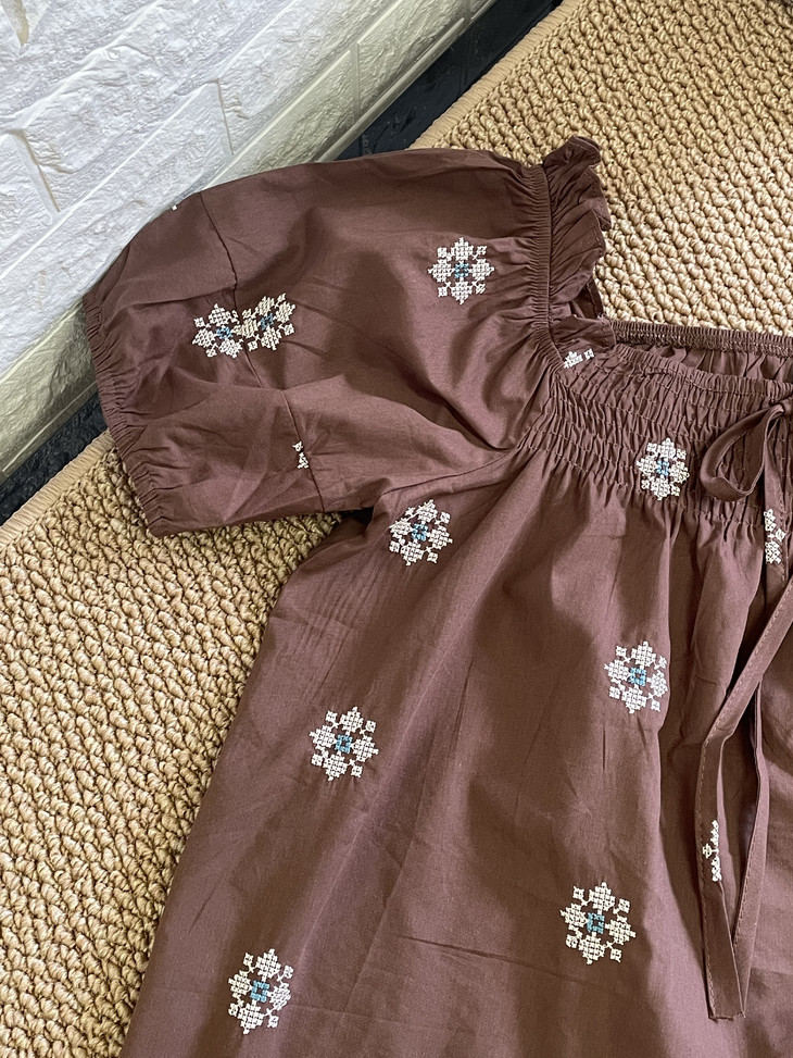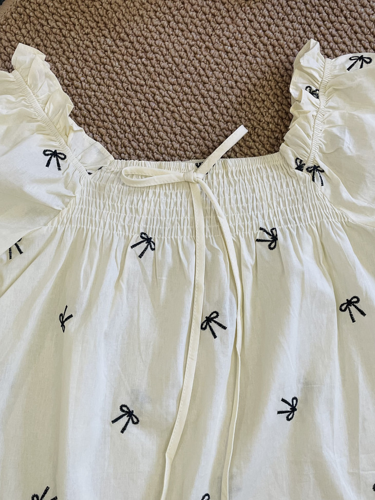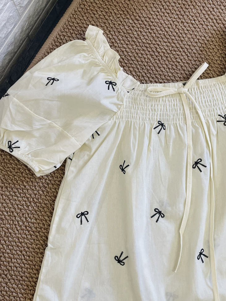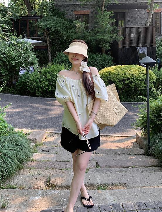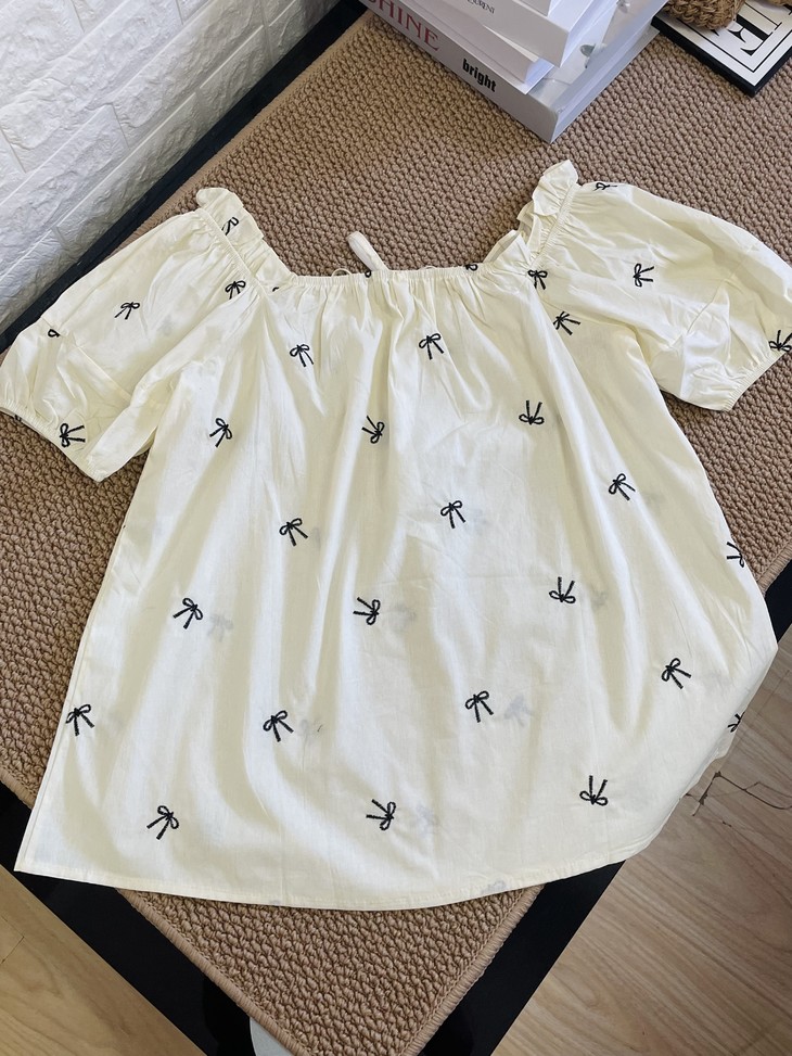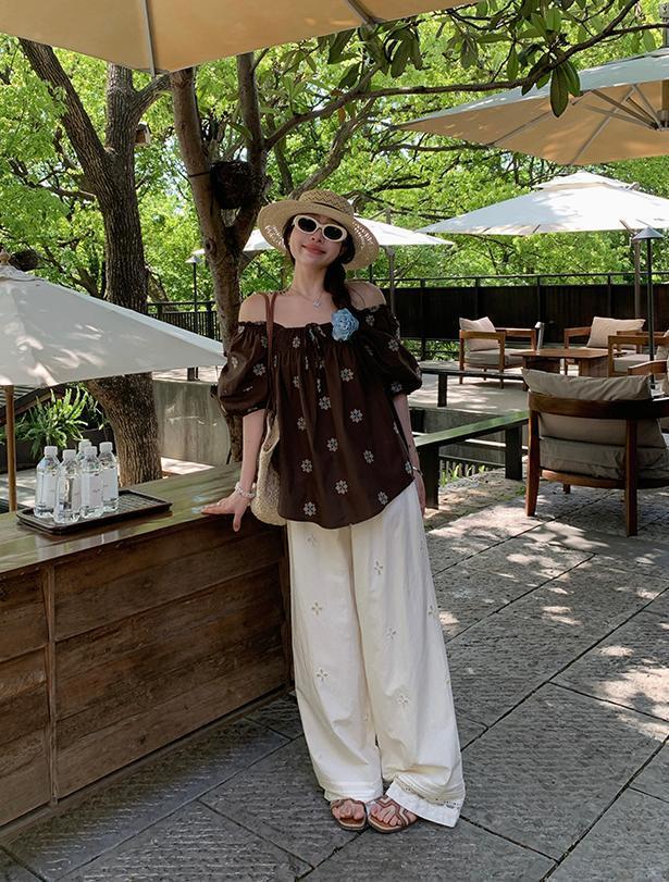 ✅精致刺绣绝美!衬气质的效果一流 ✅一字肩可两穿设计搭配抽绳展现优美脖颈线条,轻松撑起整体筋骨 ✅领口拼接木耳边增加穿搭层次感,灯笼袖口的松散状态反衬手臂纤细