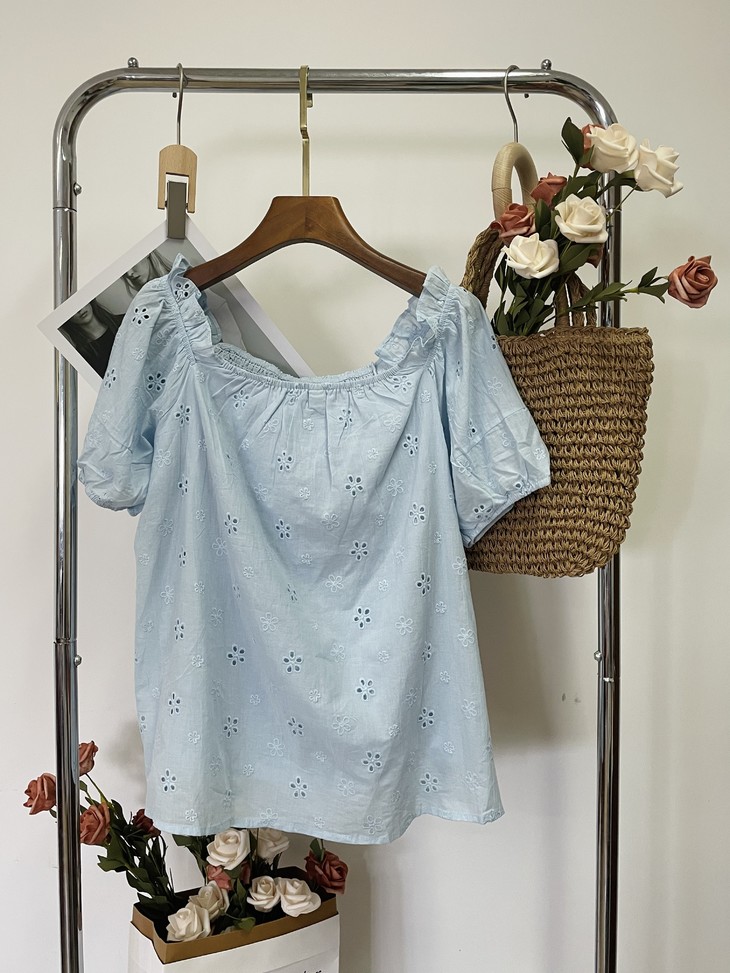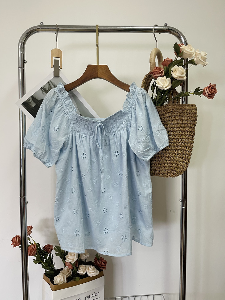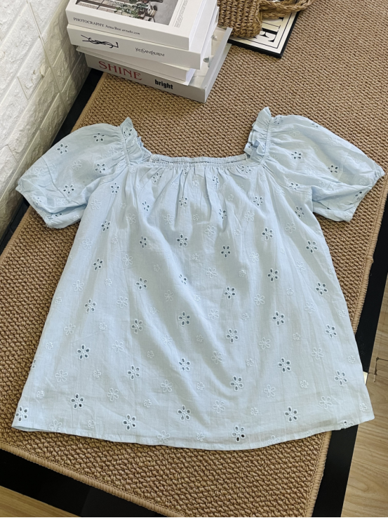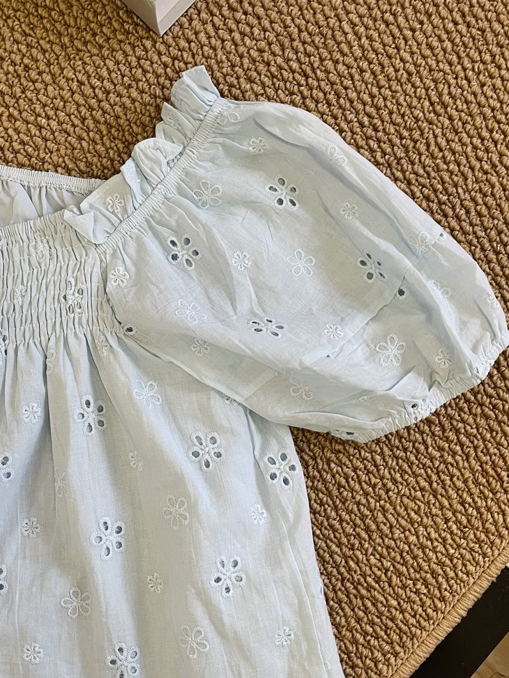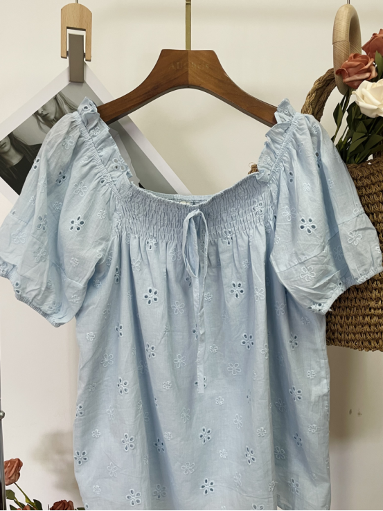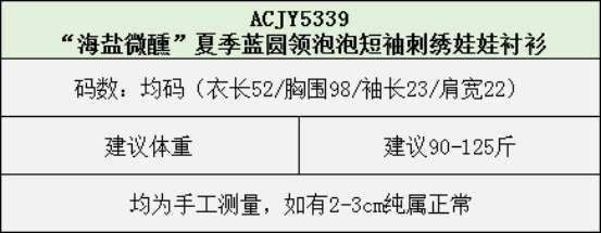 第二款:海盐微醺”夏季蓝圆领泡泡短袖刺绣娃娃衬衫ACTY5339 蓝色清新又显白 仿佛拥揽一袭春夏的浪漫与法式风情 精选纯棉面料,轻薄透气 夏日穿搭也能畅享舒爽 搭配重工镂空刺绣,于细节处彰显精致奢华 它以独特的设计,带来强烈视觉冲击力 层次感十足,让你轻松成为时尚焦点