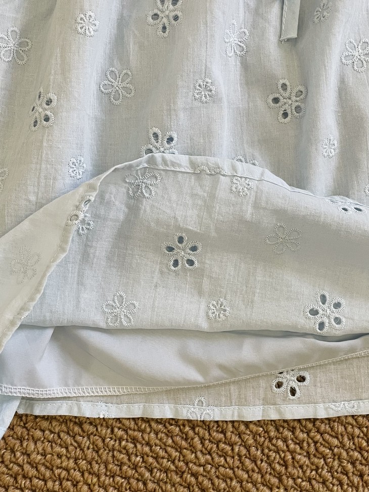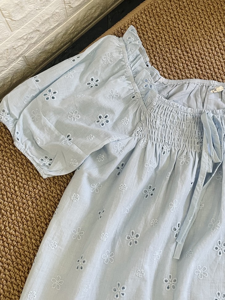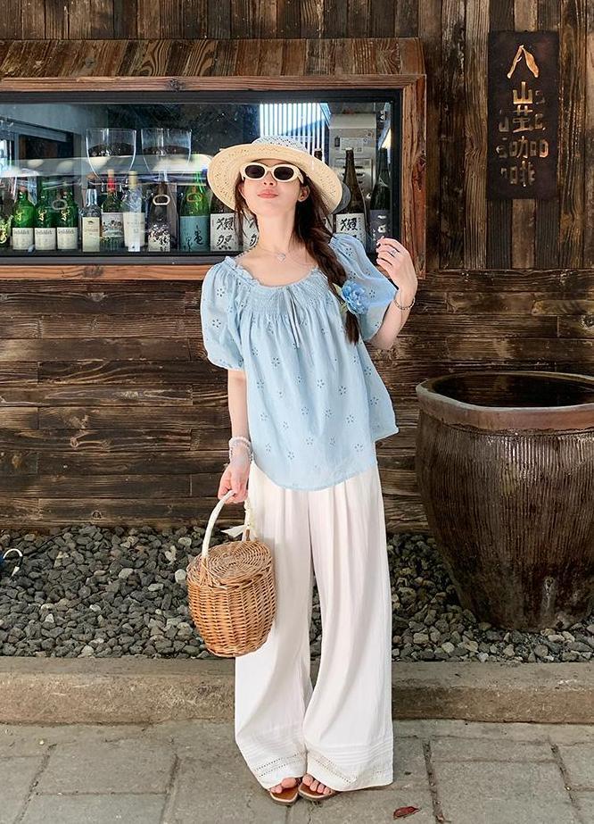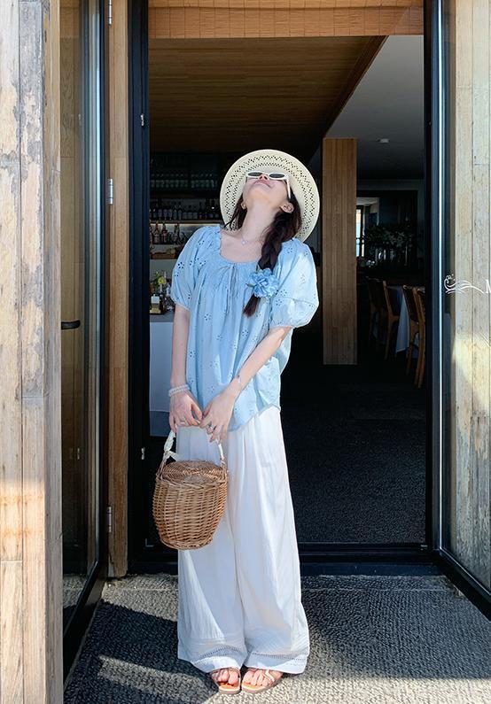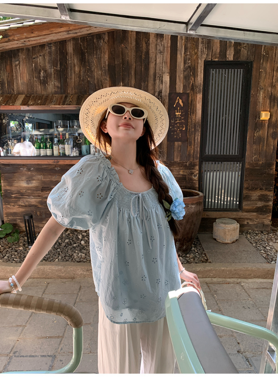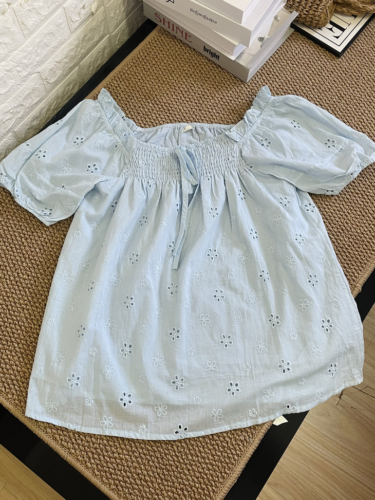 第二款:海盐微醺”夏季蓝圆领泡泡短袖刺绣娃娃衬衫ACTY5339 蓝色清新又显白 仿佛拥揽一袭春夏的浪漫与法式风情 精选纯棉面料,轻薄透气 夏日穿搭也能畅享舒爽 搭配重工镂空刺绣,于细节处彰显精致奢华 它以独特的设计,带来强烈视觉冲击力 层次感十足,让你轻松成为时尚焦点